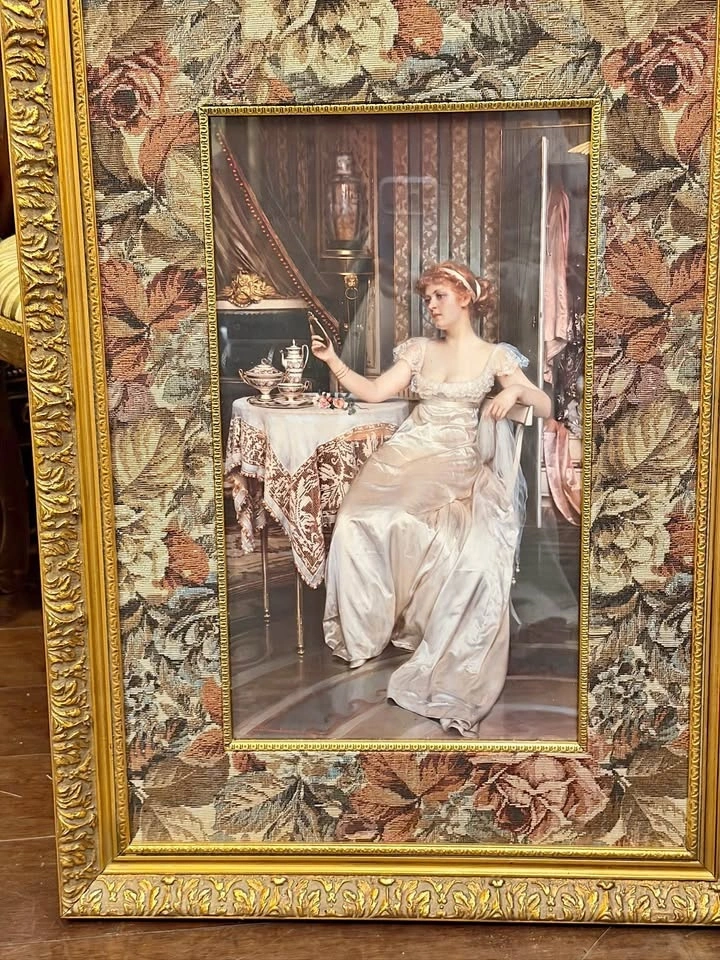 Elegant period portrait depicting a seated lady in a flowing ivory gown, rendered in soft, classical tones. Presented with a richly patterned tapestry-style mat and ornate gold-toned frame. Refined decorative piece with light, age-appropriate wear to the frame and matting.