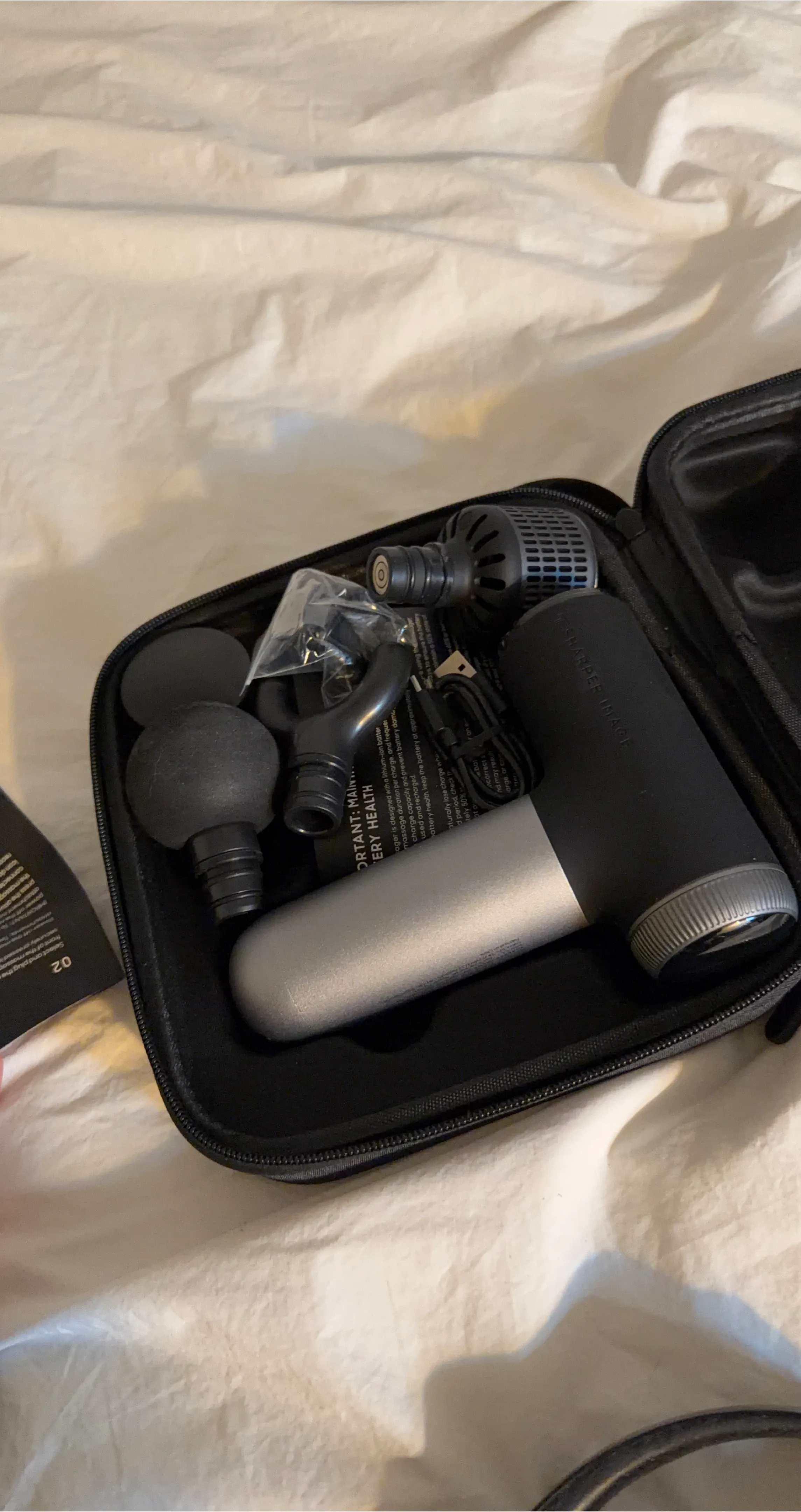 Selling a Sharper Image massage gun that comes with its original case and various attachments. It's great for relieving muscle tension and soreness. The case keeps everything organized and protected, making it easy to take with you on the go!