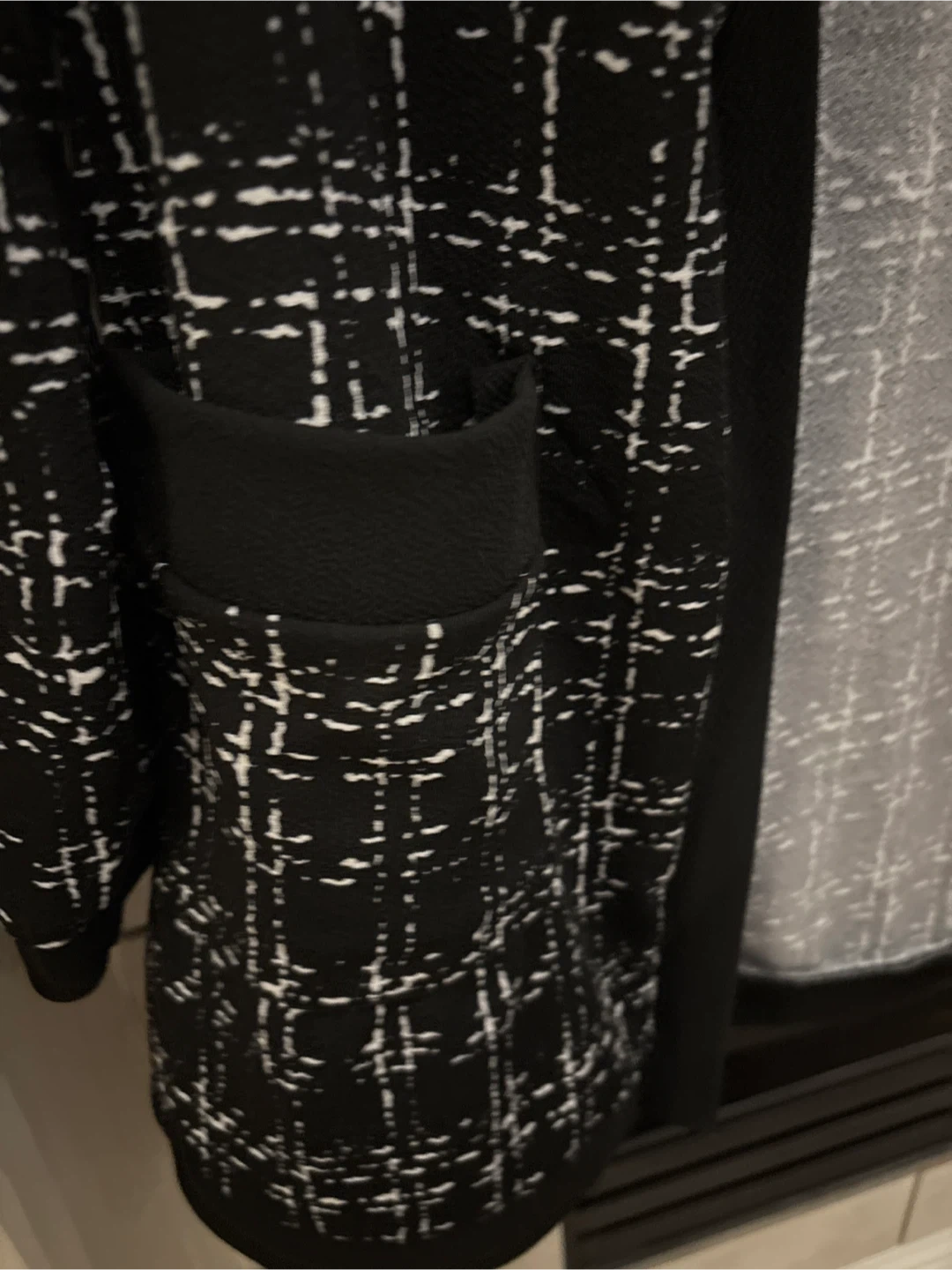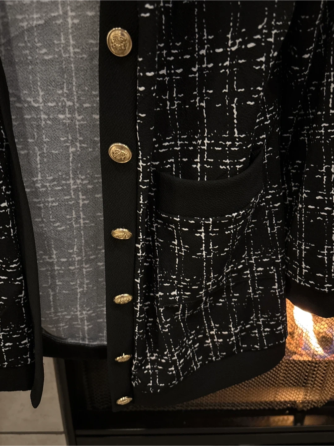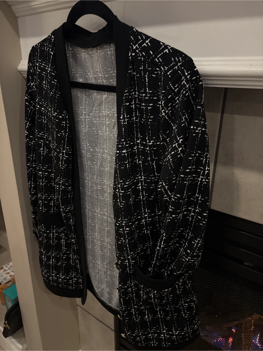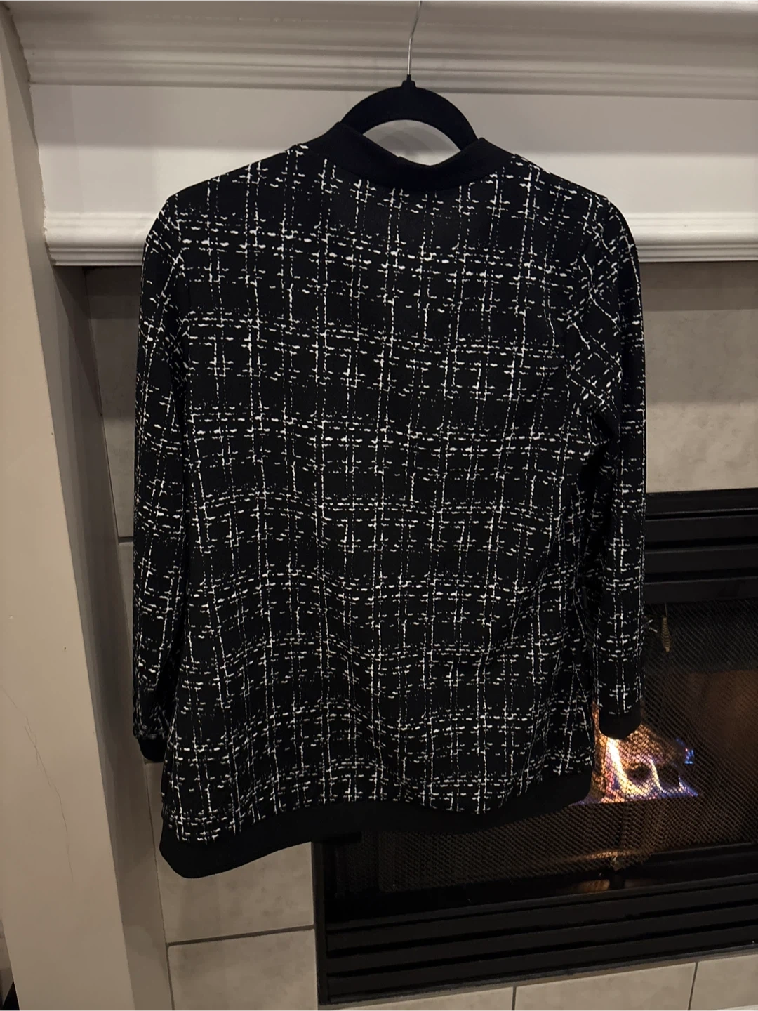 Selling a black and white tweed cardigan. It features gold buttons and pockets. Perfect for layering or wearing on its own!