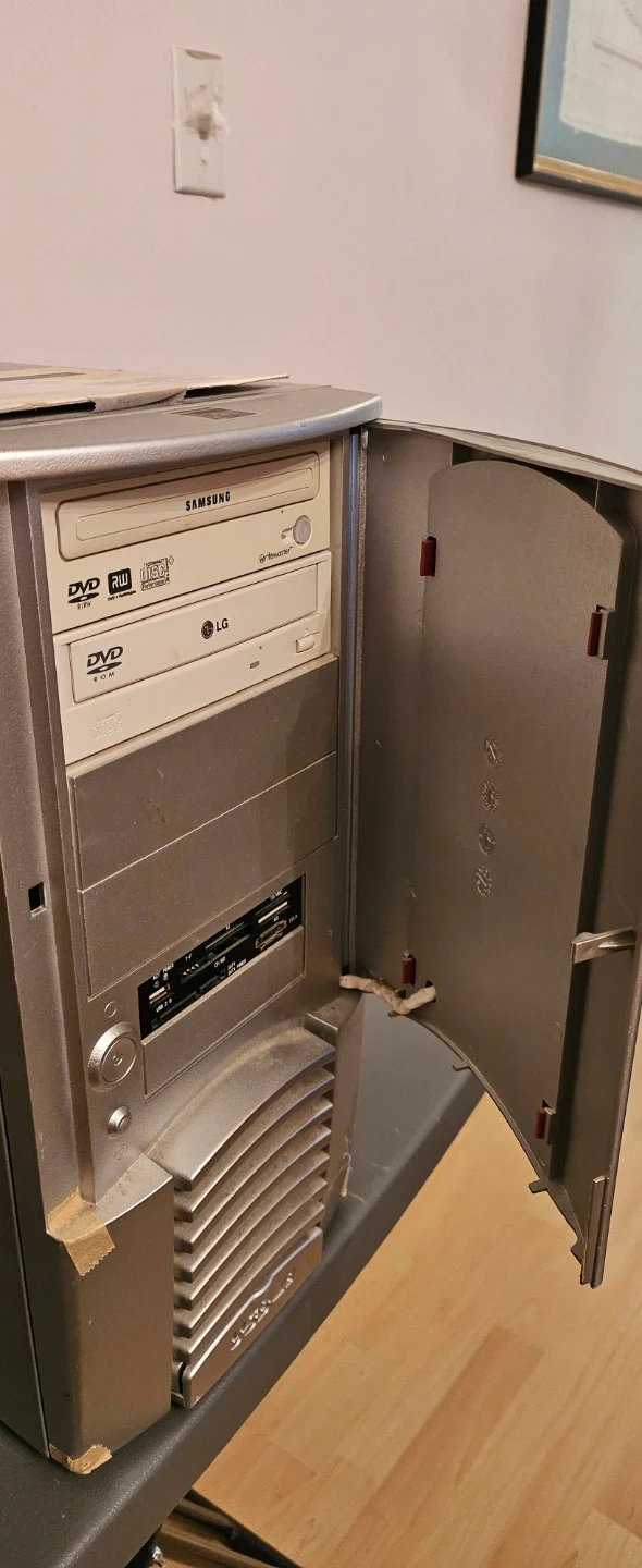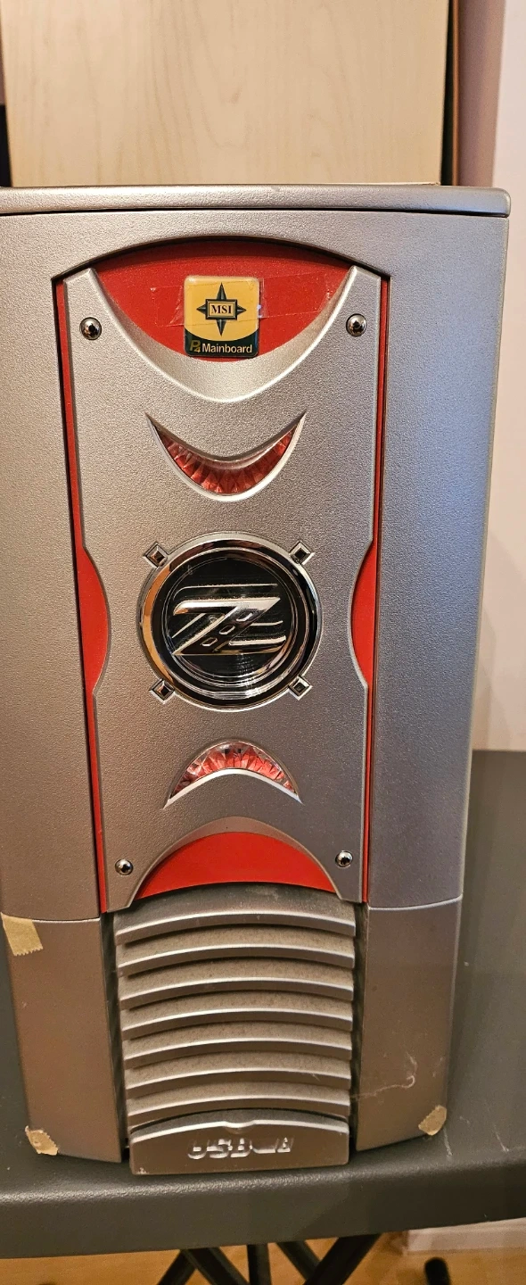 Selling a custom-built gaming PC. It features an MSI Mainboard and a Sapphire GPU. It also has a Samsung DVD RW and an LG DVD drive. The case is silver and has a unique design on the front panel. It's in used condition.