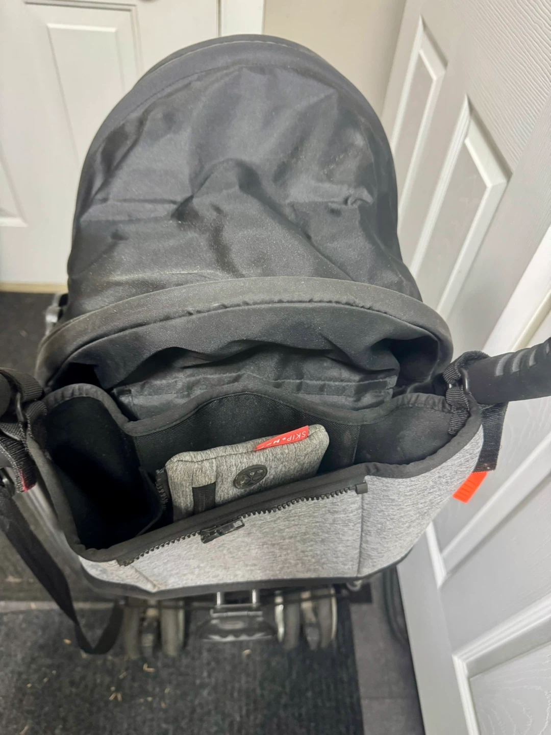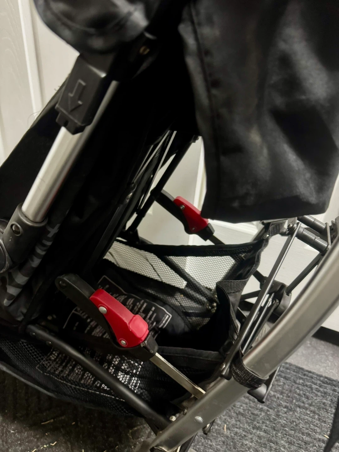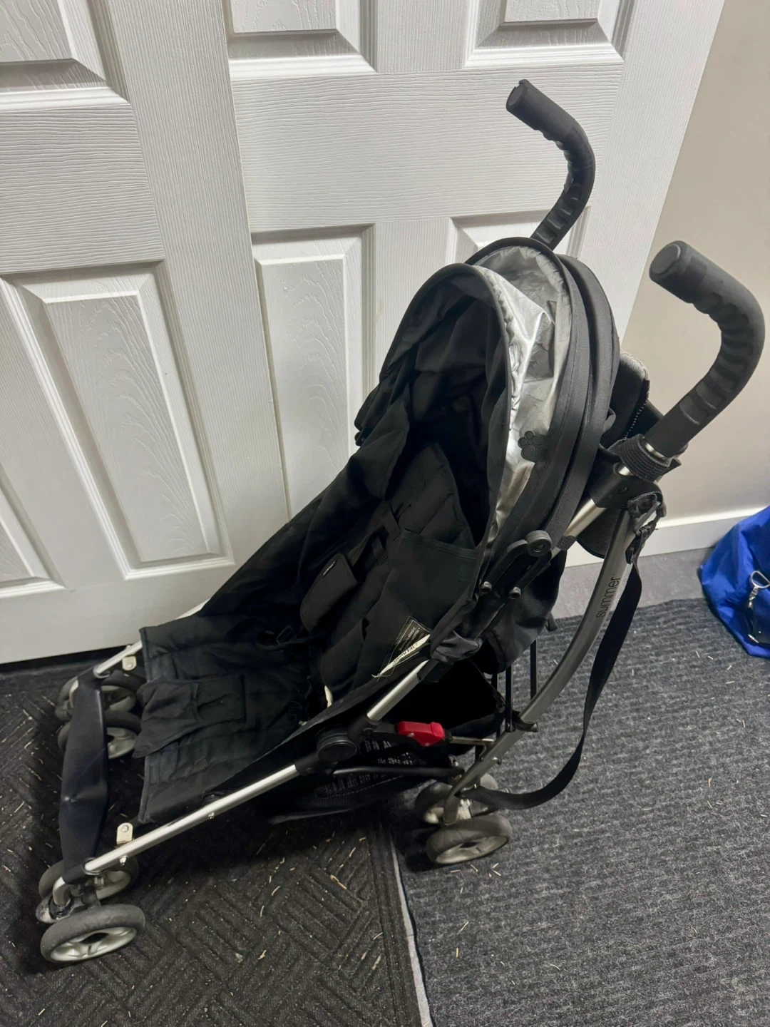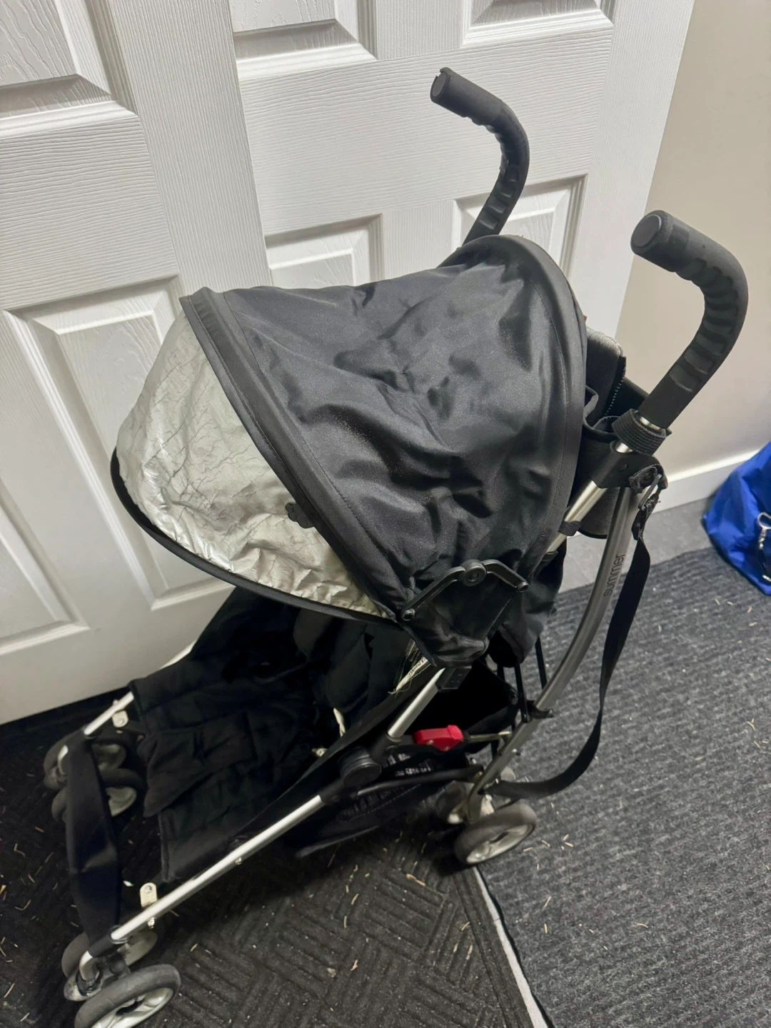 Great travel stroller that easily folds and can be carried with attached strap. Lightweight, reclines, and comes with a storage pouch for drinks and personal items. Tape on one of the handles to cover a tear (shown in photo).