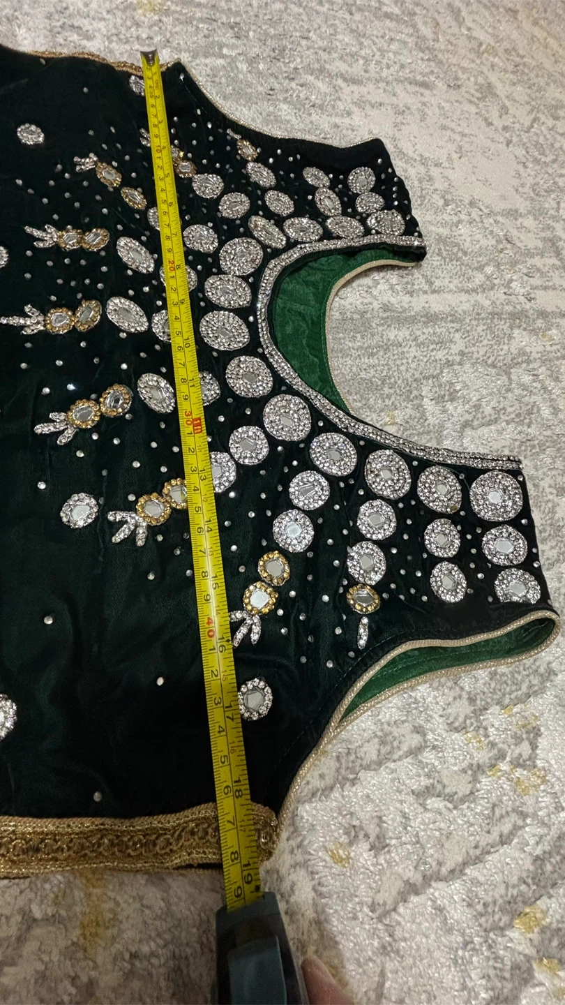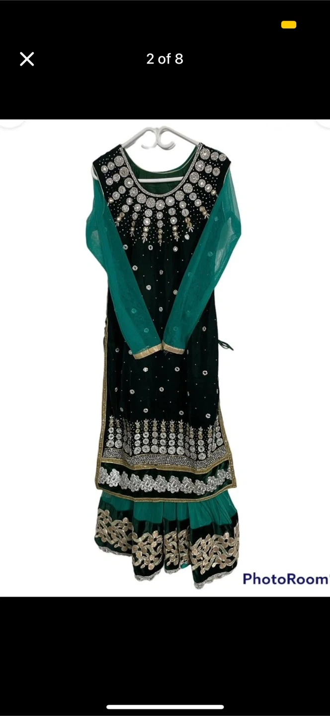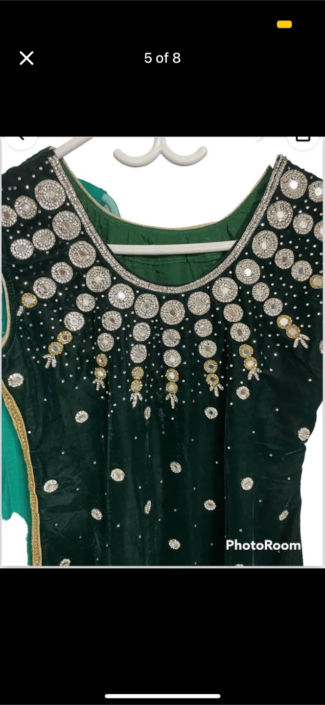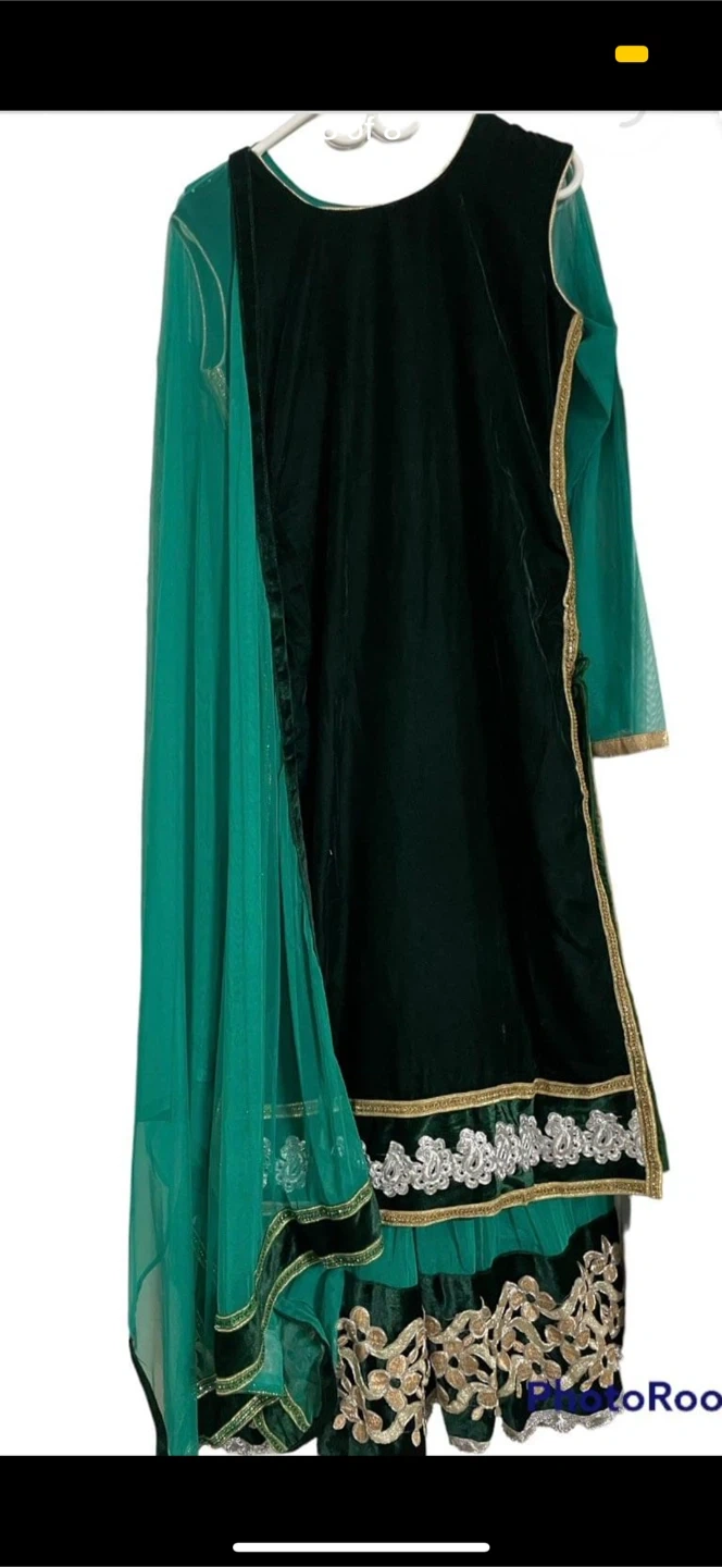 Selling a beautiful green salwar kameez! It features intricate embroidery and a lovely design. Perfect for special occasions or adding a touch of elegance to your wardrobe. The long sleeve, comes in the bottom and the dark green comes on top. U can wear it in tow different ways. Either with only pant and light green dress ( the long sleeve one), or only pant and the sleeveless one.Both ways will make u a look beautiful.
