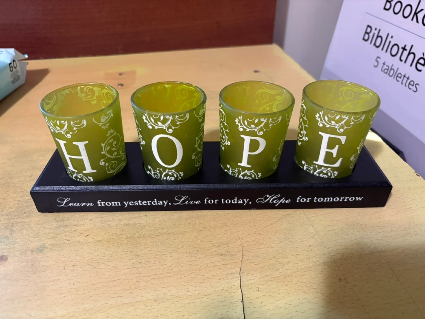 A cute candle holder that spells out HOPE! The base has the words "Learn from yesterday, Live for today, Hope for tomorrow" written on it. Perfect for adding a little light and inspiration to any room