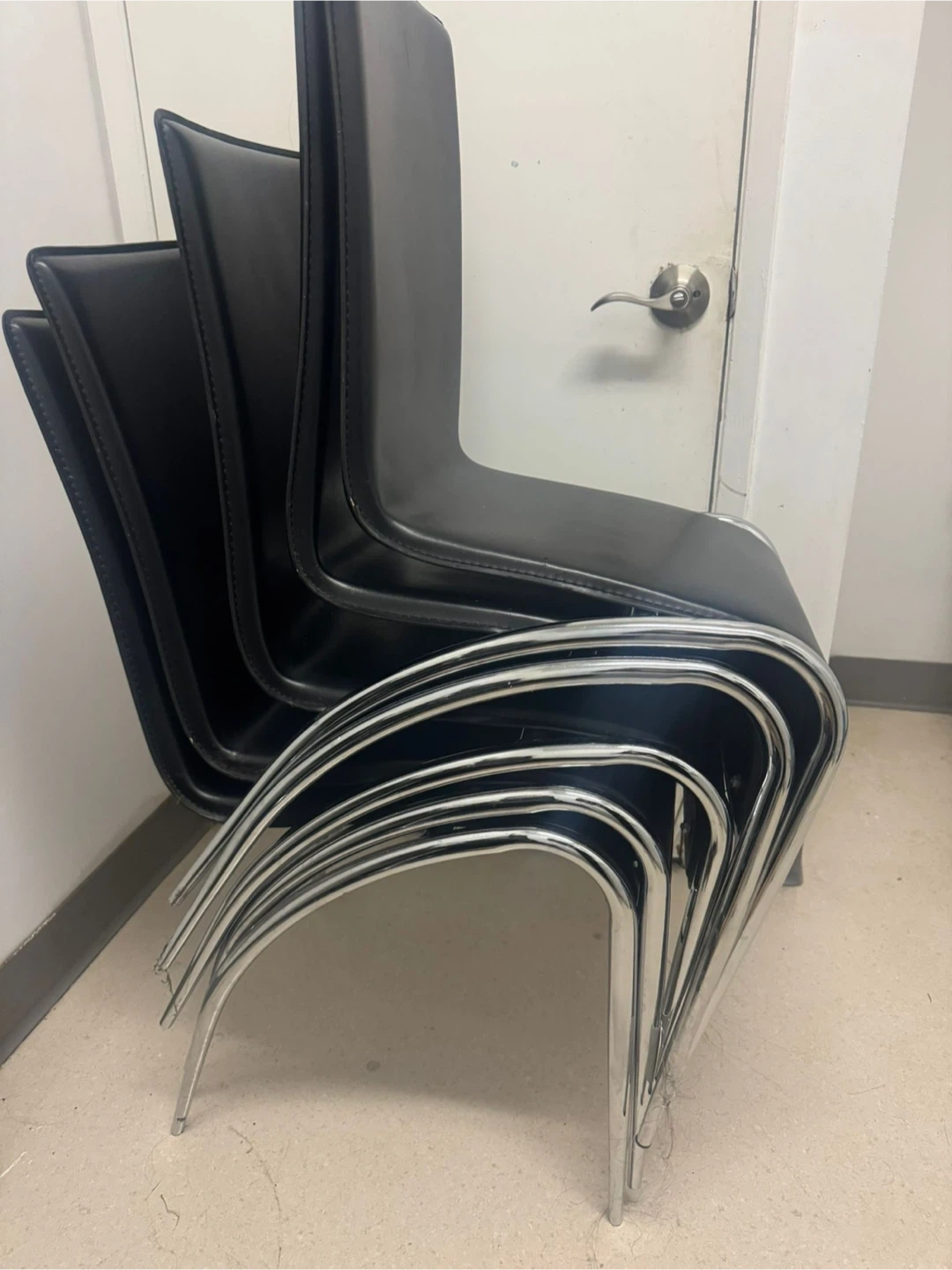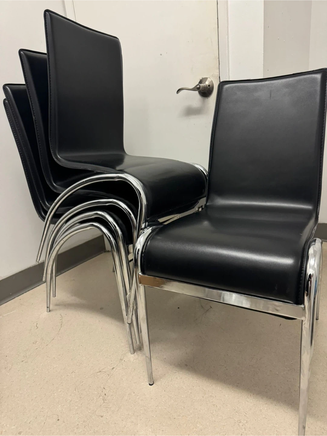Selling a set of four dining chairs! They feature a sleek black leather seat and back, complemented by a chrome frame. These chairs are perfect for adding a modern touch to your dining area or office space. They're in great shape and ready to use!