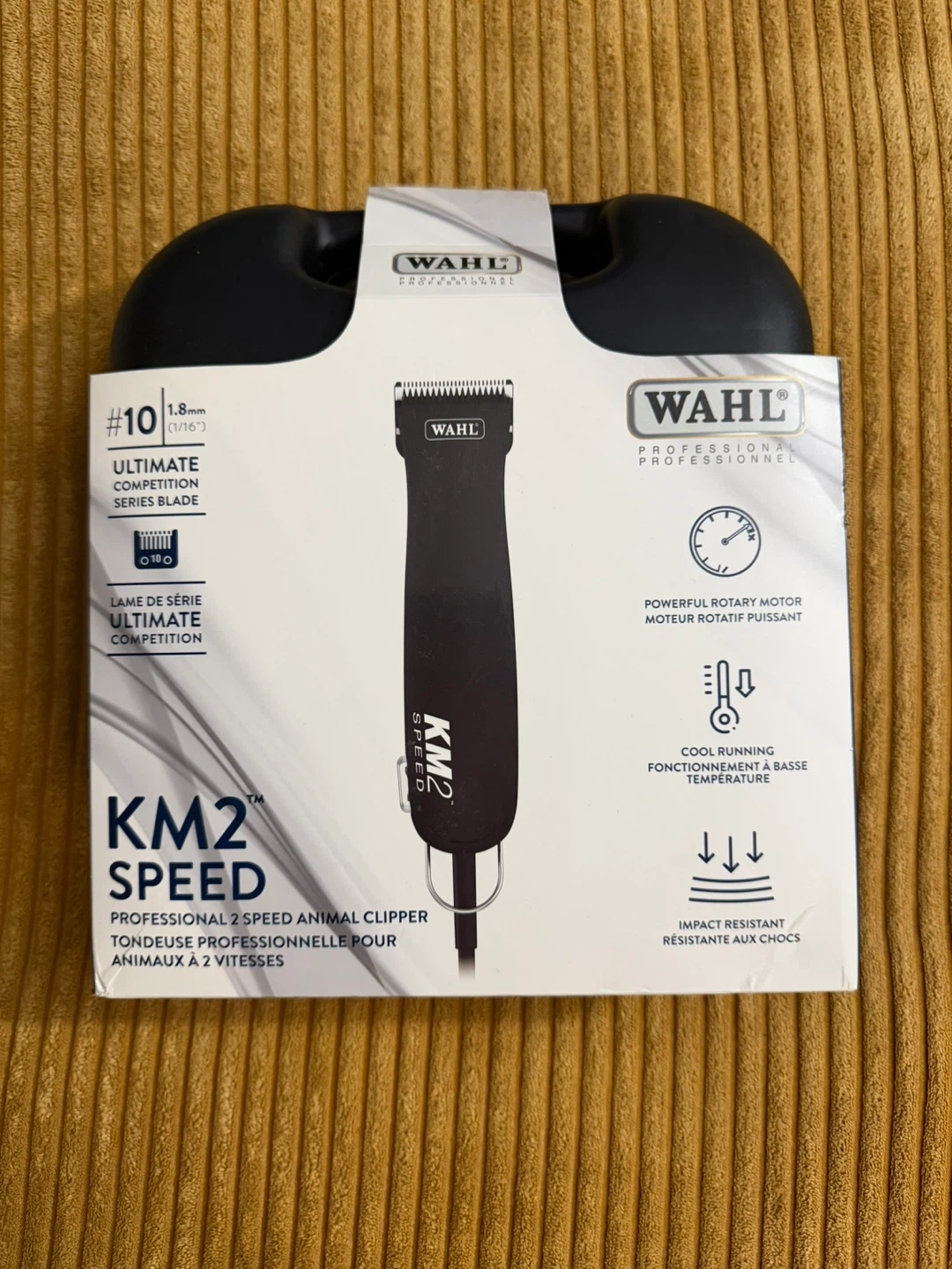 Selling a Wahl KM2 Speed professional 2-speed animal clipper. It features a detachable blade and a high torque clipper. This clipper is compatible with ALL Competition and Ultimate Competition series blades. It has two speeds at 3000 & 3500 SPM. Comes with the box