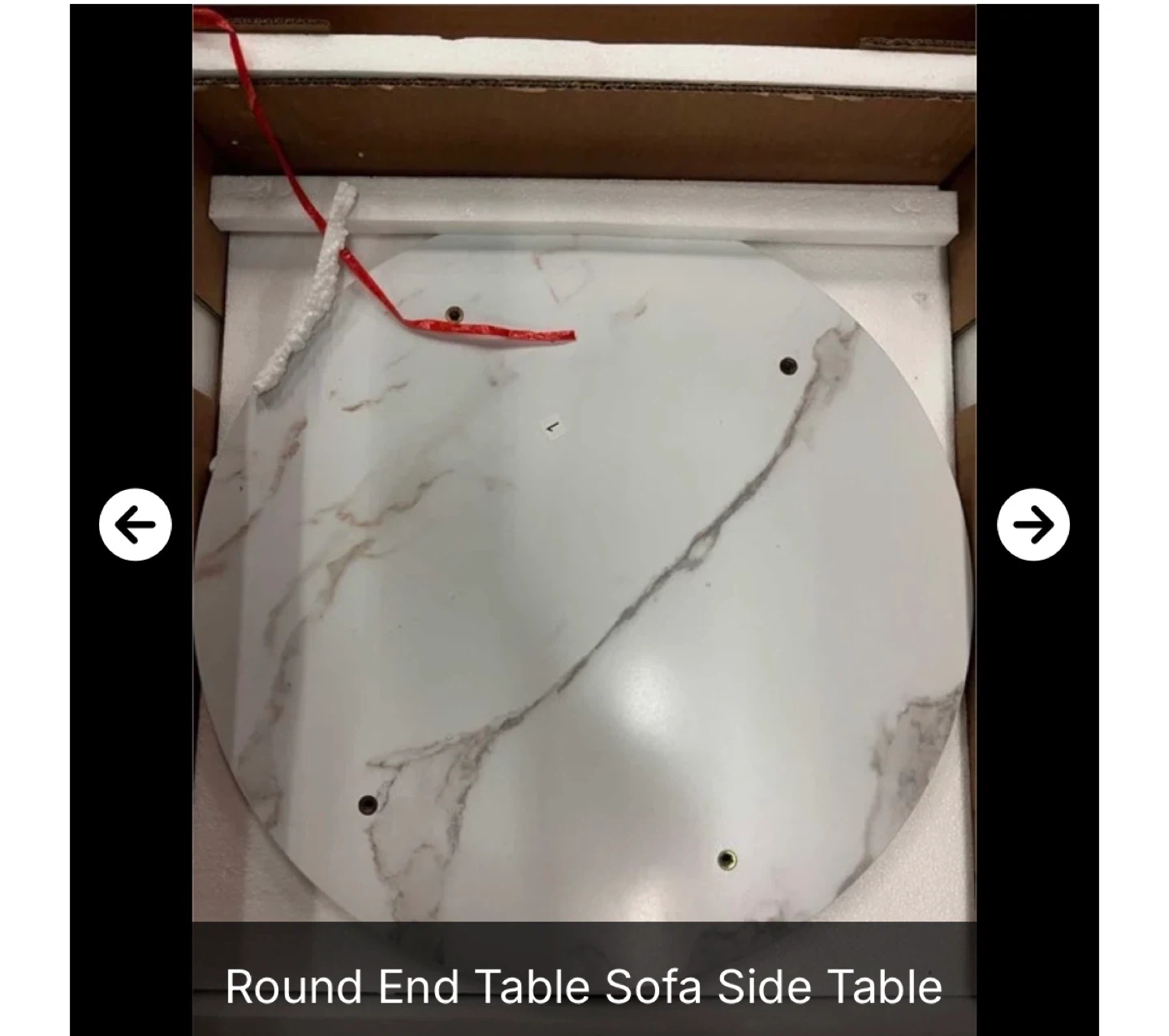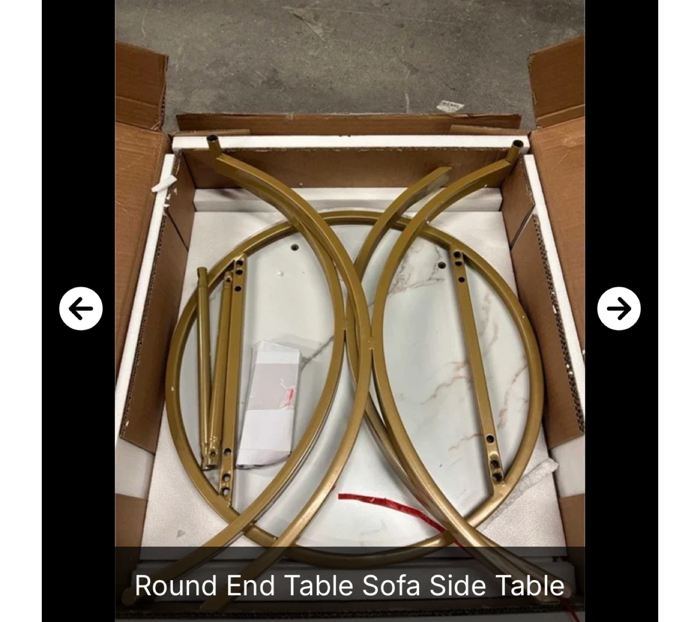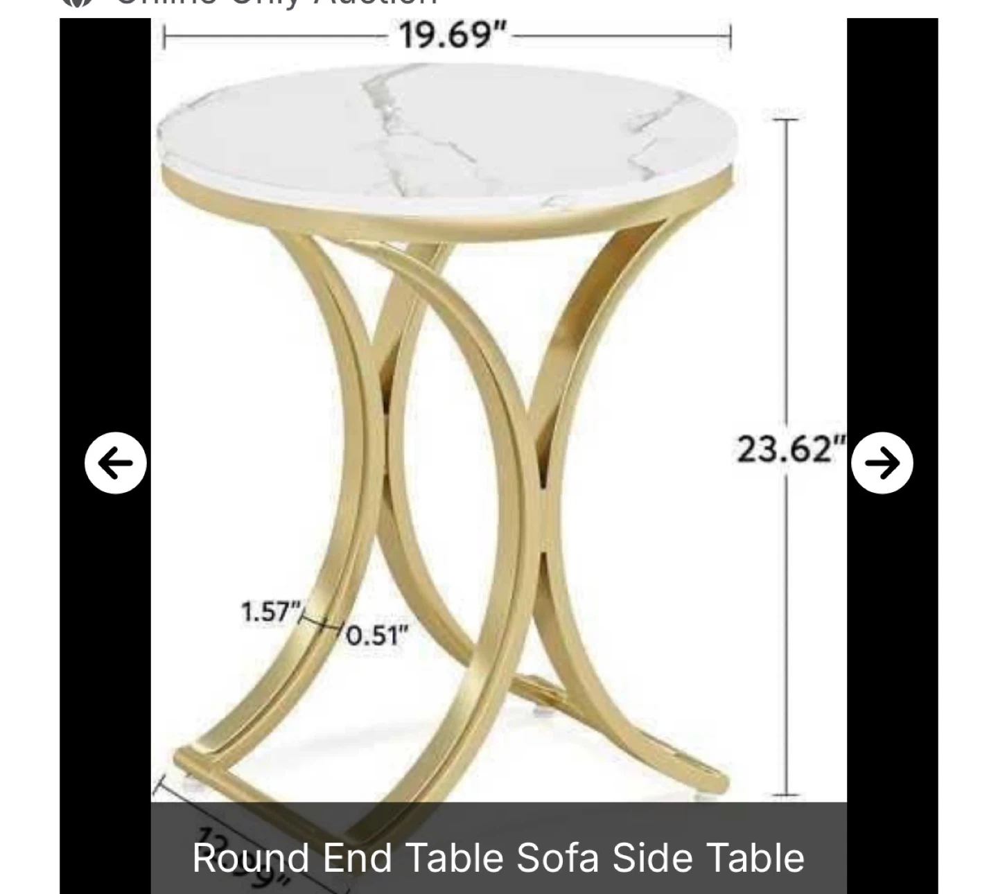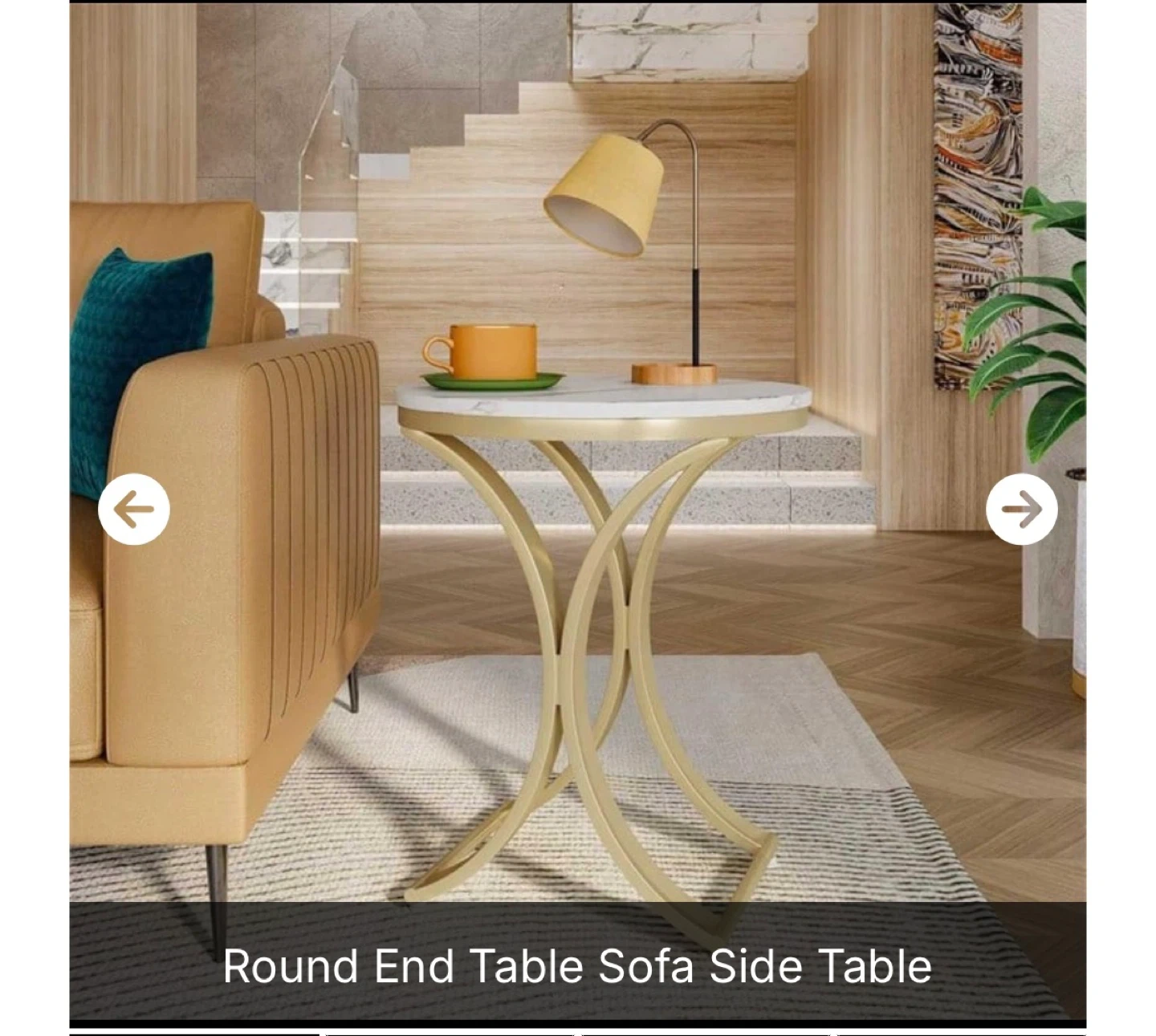Selling a round end table, perfect as a sofa side table! It features a gold frame and a white marble-patterned top. Dimensions are approximately 19.69" in diameter and 23.62" in height. Comes in its original box