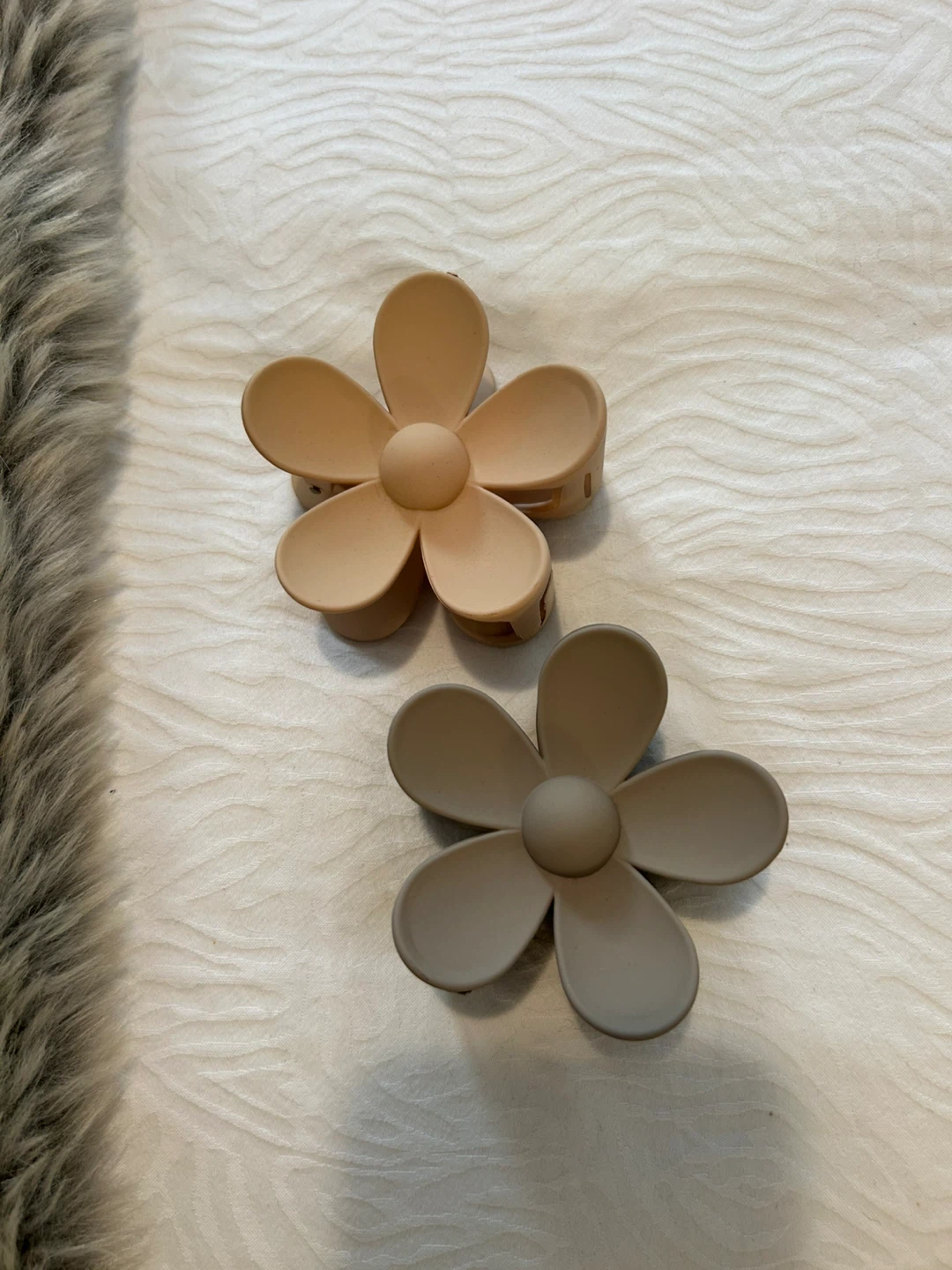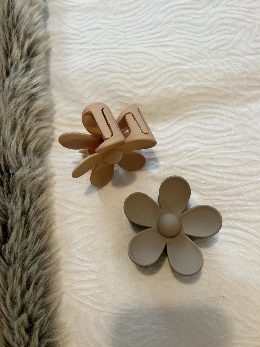 Selling a set of two flower hair clips. One is a light beige and the other is a darker beige/taupe colour. Perfect for adding a cute touch to any hairstyle!