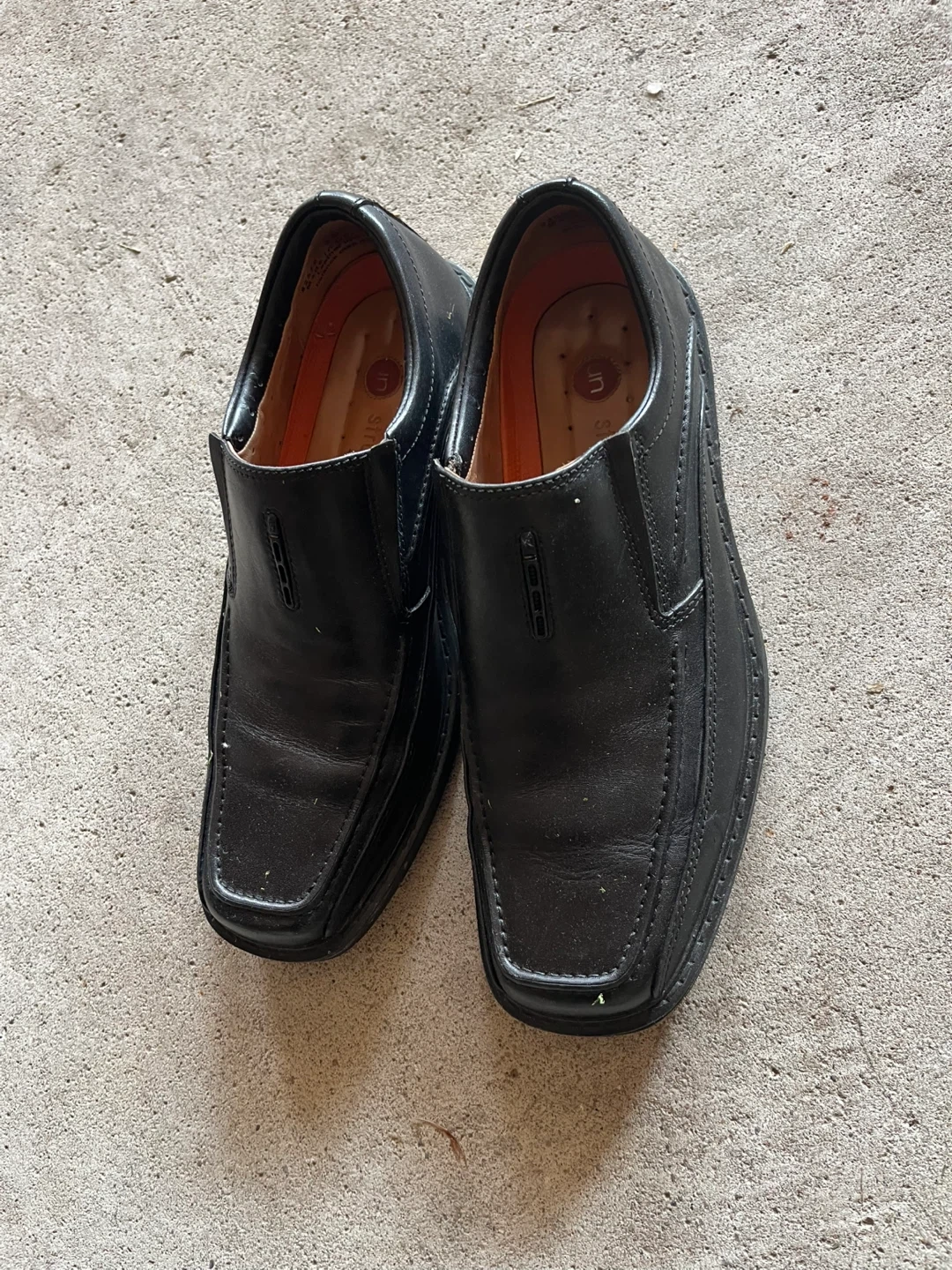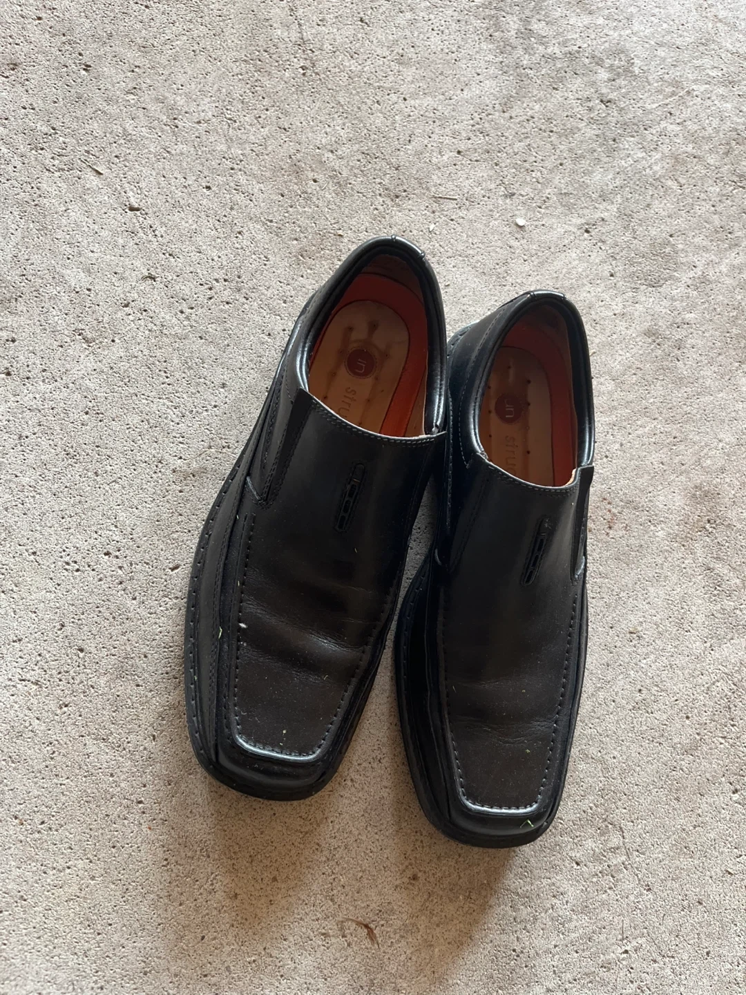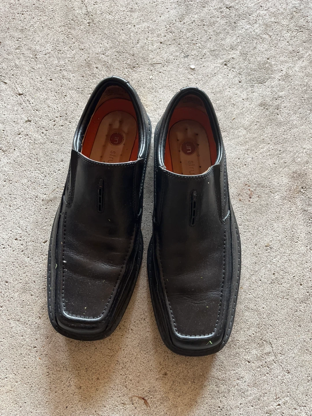 Selling a pair of black leather slip-on shoes. They have some signs of wear, but are still in good condition for everyday use. These are a classic and comfortable style!