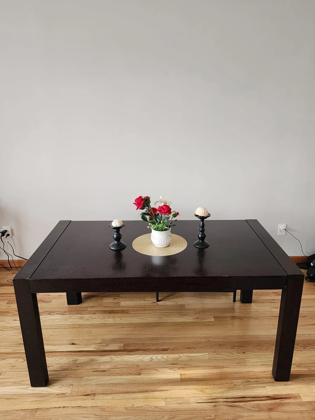 Selling a dark brown wood dining table. It's a sturdy and functional table that would be great for any dining room. It has a simple, modern design that would fit in with any decor. It's in good condition and ready for a new home. Up to 6 to 8 people.