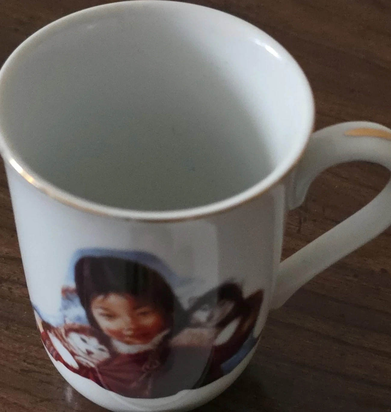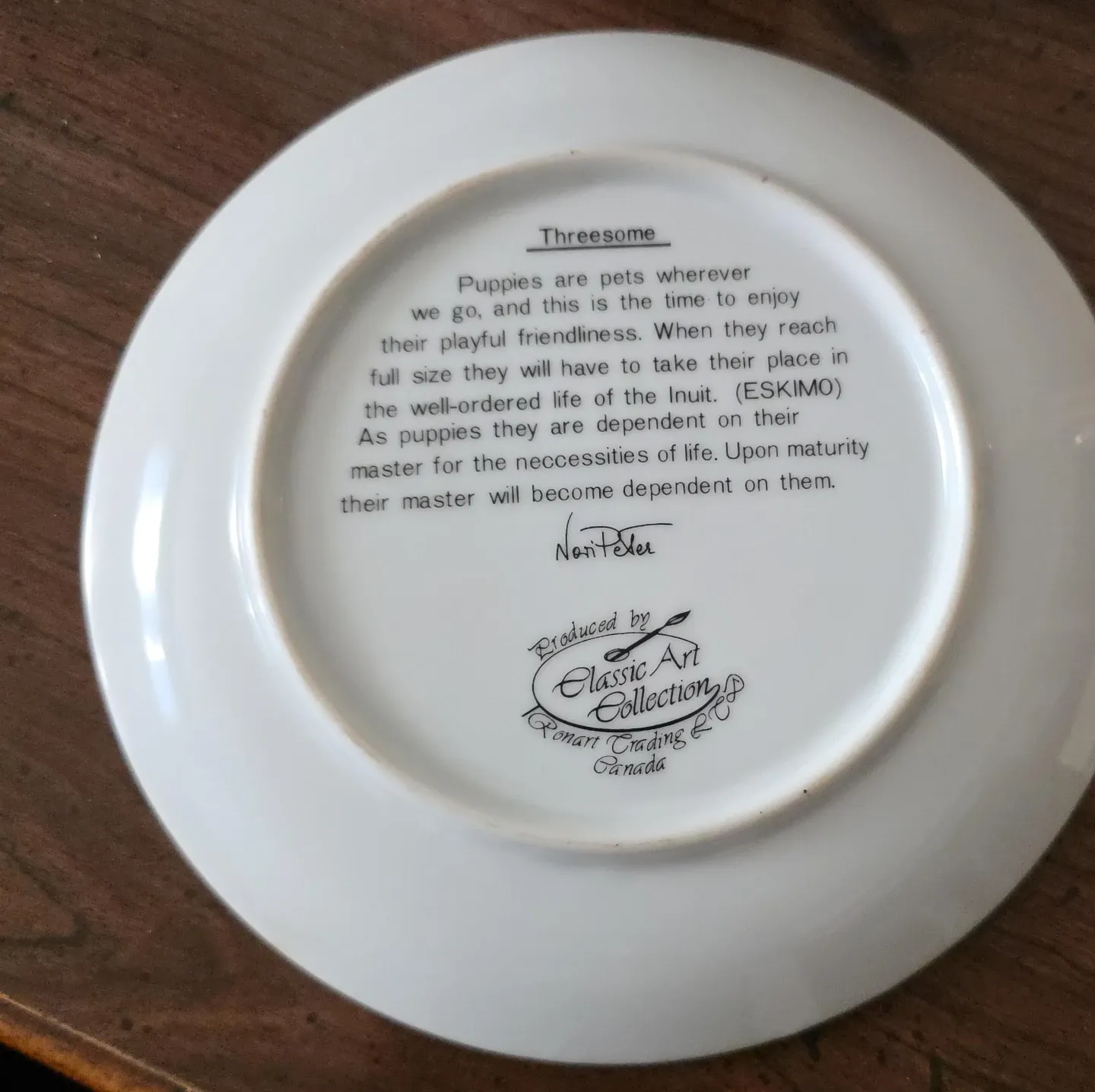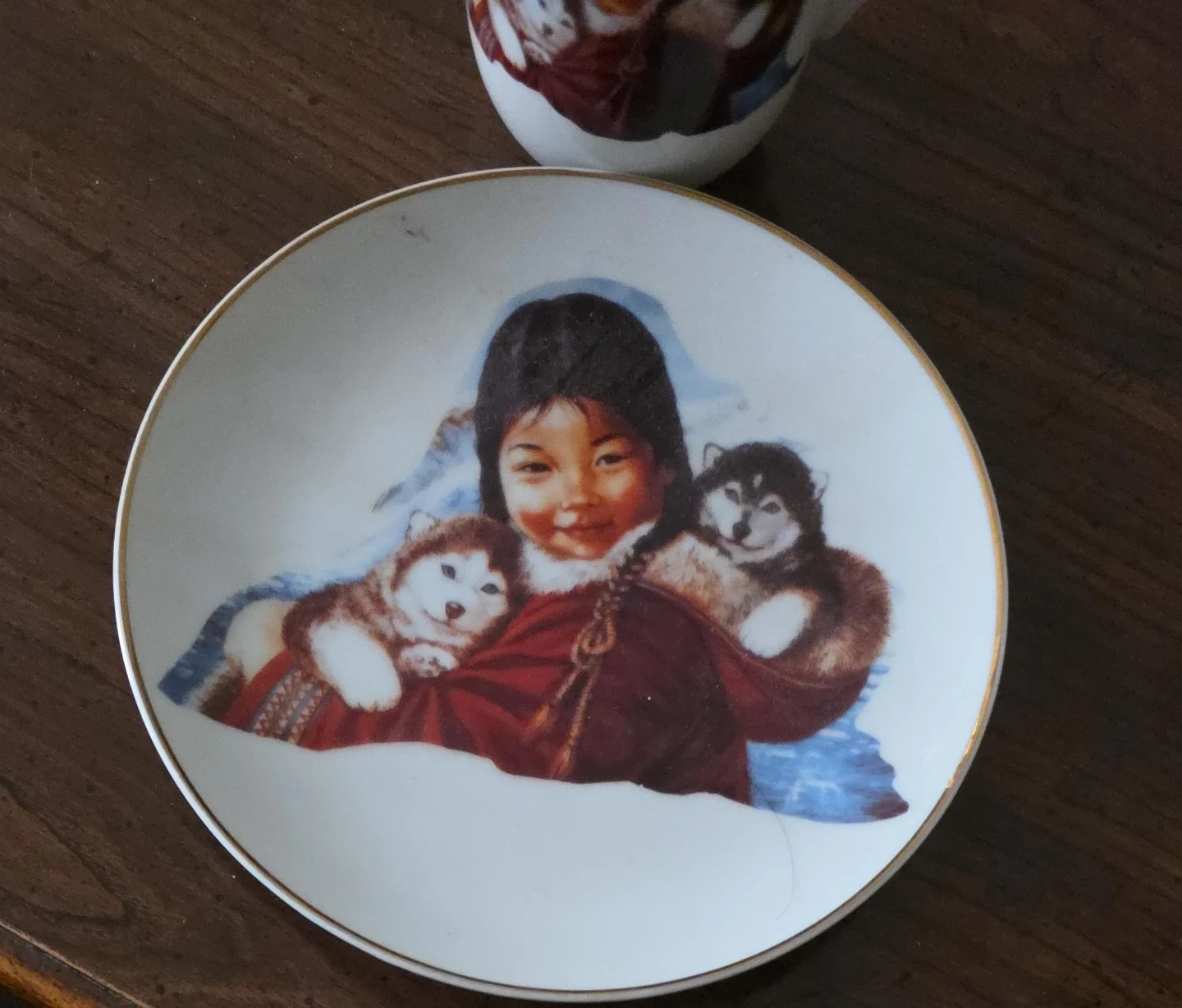 Selling a cute plate and mug set from the Classic Art Collection. The plate features a design with a girl and husky puppies. The text on the back of the plate describes puppies and their relationship with their master. Perfect for collectors or anyone who loves unique dishware