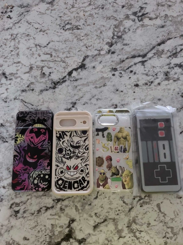 I have four brand new Google Pixel 8 phone cases. I've upgraded to the Google Pixel 10 and these cases came in late and I already sold the pixel 8. The first is a white Gengar case, the second is a black and purple Gengar case, the third is a classic Nintendo controller, still sealed in its original packaging, and a Sherk case. Take all 4 for $40 or $10 each. Pickup in Riverview. If the ad is up, they're still available!