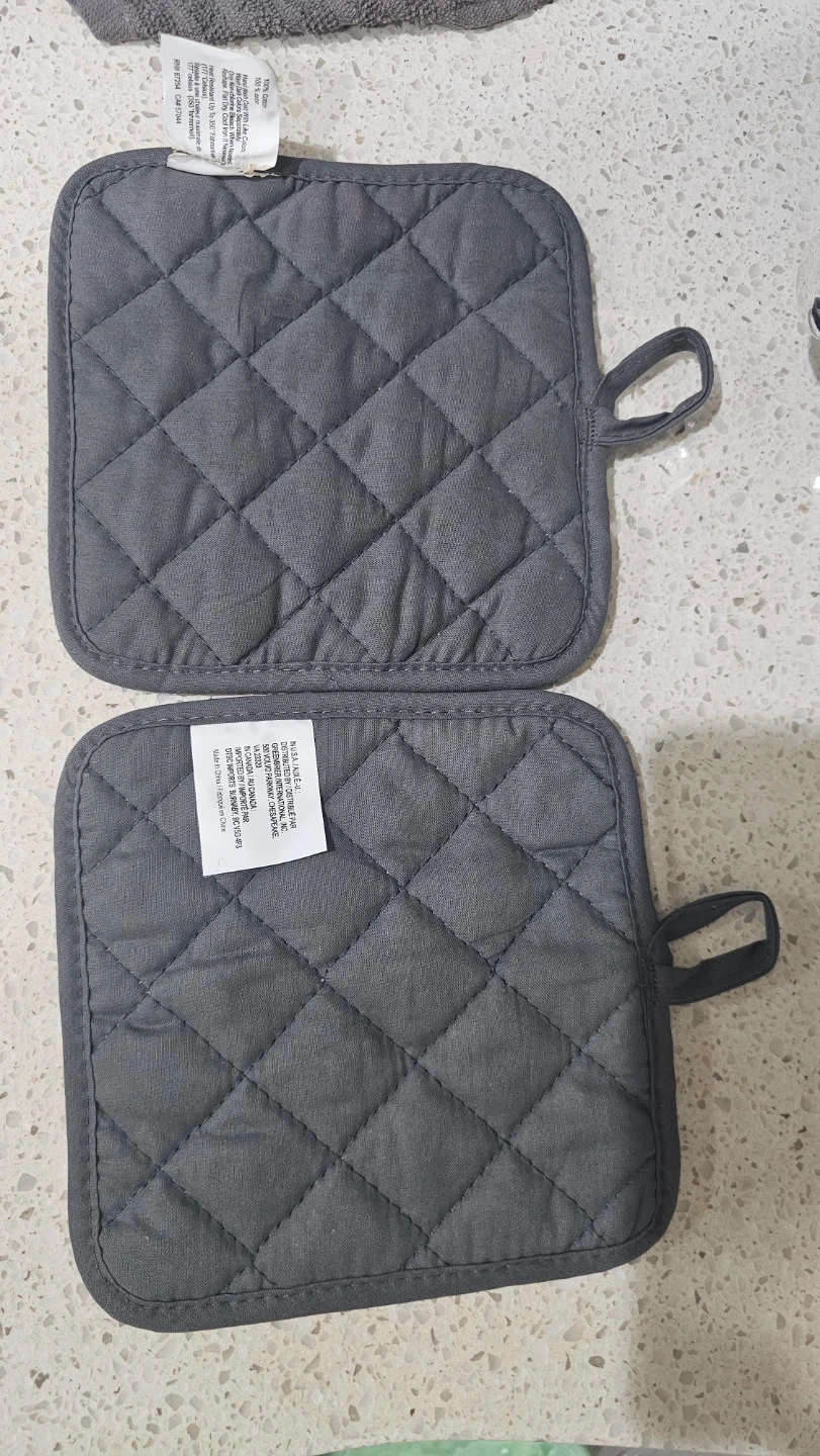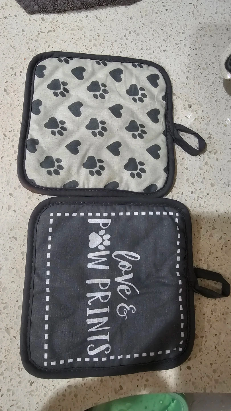 I'm selling a set of two square potholders. One has a cute paw print design, and the other has "love & paw prints" written on it. They're both in great condition and ready to protect your hands from hot pots and pans