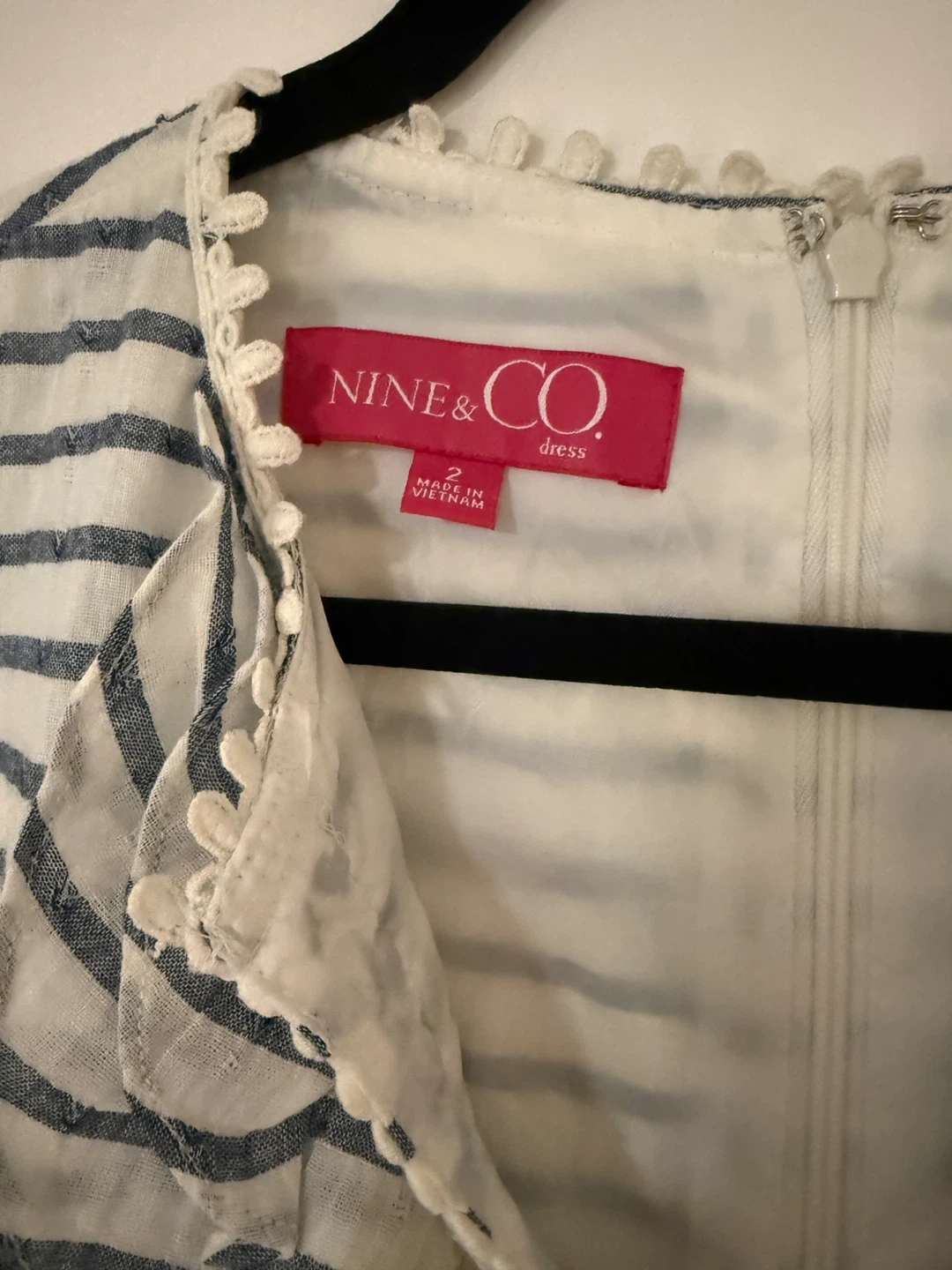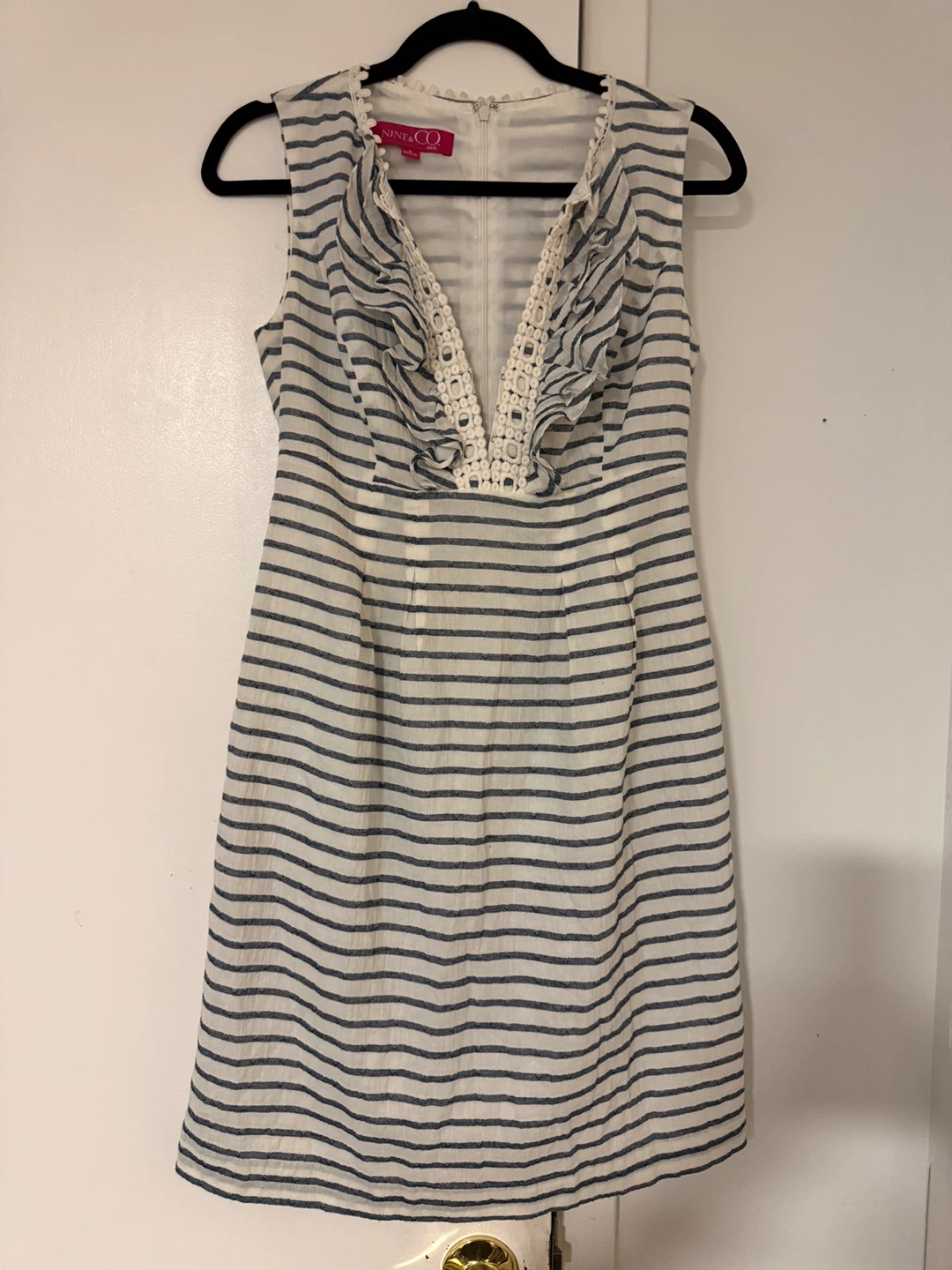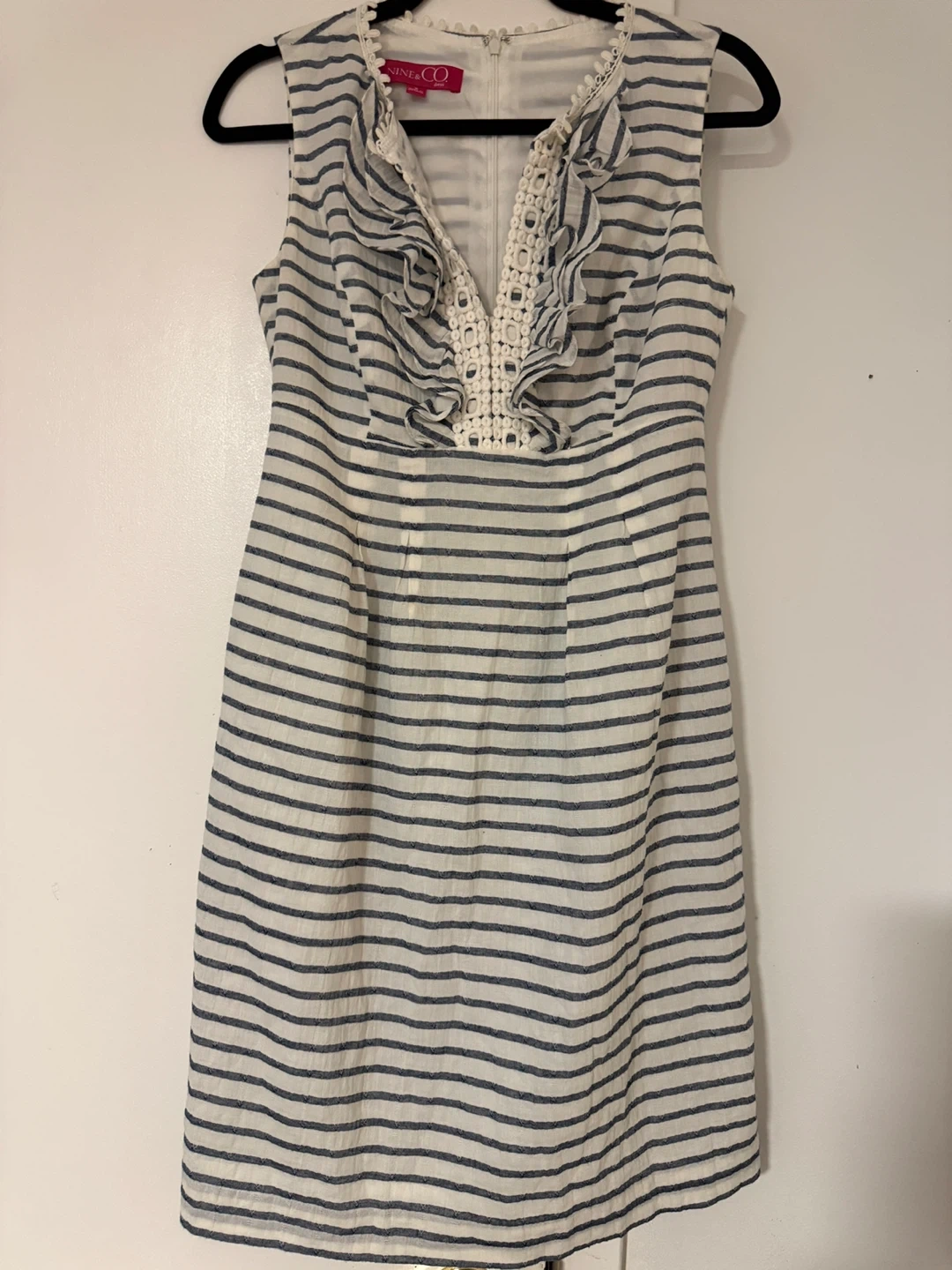Selling a cute Nine & Co. dress in size 2! It features a striped pattern and a lovely ruffle detail around the neckline. Perfect for a casual day out or a summer event