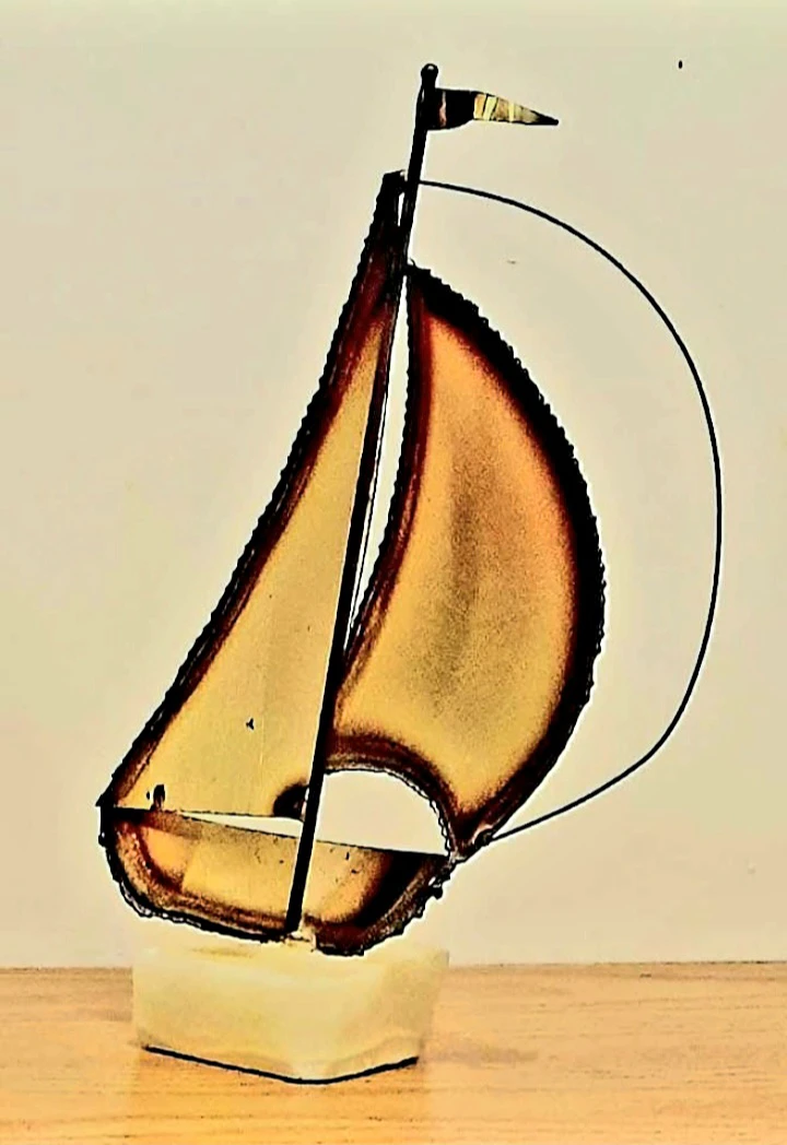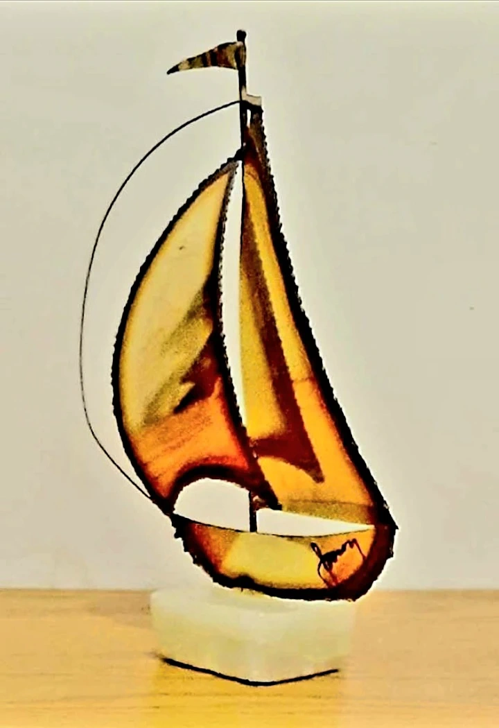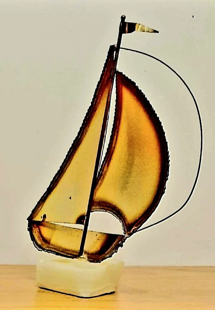 This unique, signed artist handmade brass sailboat is a charming piece of maritime-inspired art, featuring intricate brass detailing and a solid Onyx Hand Chiseled base. It's a used item and has a lovely patina. This sailboat will look lovely displayed in your home or office.