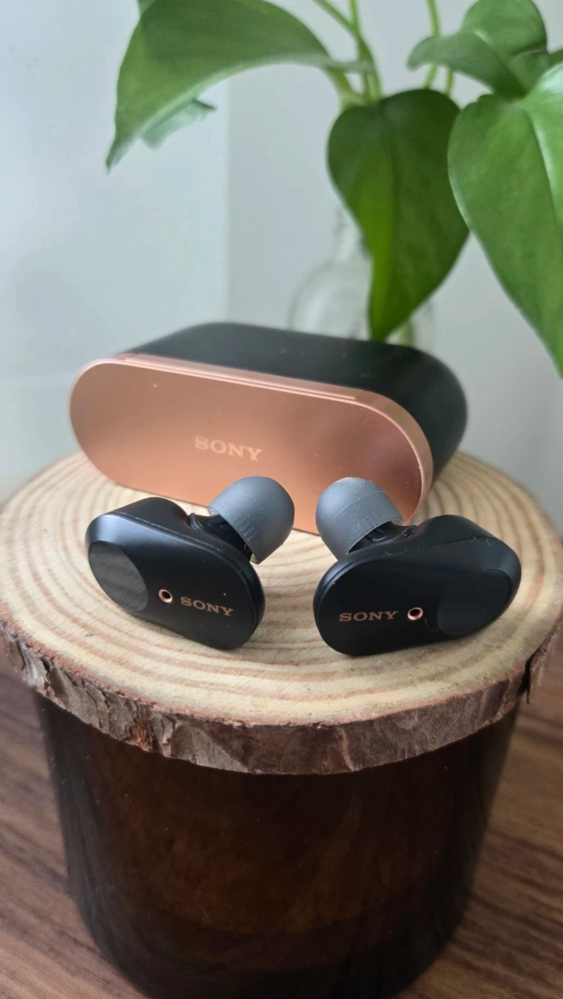 Sony WF-1000XM3 true wireless earbuds in good working condition. Great sound quality with active noise cancelling, stable Bluetooth connection, and comfortable fit.