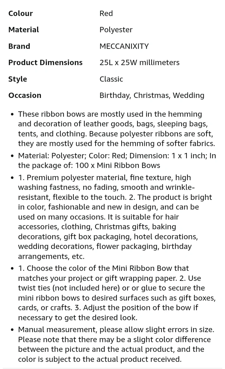 I have sets of MECCANIXITY mini ribbon bows available, perfect for adding a touch of charm to your craft projects! These 1" mini fabric satin ribbon flower bows are great for DIY sewing, wedding decorations, or birthday party embellishments. Available in various colours.