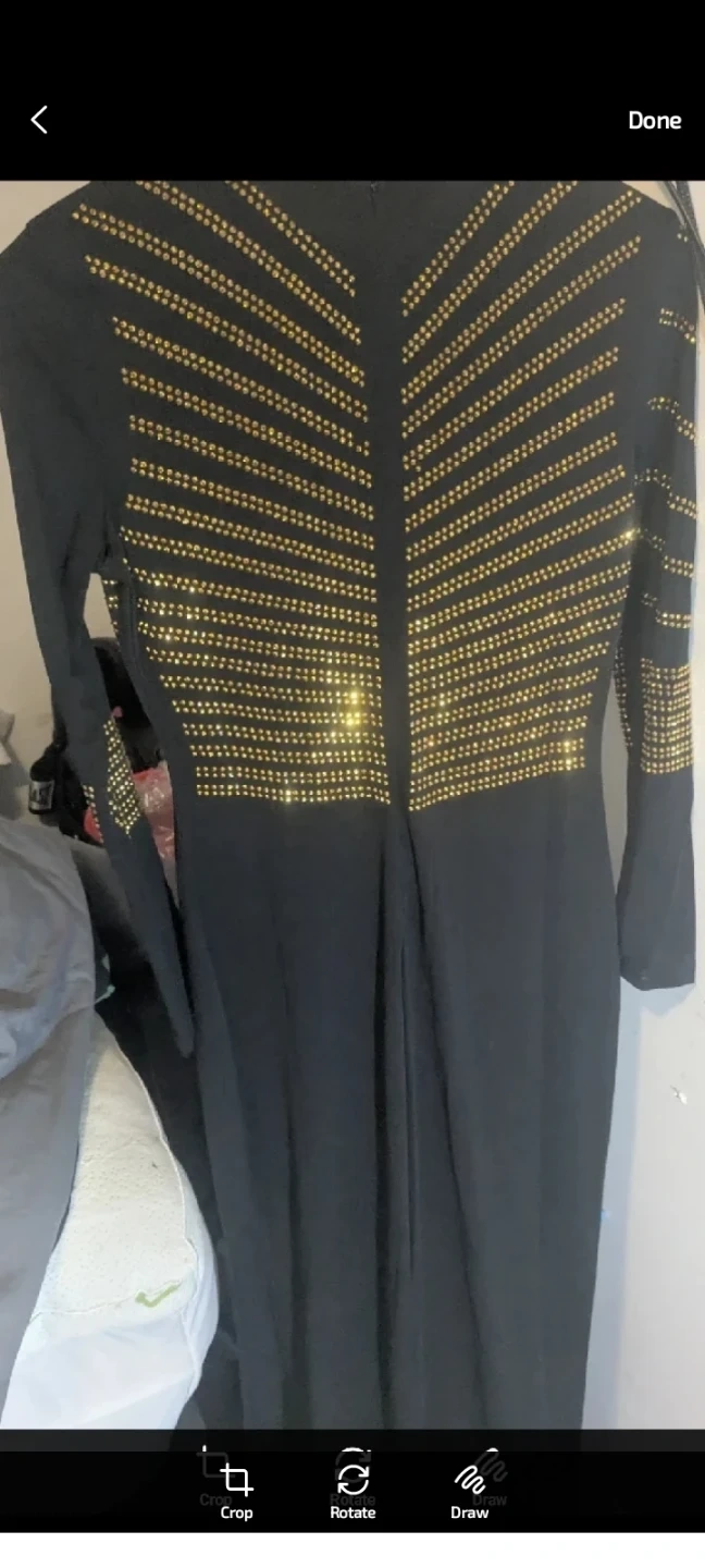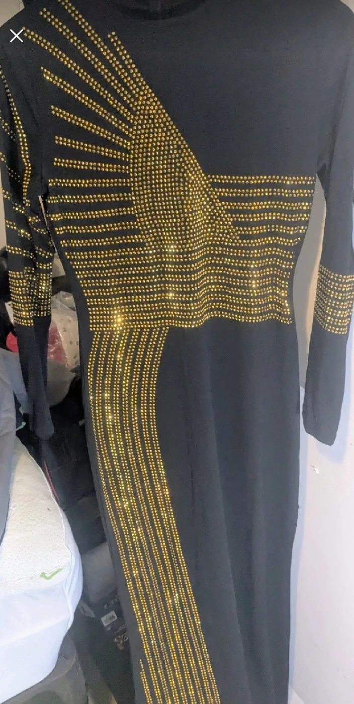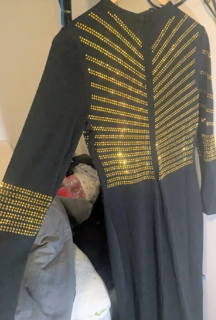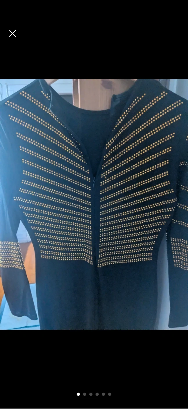 This is a striking black long-sleeve dress featuring a unique design of gold studs. It's perfect for making a statement at any event! The dress has a sleek, form-fitting silhouette and the gold studs add a touch of glamour