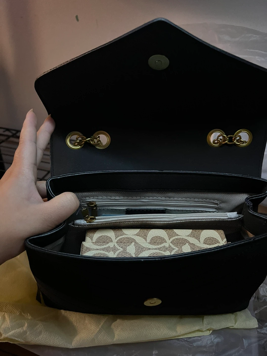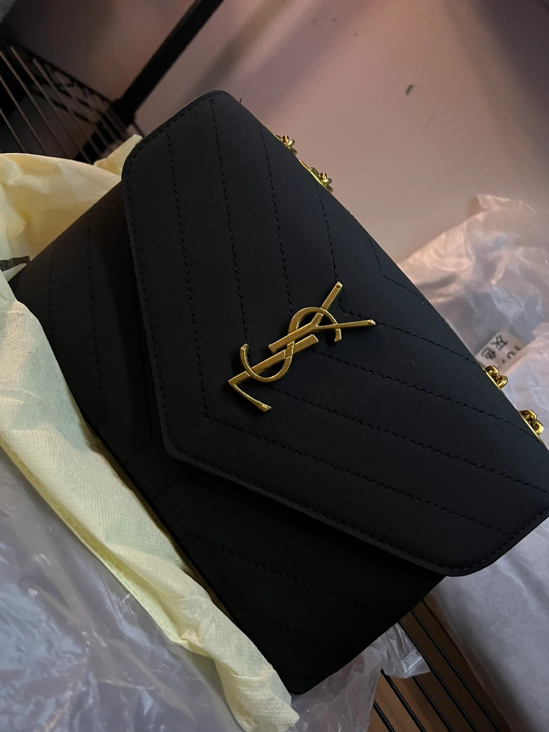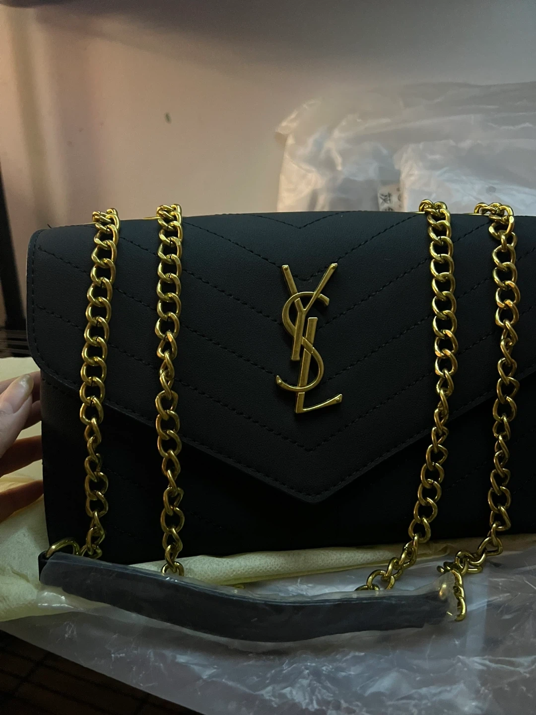 Selling a stylish black YSL chain wallet. It features the iconic YSL logo in gold hardware and a chain strap. The interior has compartments for cards and cash.