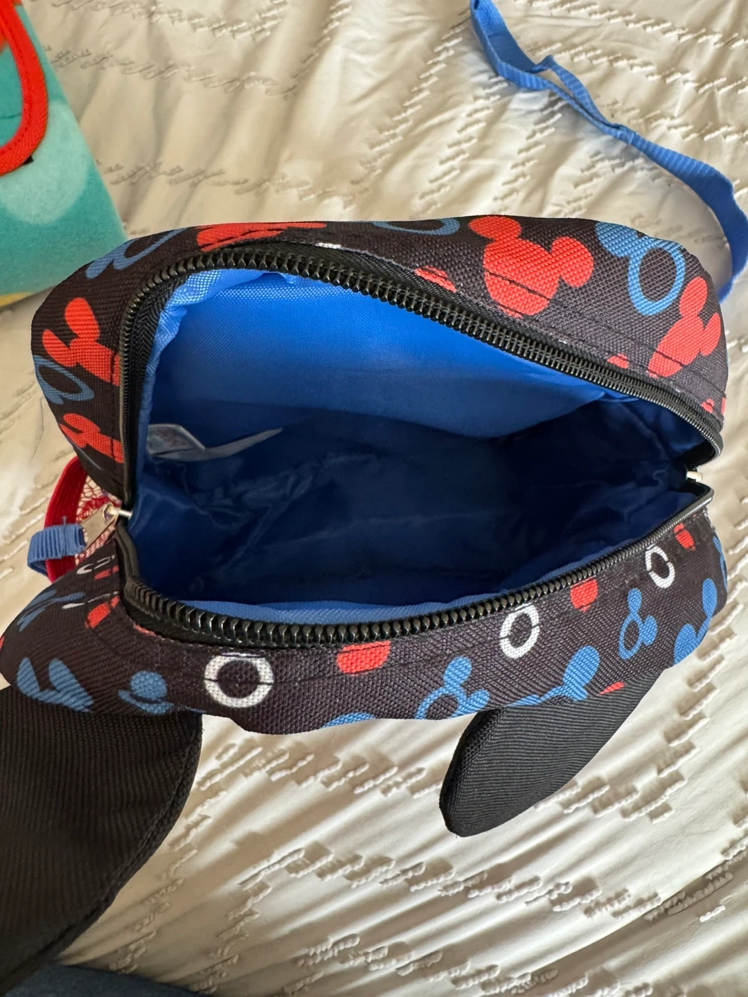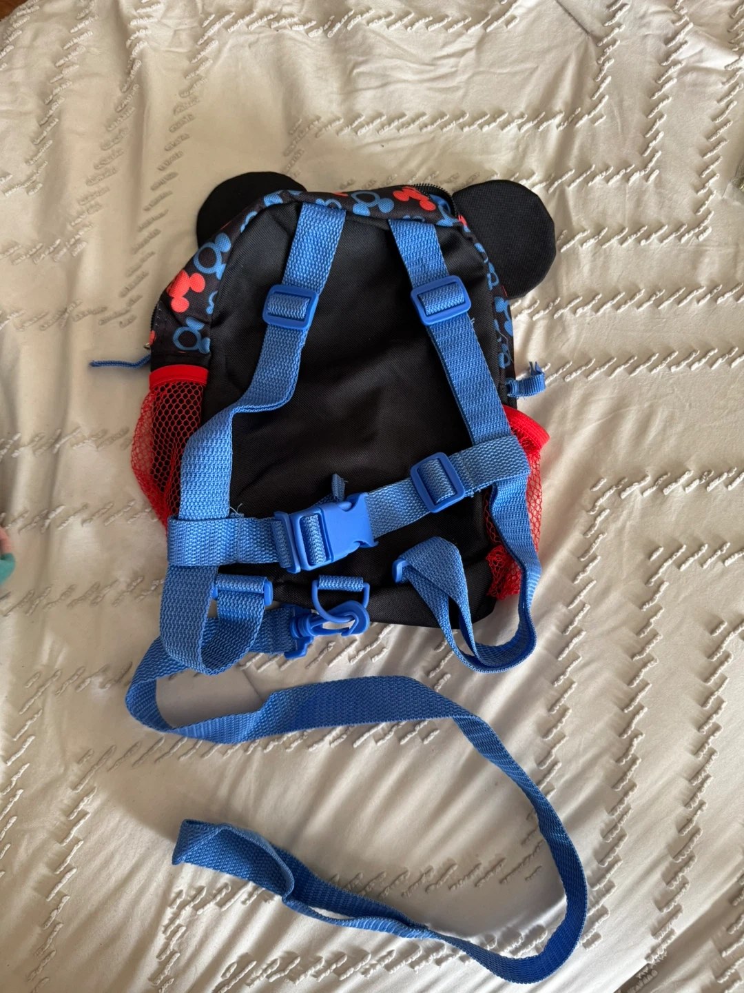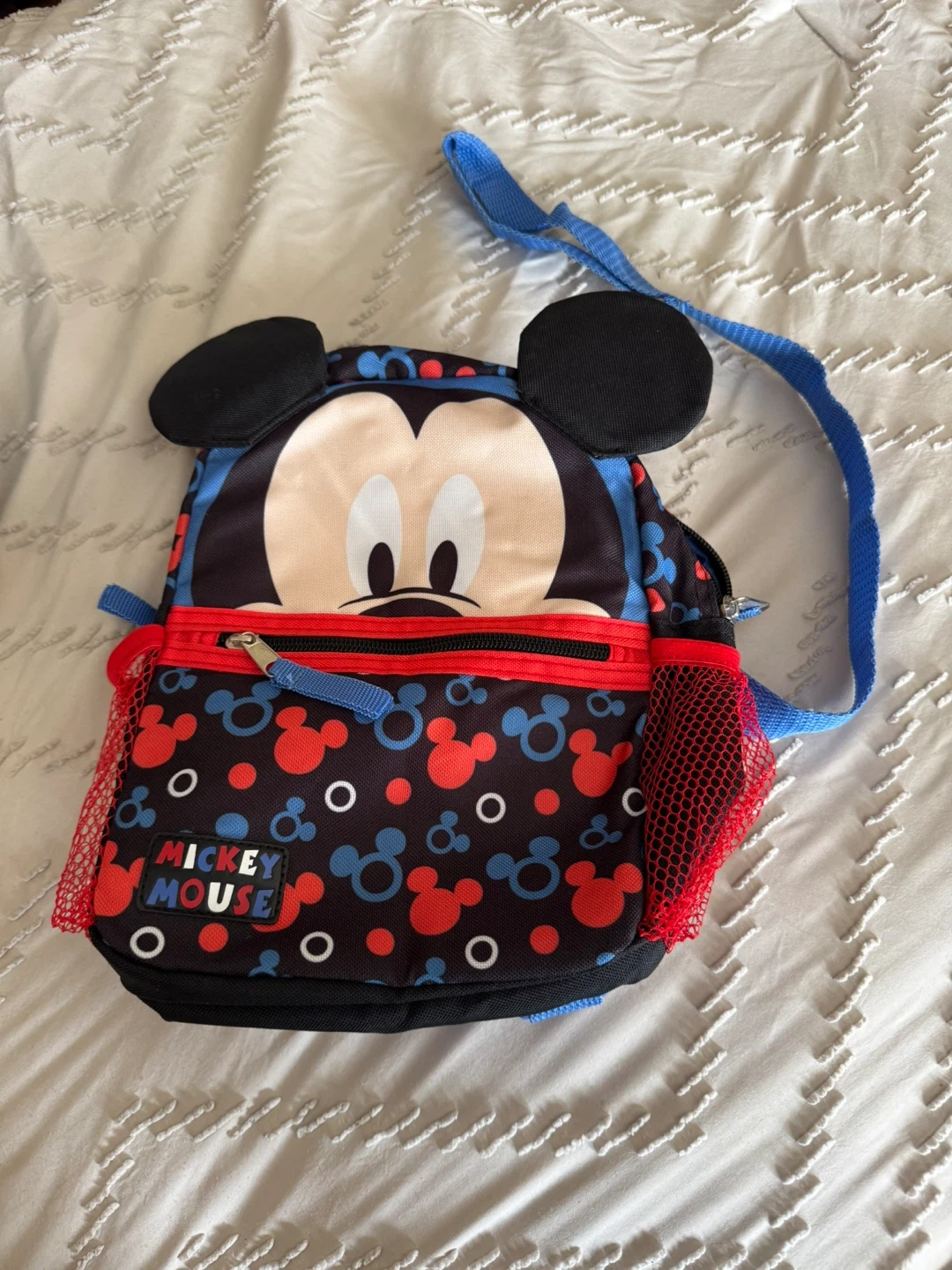 I'm selling a cute Mickey Mouse toddler backpack! It features Mickey's face and ears on the front, with a fun pattern of Mickey Mouse heads. It has adjustable blue straps and a small front pocket, perfect for little ones to carry their essentials