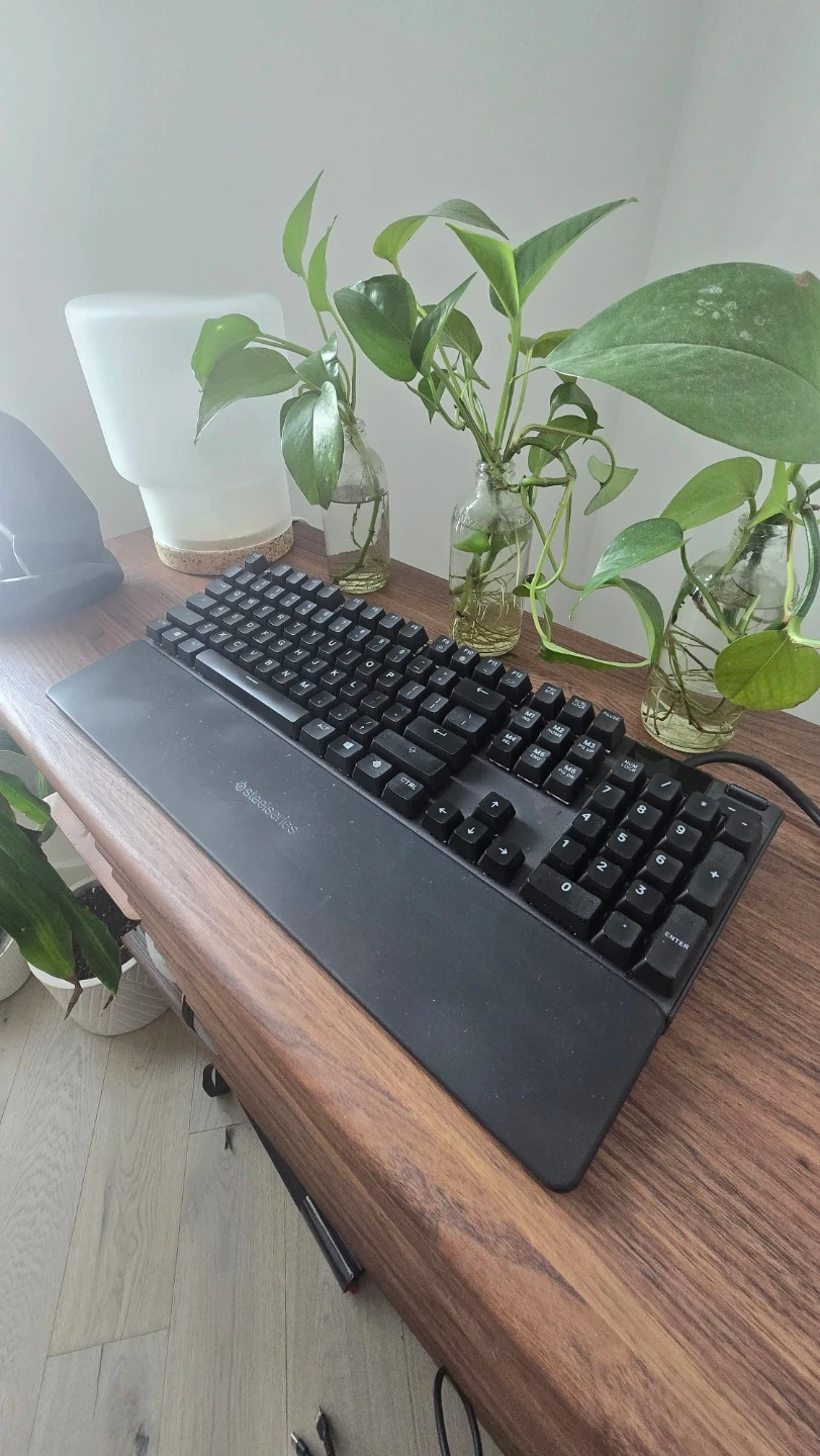 SteelSeries full-size mechanical keyboard in good working condition. Comfortable typing feel with a solid, sturdy build. Includes the matching wrist rest shown.