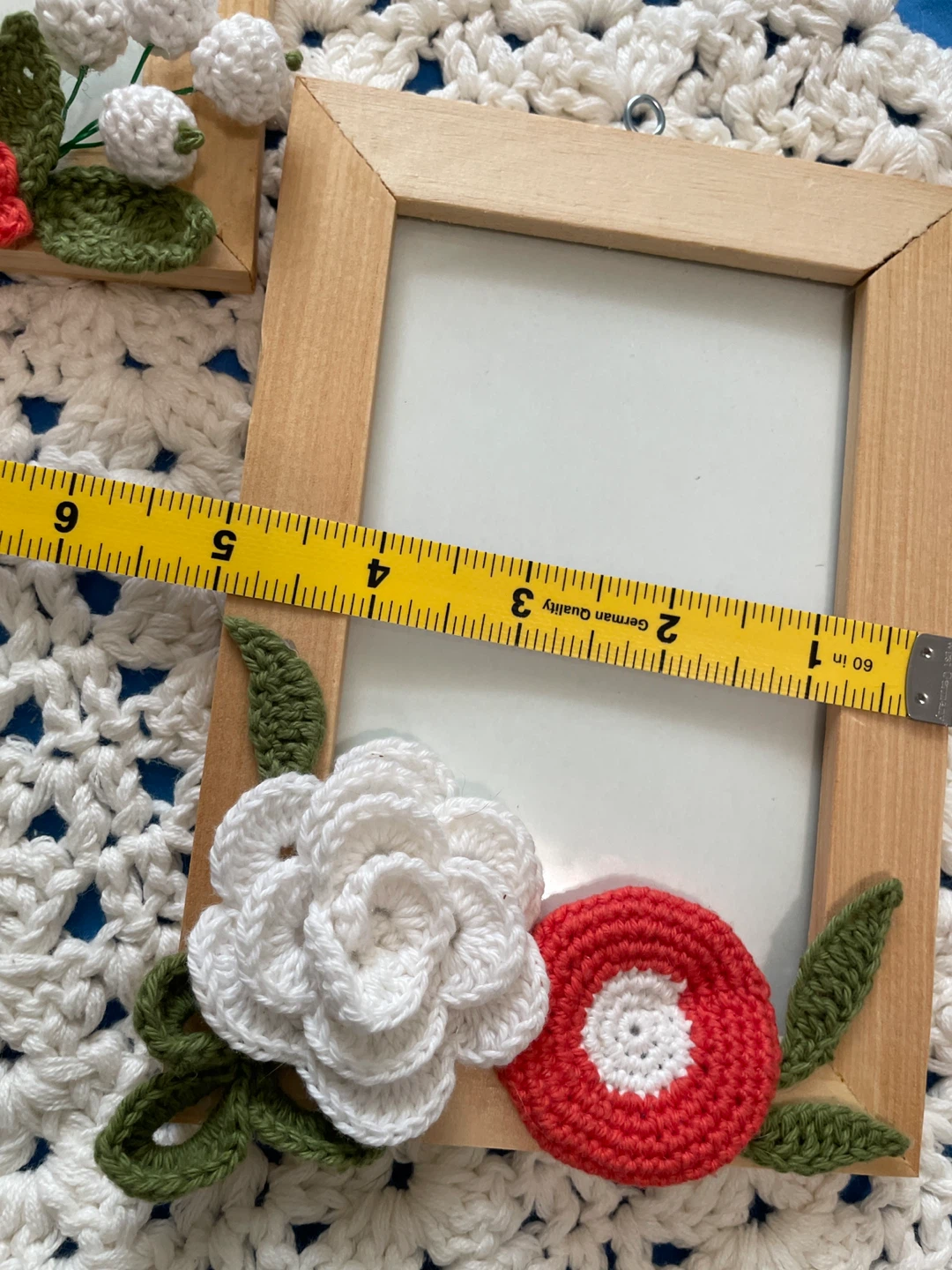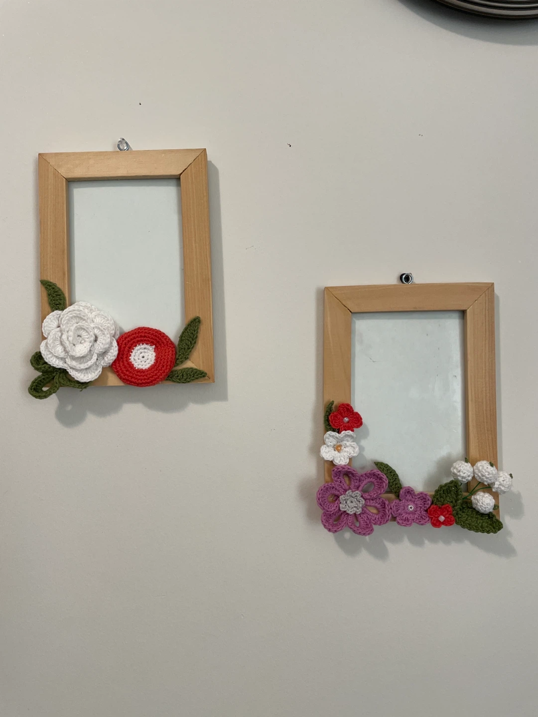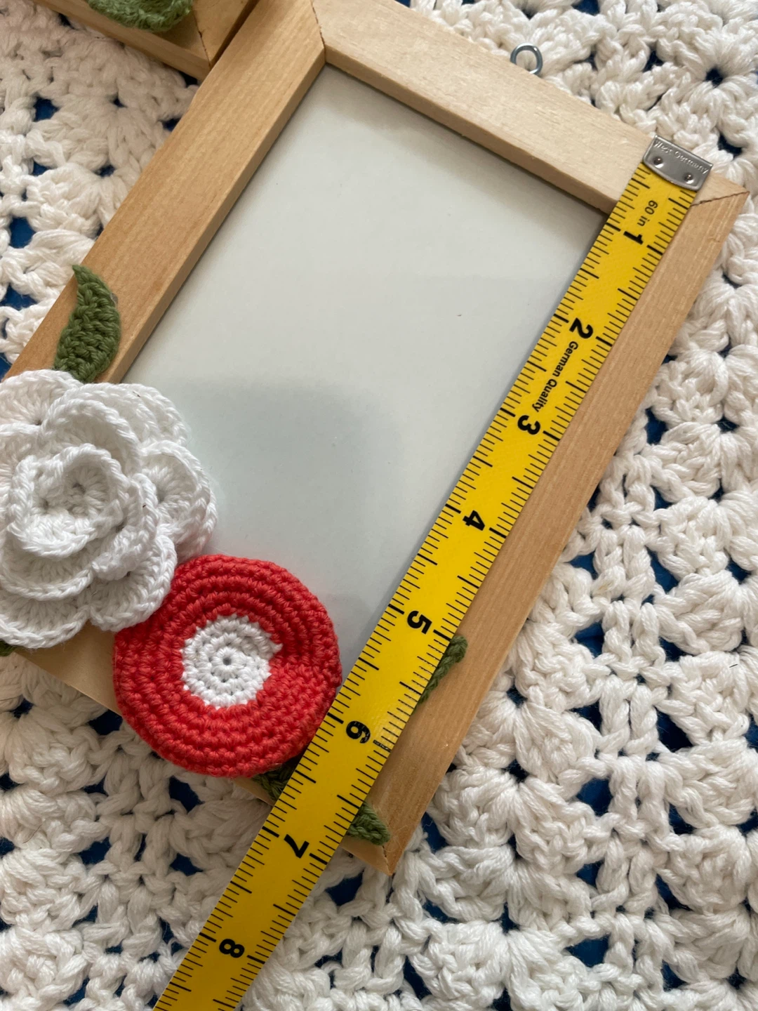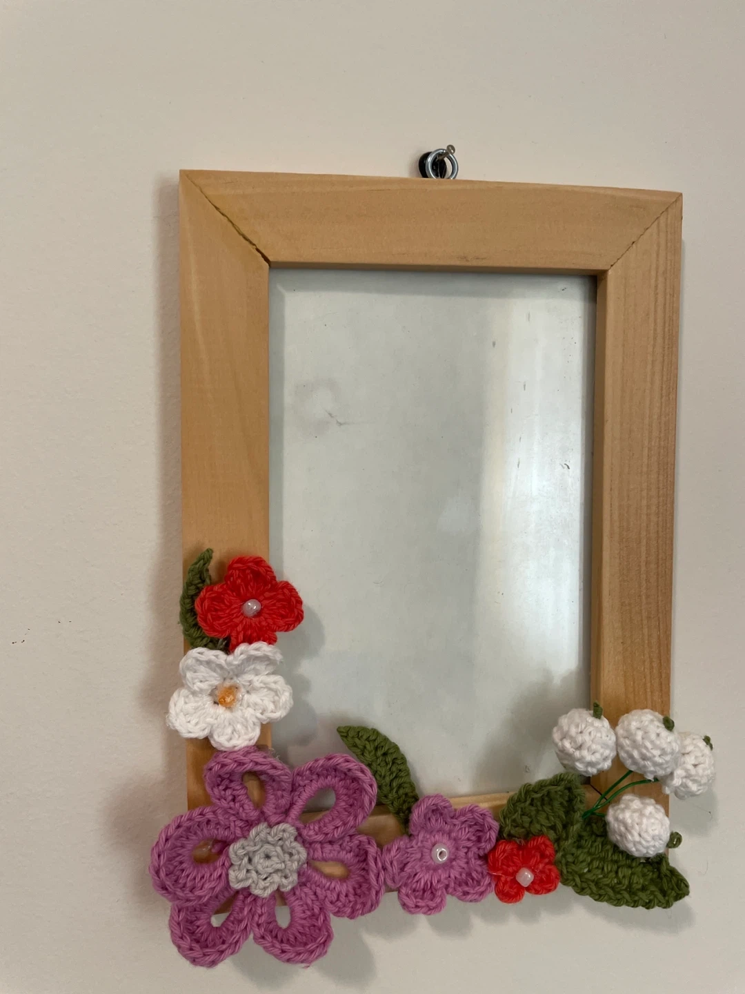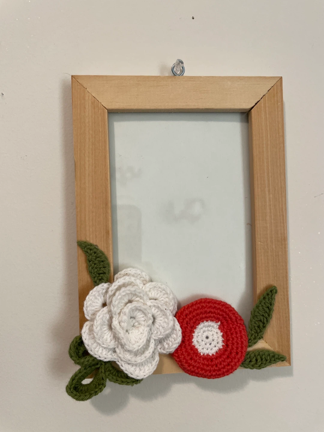 Selling a cute handmade wooden picture frame, decorated with crochet flowers and leaves. It's about 5” wide, 7 inches in length. Perfect for adding a touch of handmade charm to your space!