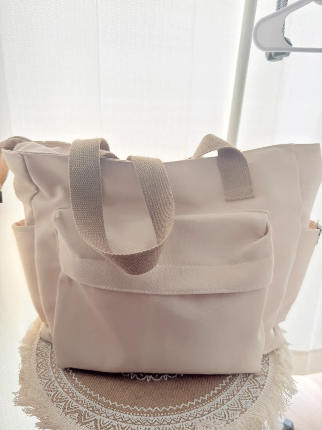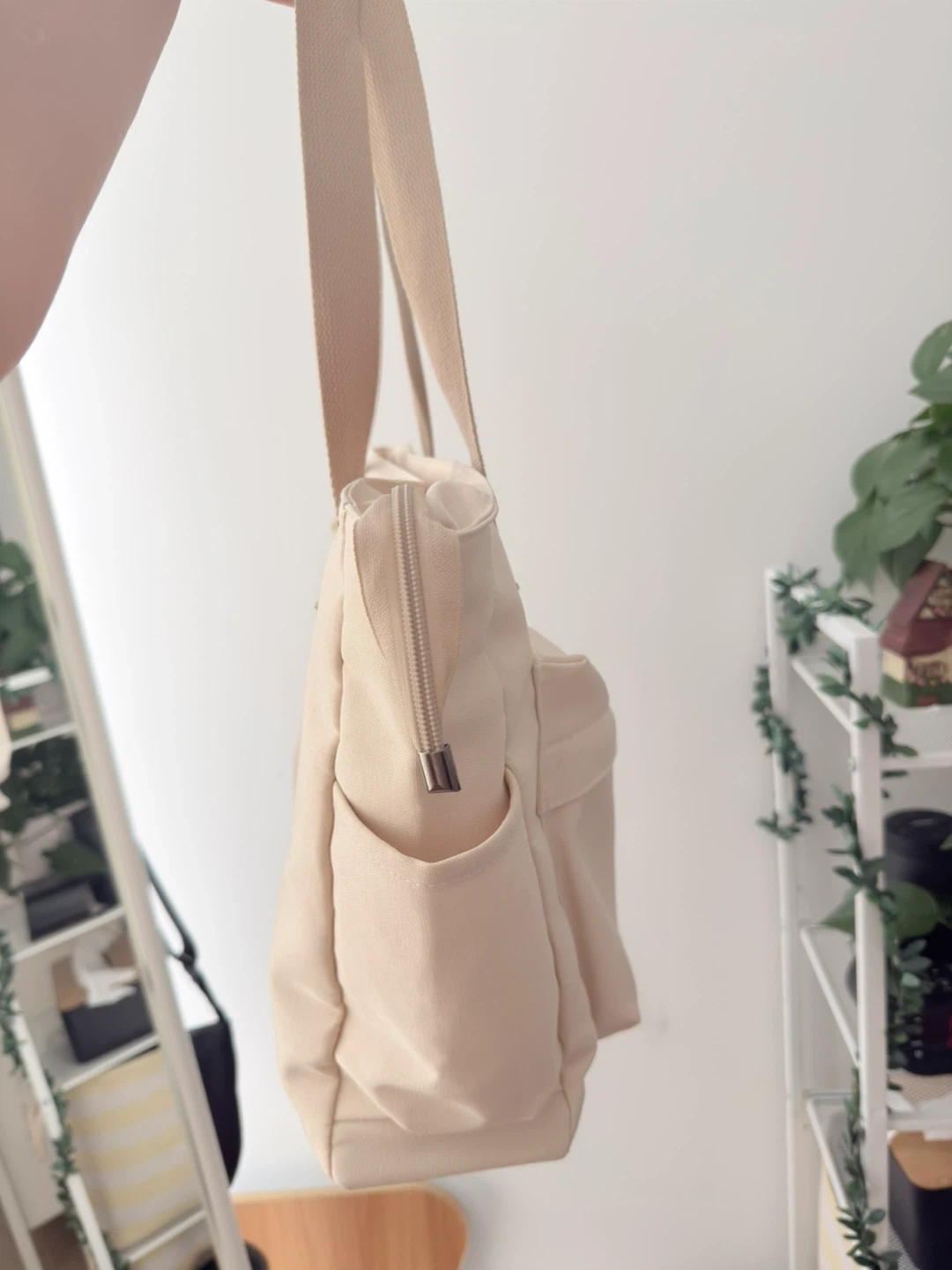 A cute and versatile beige canvas tote bag! Perfect for everyday use, shopping, or carrying books. It has several pockets for organization, making it super practical. It's in great condition and ready for a new owner