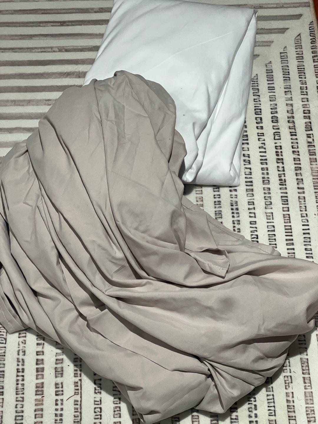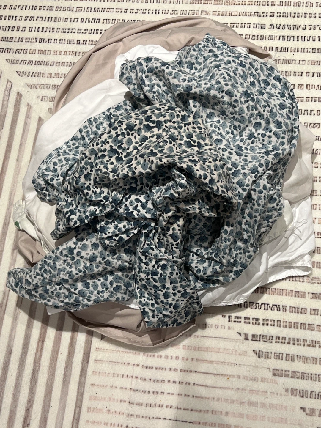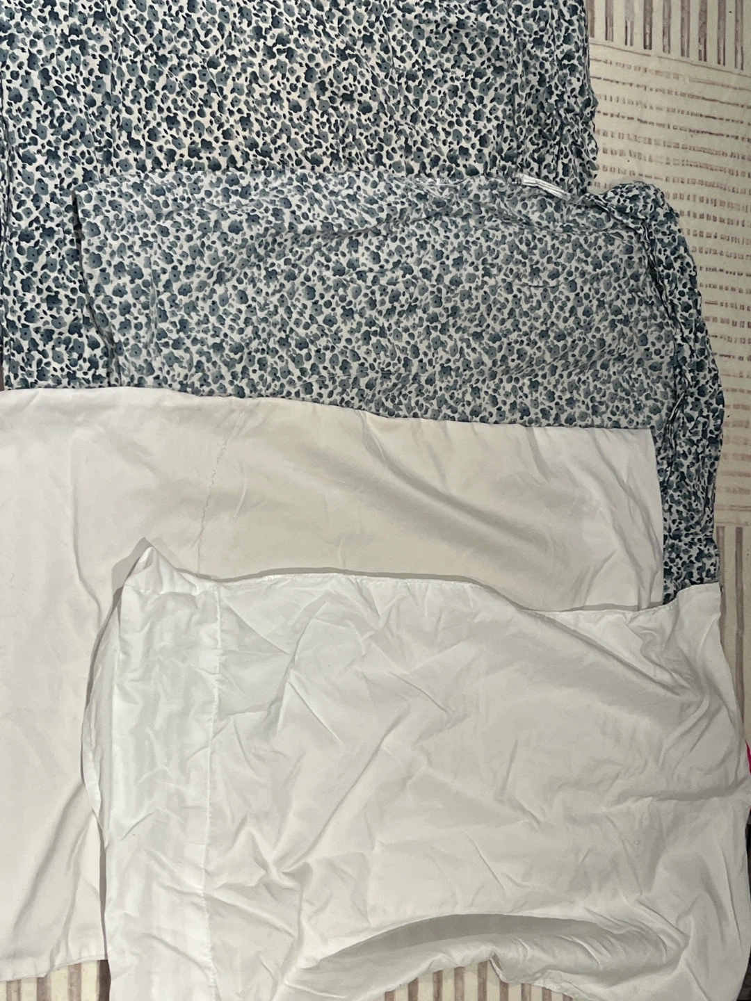 A bedding set with a light beige sheet, a white sheet, a white pillow case pair, and a blue and white floral pattern pillow case pair. Sheet are all unused, only removed from packaging. Two sheets and four pillowcases total. pick up only please!