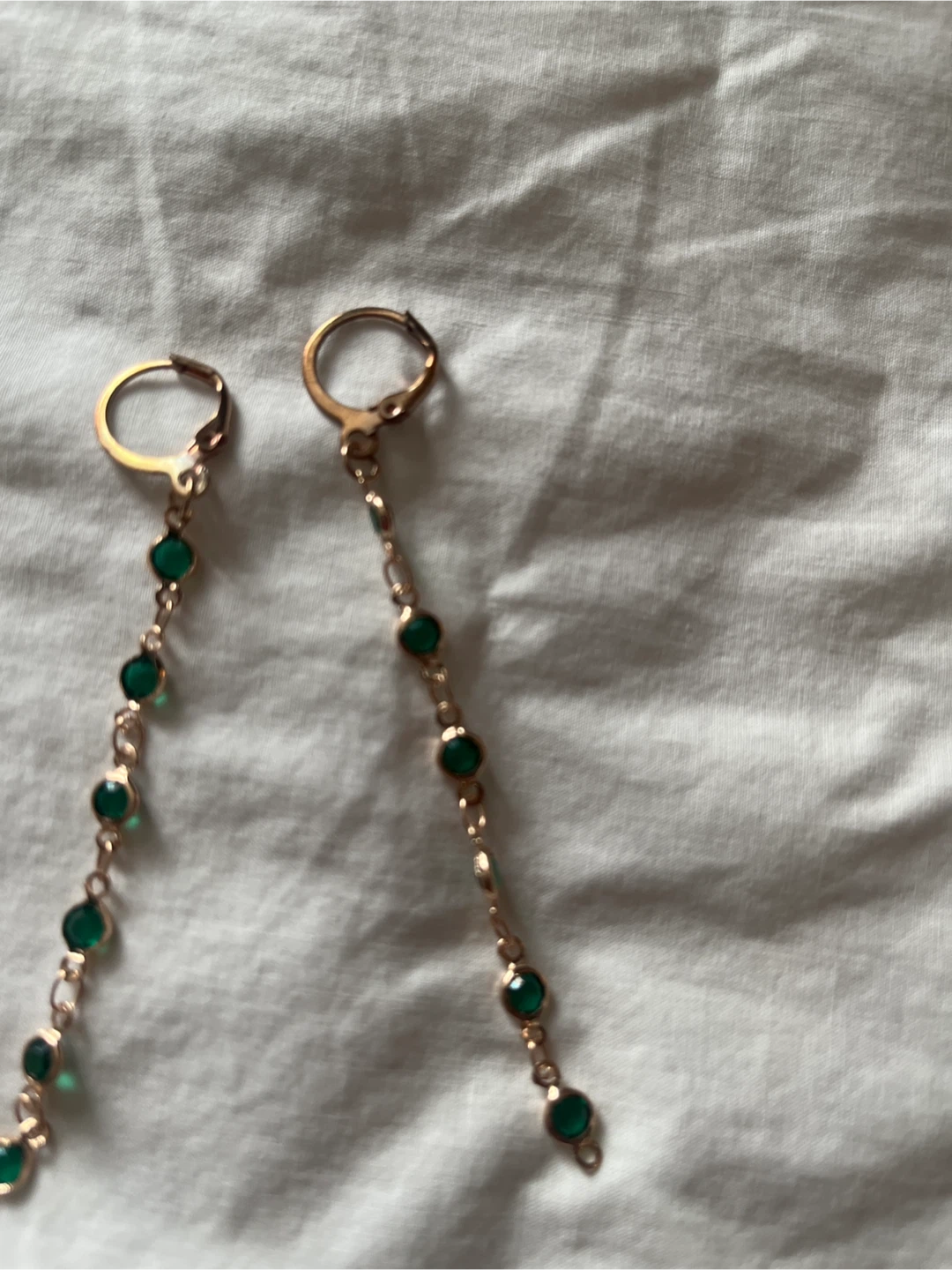 Selling a pair of drop earrings. They have a gold-tone chain with small green beads going down the length. They are new!