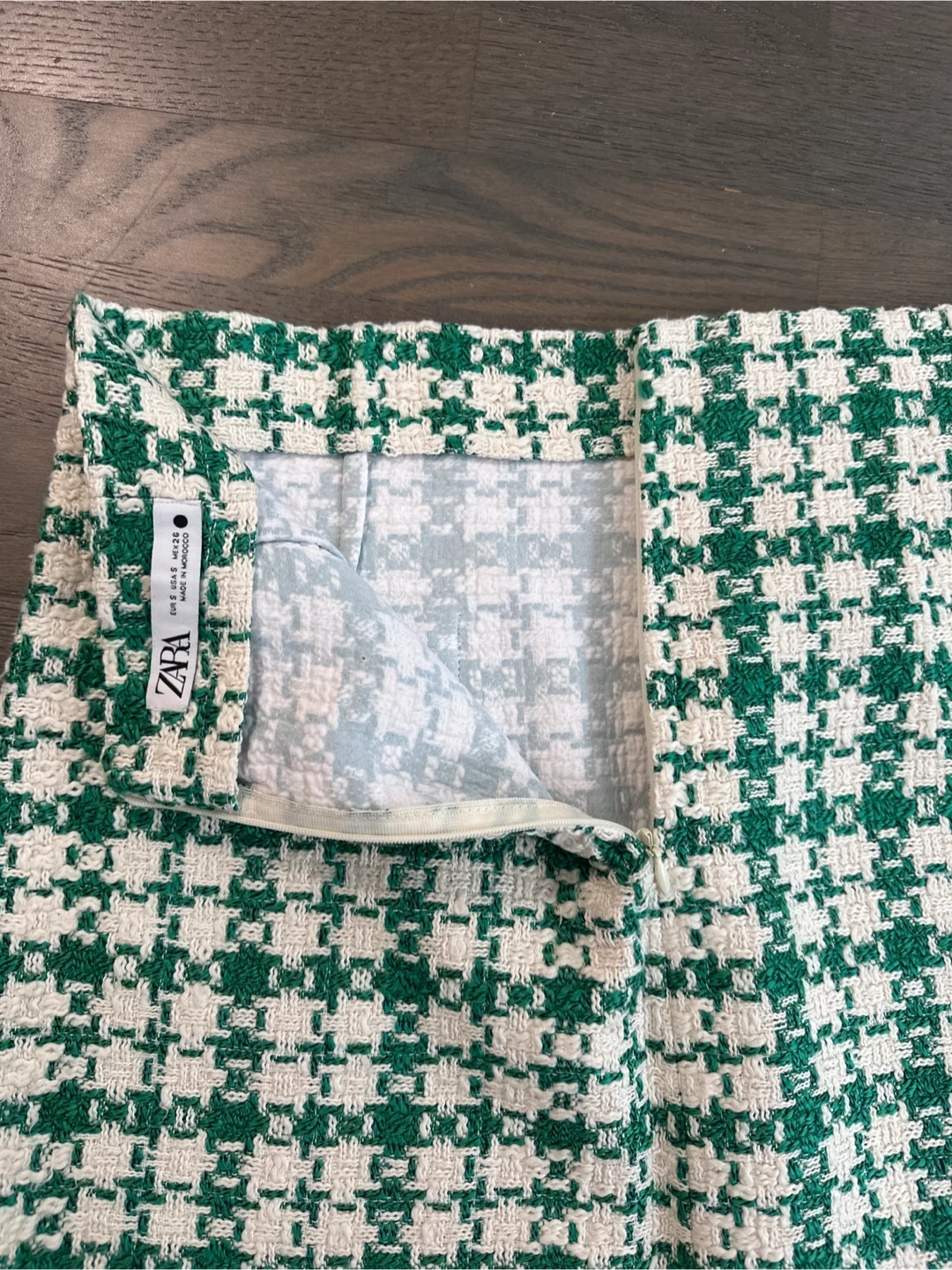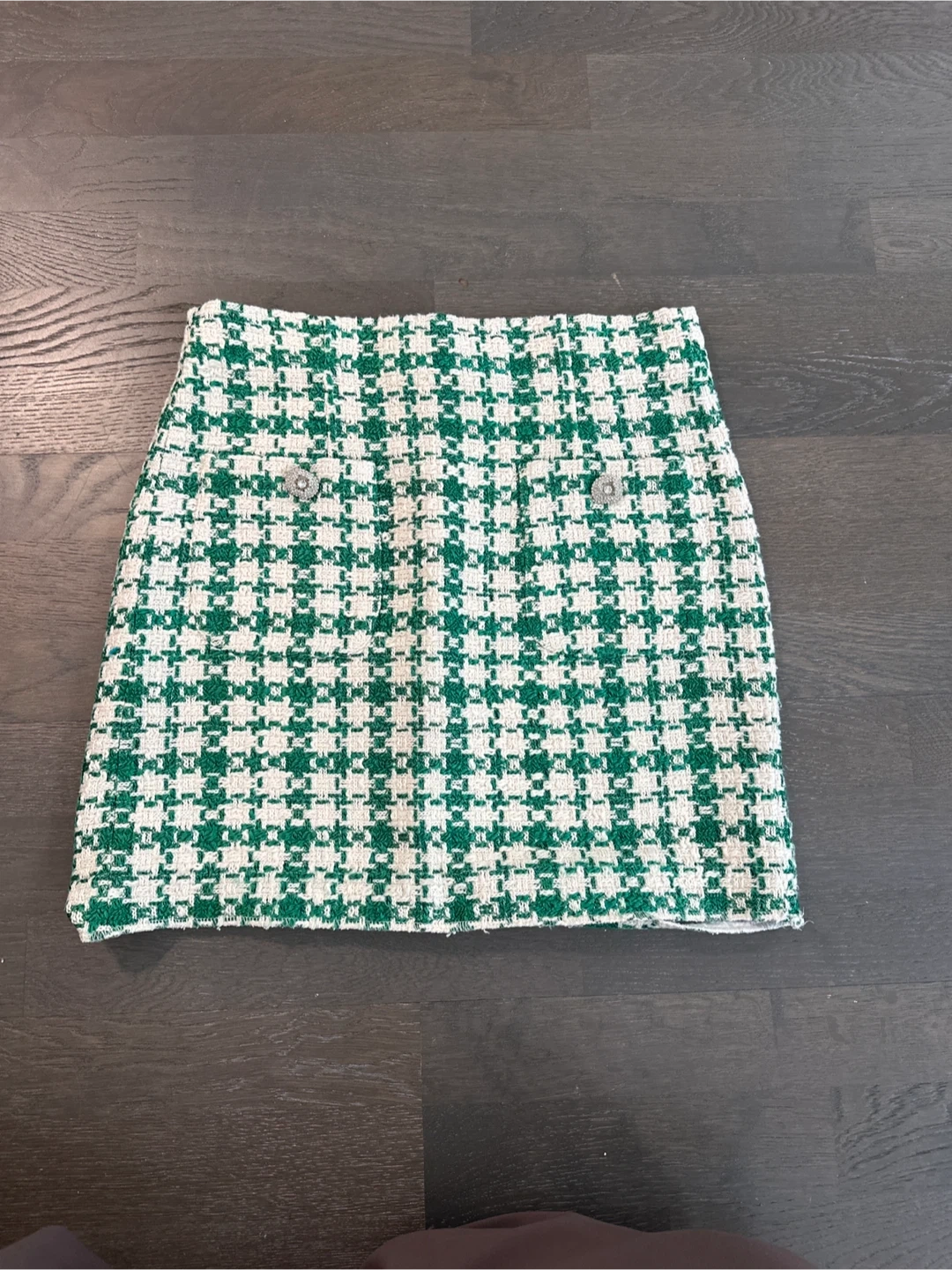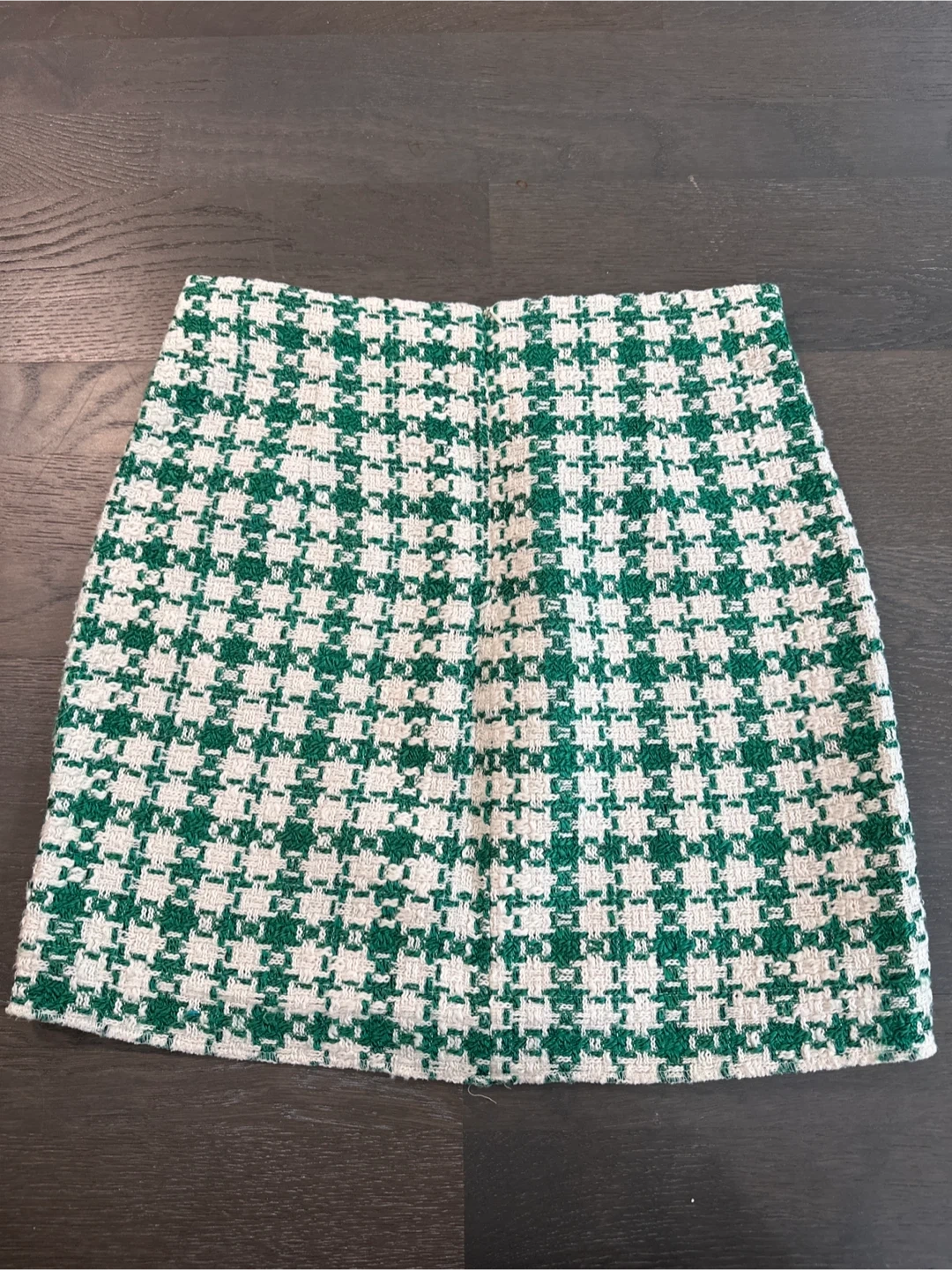 Selling a Zara houndstooth mini skirt in size S. It's a stylish and trendy piece that's perfect for adding a touch of sophistication to your wardrobe. The green and white houndstooth pattern is eye-catching and versatile, making it easy to pair with different tops and shoes. It's in great condition and ready for a new owner!