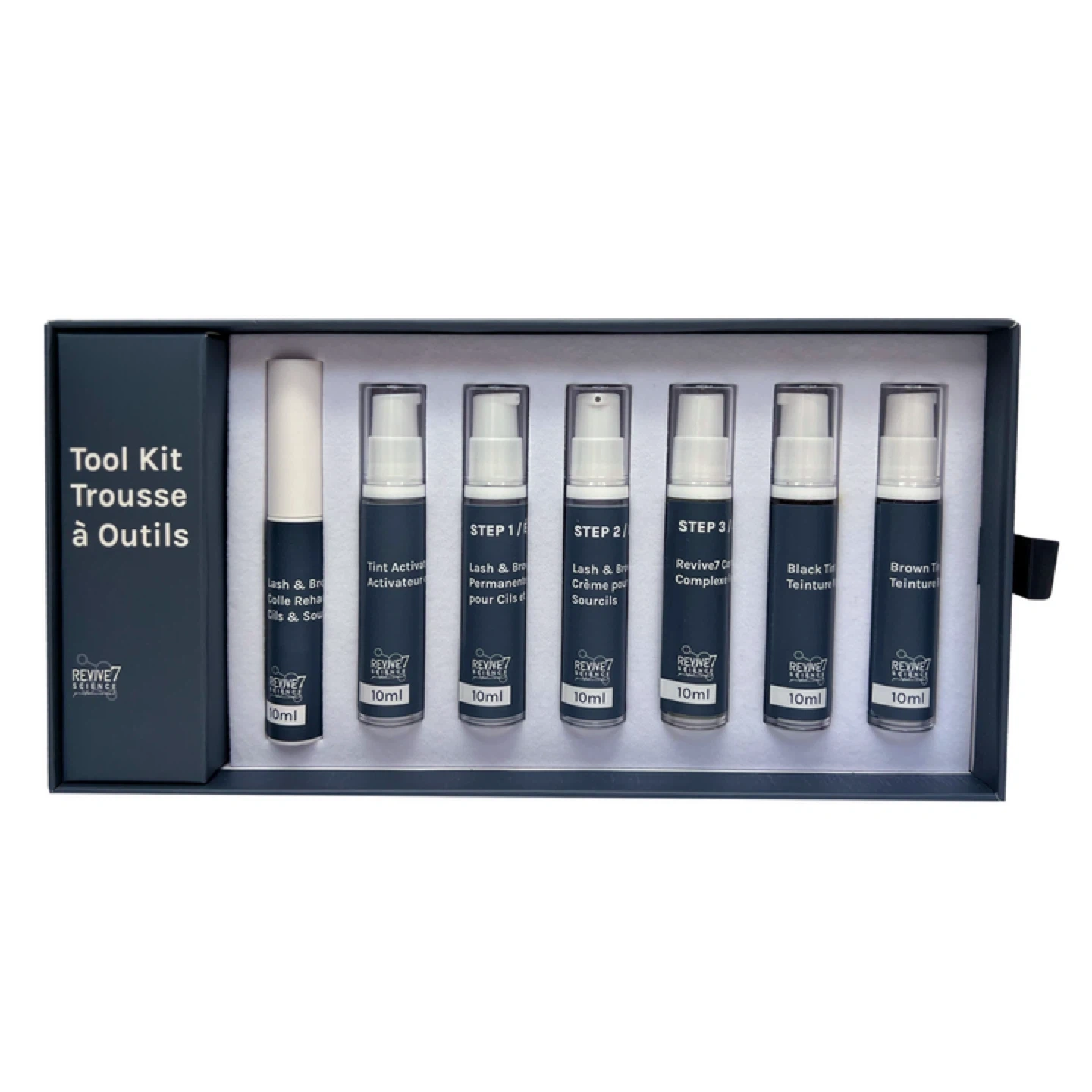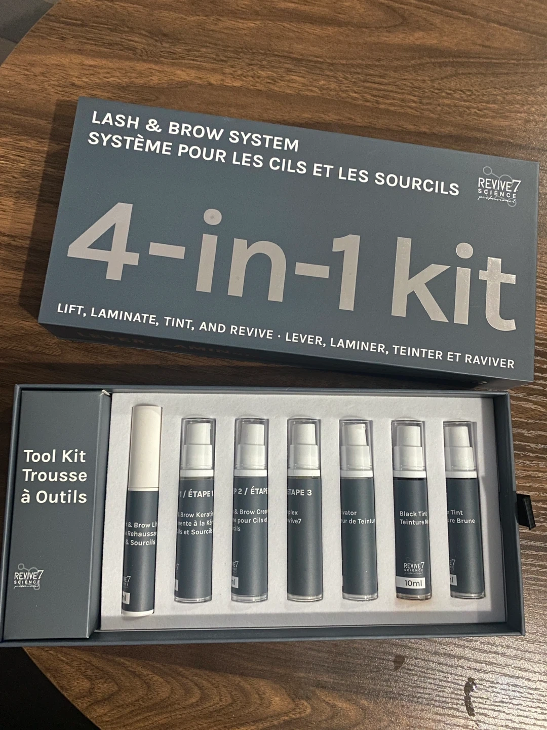 Revive7 Science Professional 4-in-1 kit: Lift, Laminate, Tint, and Revive includes everything needed to enhance lashes and brows. Perform Lash Lifts, Brow Laminations, and Lash and Brow Tints. Revives lashes and brows, too. Each product in this kit is infused with Revive7 Science's triple-award winning formula to nourish and strengthen lashes and brows with every step. Lash Lift and Brow Laminations using Revive7 Science Professional 4-in-1 system last up to eight weeks. From start to finish, your full application time for all treatments is less than 60 minutes offering your clients gentle, fast, and beautiful results. Up to 40 applications.