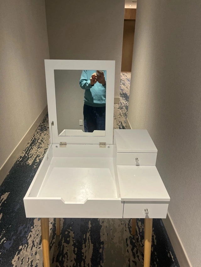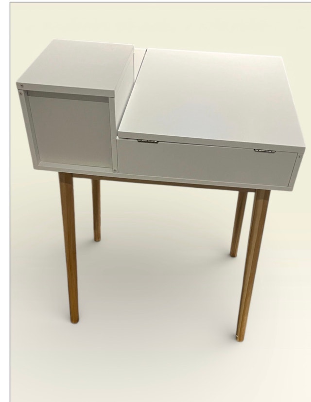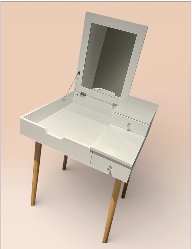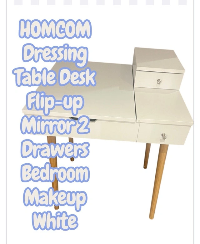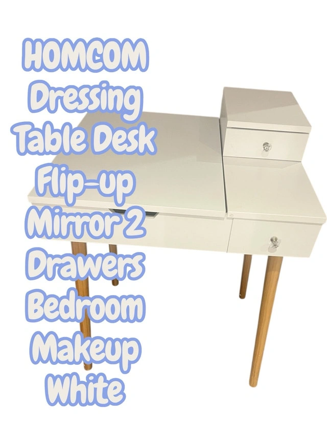 I'm selling a used HOMCOM dressing table desk with a flip-up mirror and two drawers, perfect for bedroom makeup organization. The desk is in good condition and features a sleek, white finish with stylish wooden legs, blending seamlessly with any decor. Key features include: - Flip-up mirror design - Two drawers for storage - Versatile as both a dressing table and a desk - Compact size ideal for smaller spaces - Elegant white finish with wooden accents. If you see this ad, it's still available!