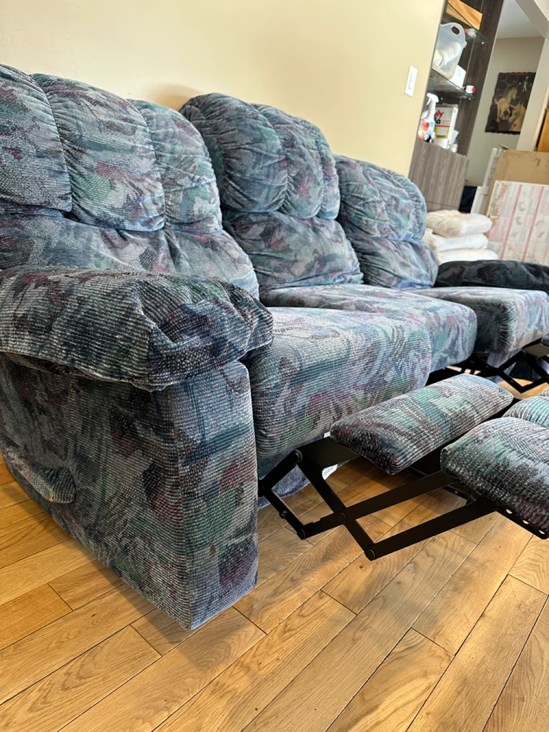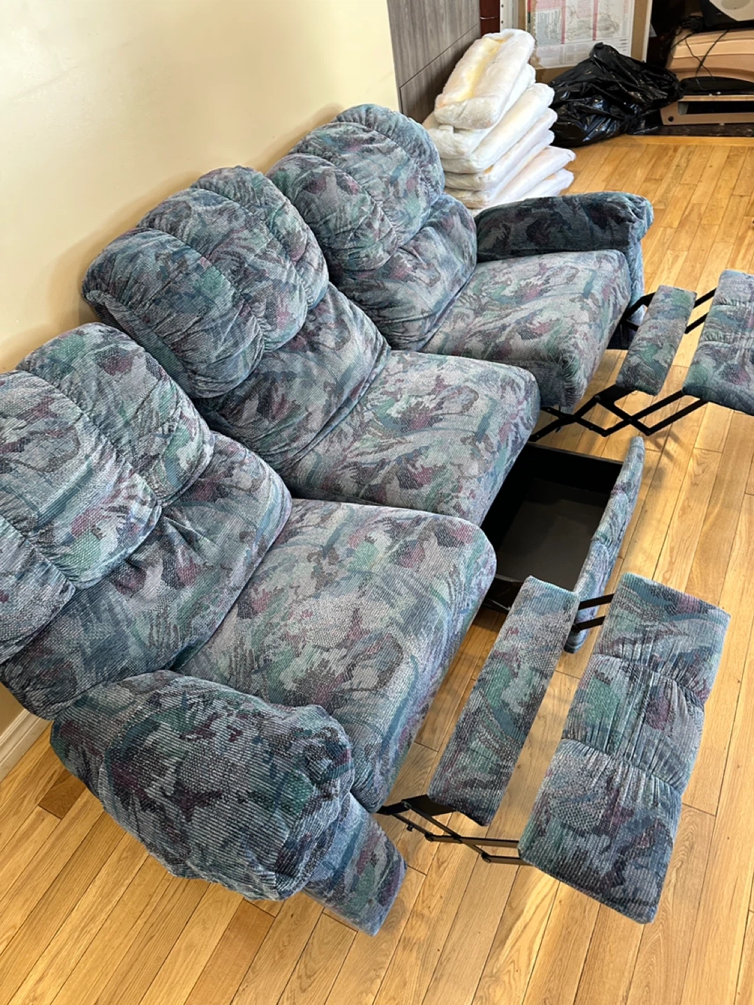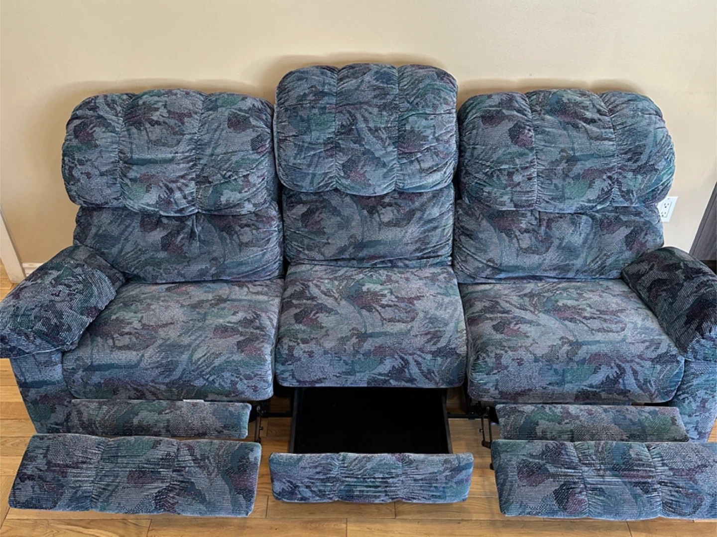 Comfortable and solid Elran reclining sofa in excellent condition. Both end seats recline smoothly, and the center console includes built-in storage, perfect for remotes, blankets, or accessories. Extremely comfortable and built to last—Elran is a respected Canadian manufacturer known for quality craftsmanship.