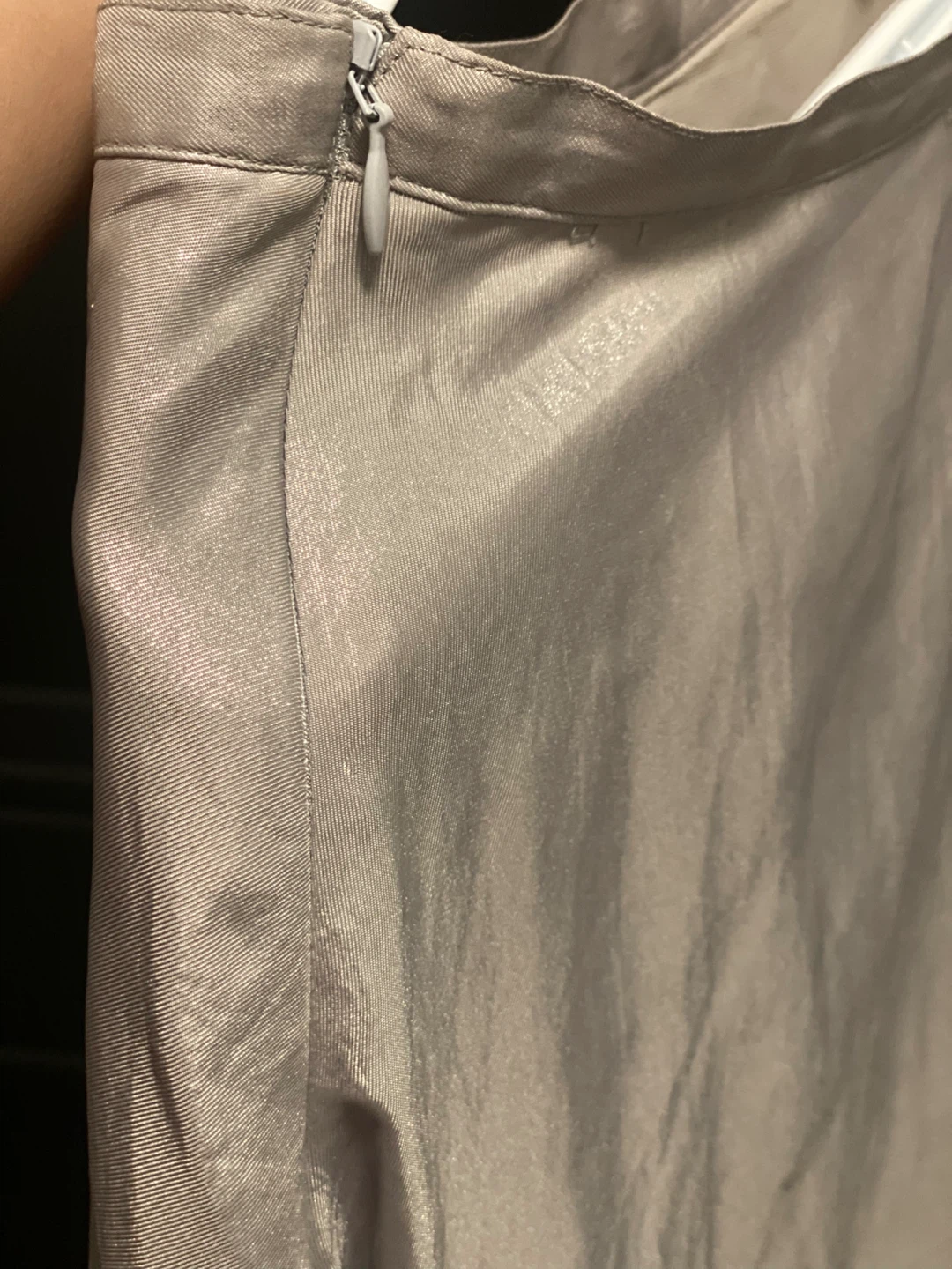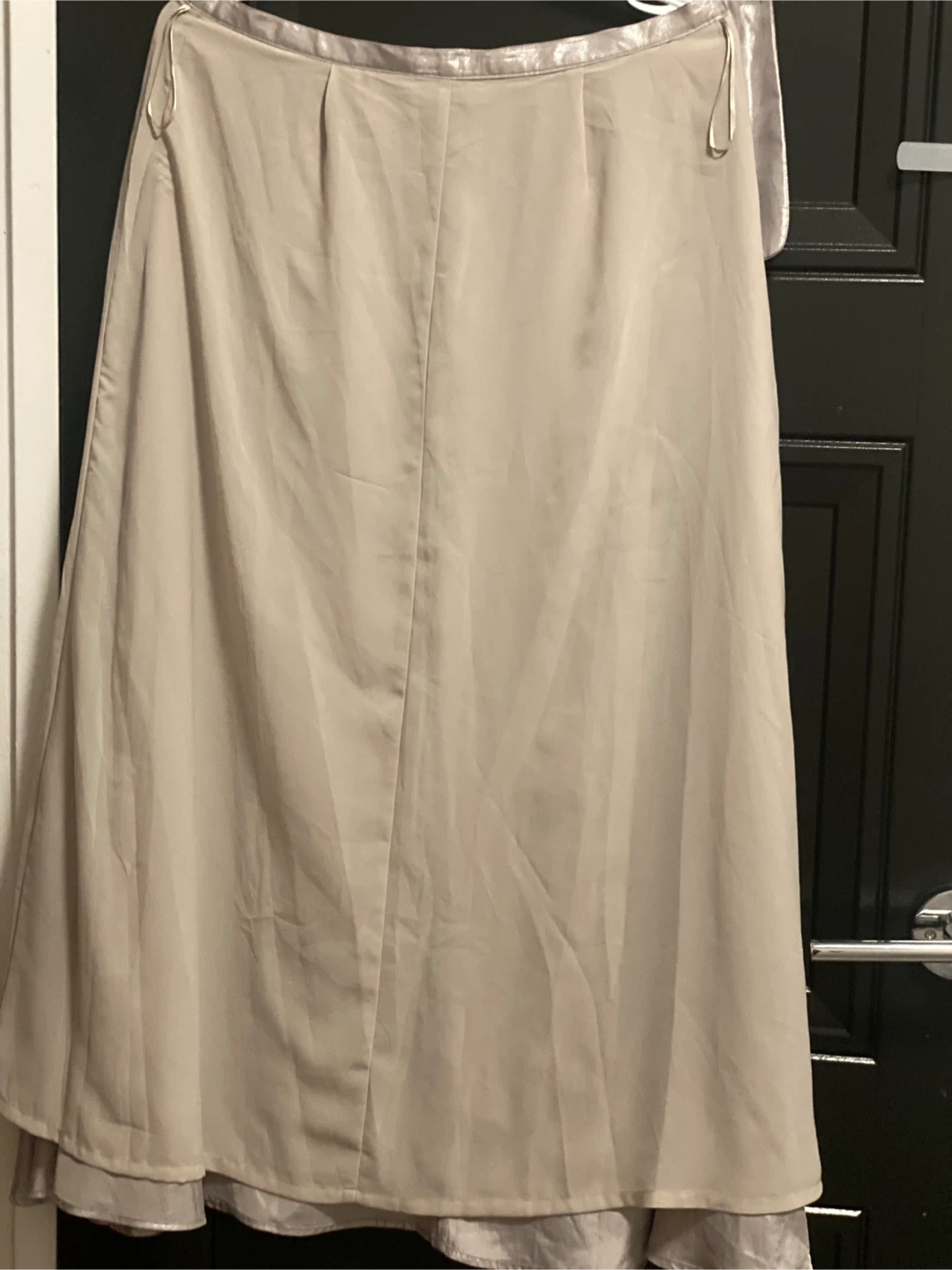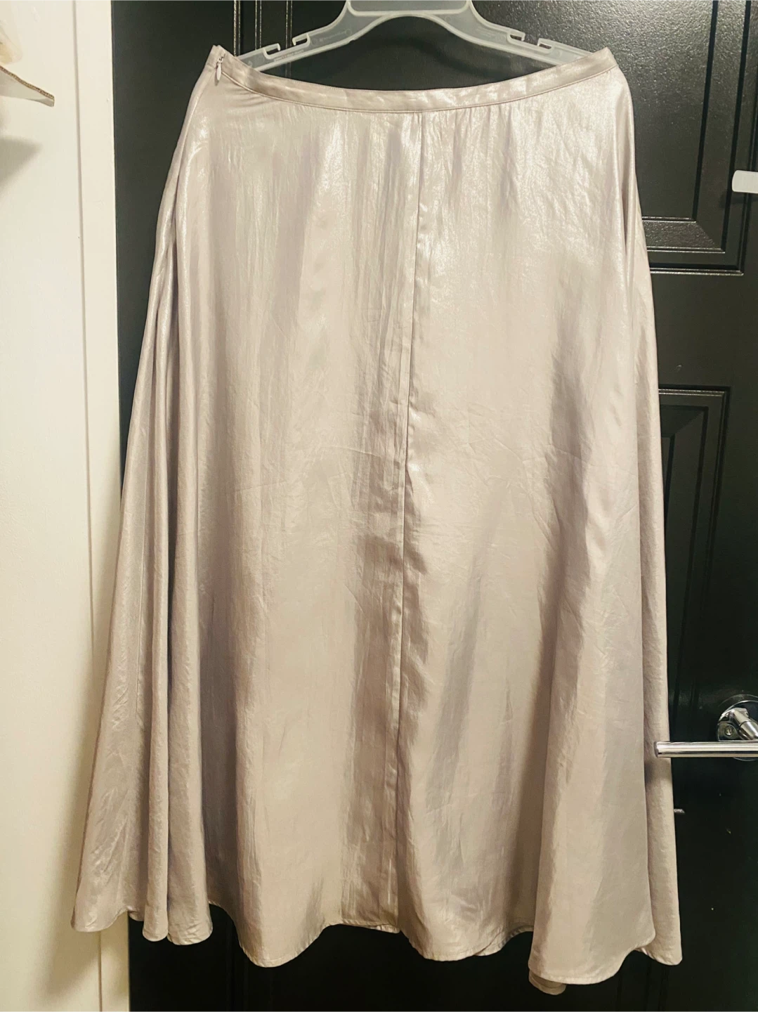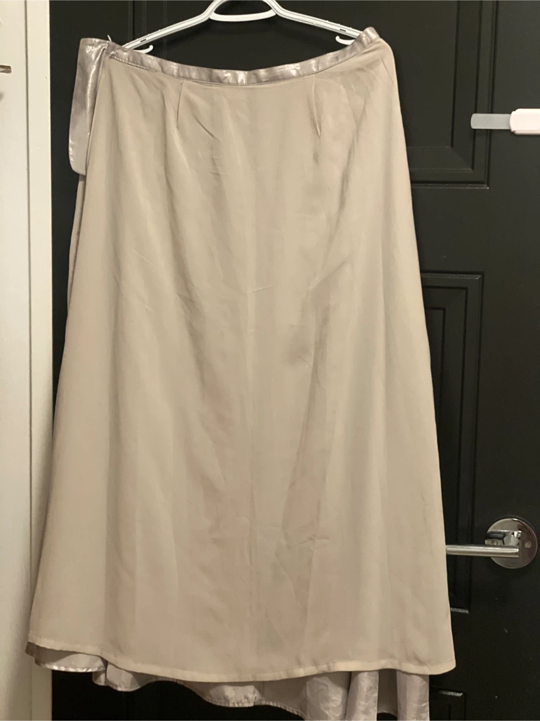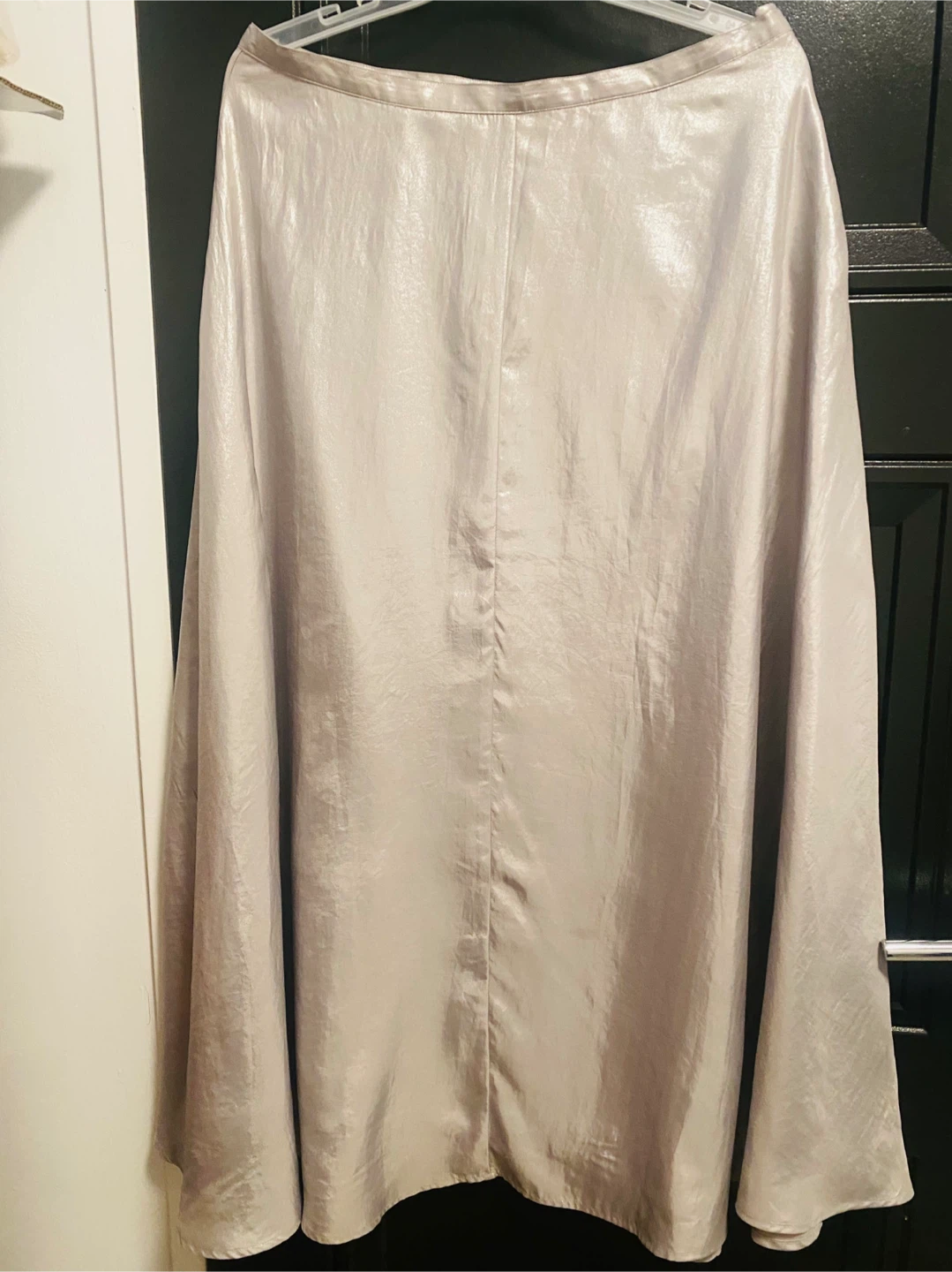 Add some shimmer to your wardrobe with this beautiful, pre-owned silver skirt. This skirt features a flowing A-line shape and a subtle metallic sheen, making it perfect for evening events or adding a touch of glamour to your everyday look. It's in good condition.