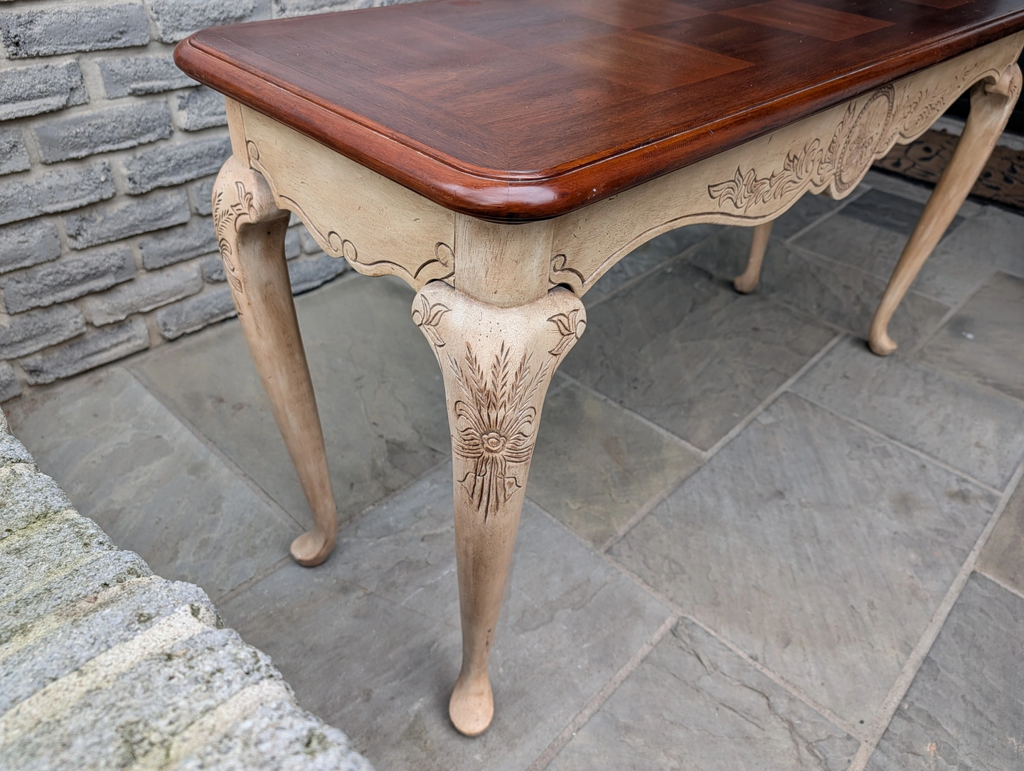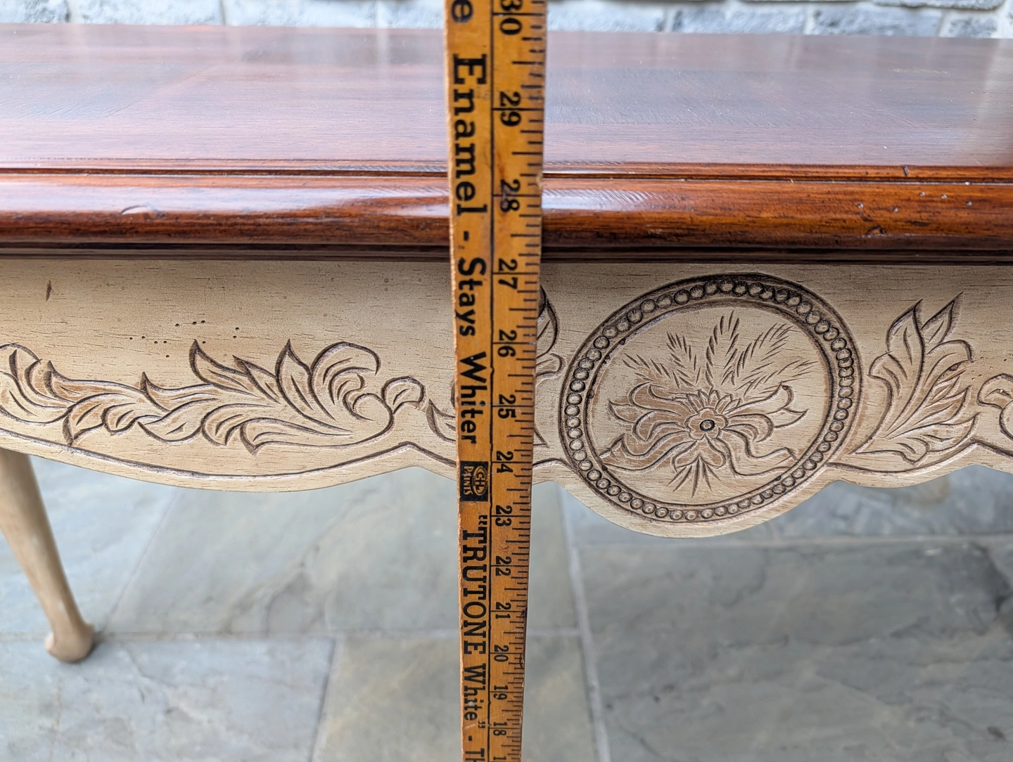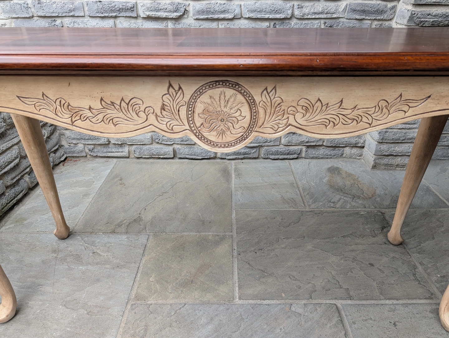 Ornate accent side table with engraved carved out design on the wood base. Good hallway or behind the couch table. Some light wear on the table top finish. Good, clean condition. 1 available only. Pick up in Guelph Line and Upper Middle Rd area of Burlington.
