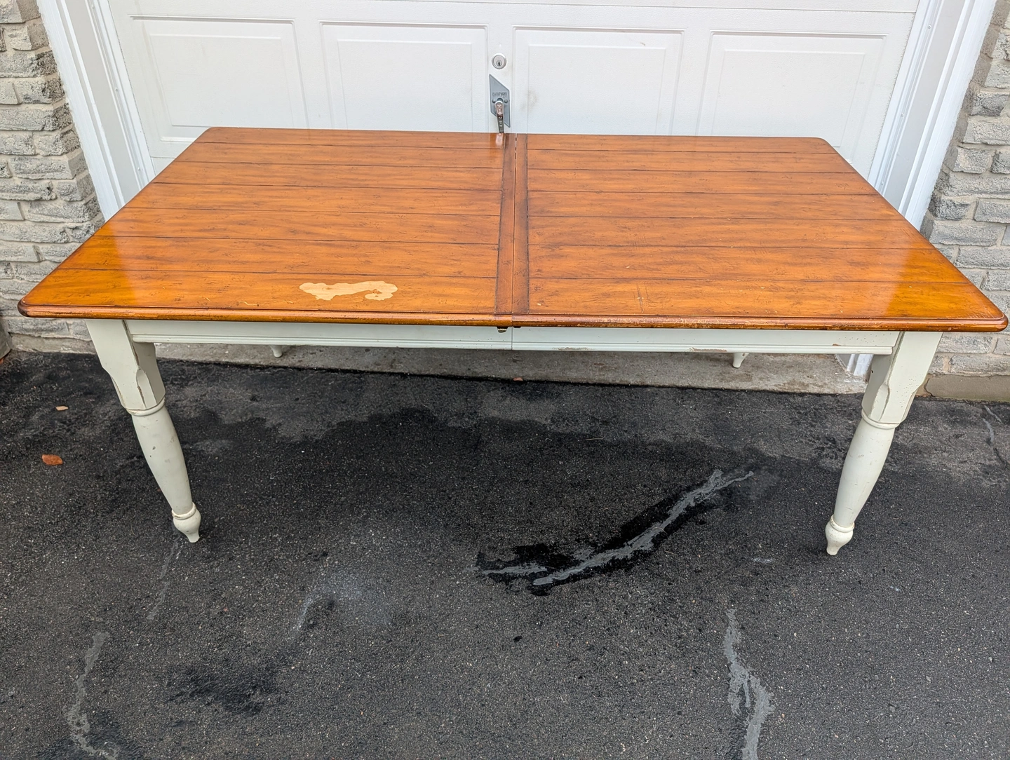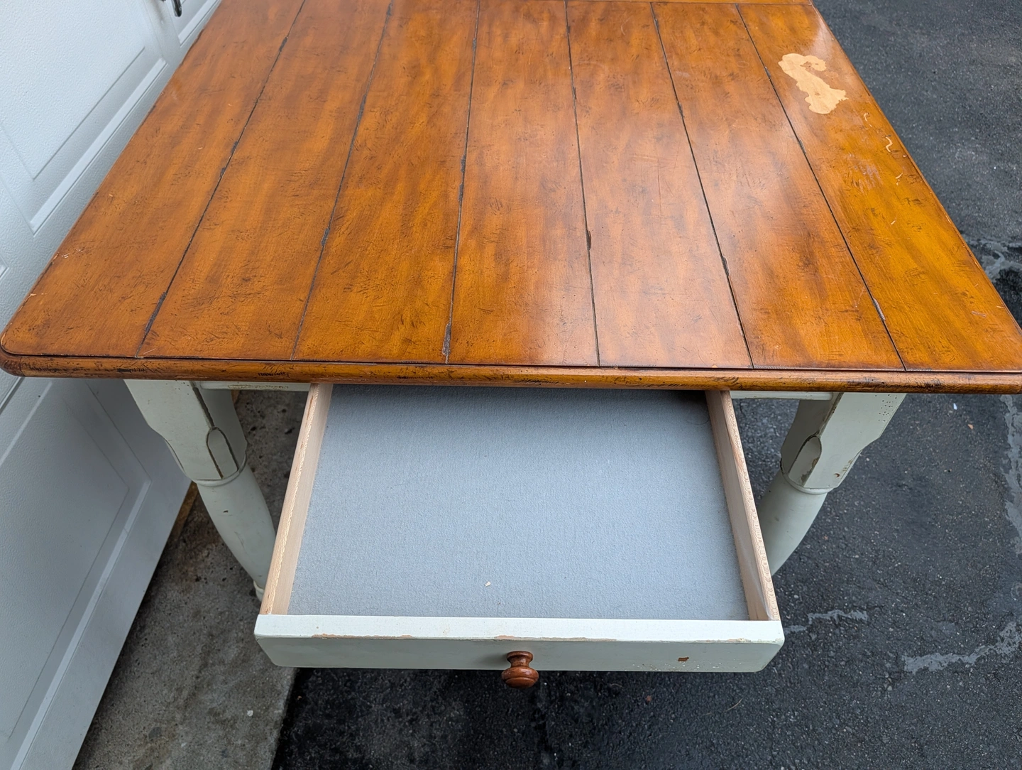 Large solid pine wood, country Harvest style kitchen table with leaf and end cutlery drawers. From Drexel Studio Furniture Company. Heavy duty table with some weathering and noticeable wear on the table top. Beautiful and usable as is or refinish. Legs come off for easier transport. Pick up only in the Guelph Line and Upper Middle Rd area in Burlington.