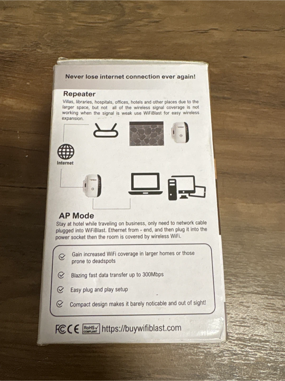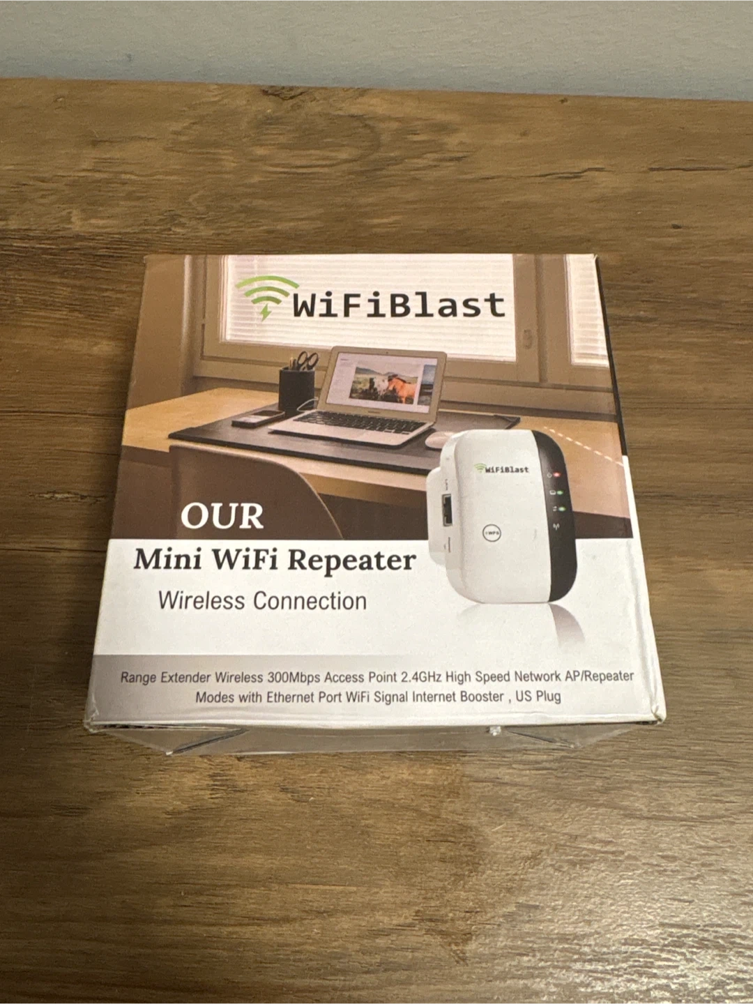 Selling a WiFiBlast Mini WiFi Repeater for wireless connection! It's a range extender with 300Mbps Access Point, 2.4GHz High Speed Network AP/Repeater, and modes with Ethernet Port WiFi Signal Internet Booster, US Plug. It helps to gain increased WiFi coverage in larger homes or those prone to deadspots, blazing fast data transfer up to 300Mbps, easy plug and play setup, compact design makes it barely noticeable and out of sight! Perfect for mobile connections: Improve your mobile WiFi speeds by up to 100%! The internal antennas extend WiFi coverage throughout large homes and even backyards. It comes with the box and an ethernet cable