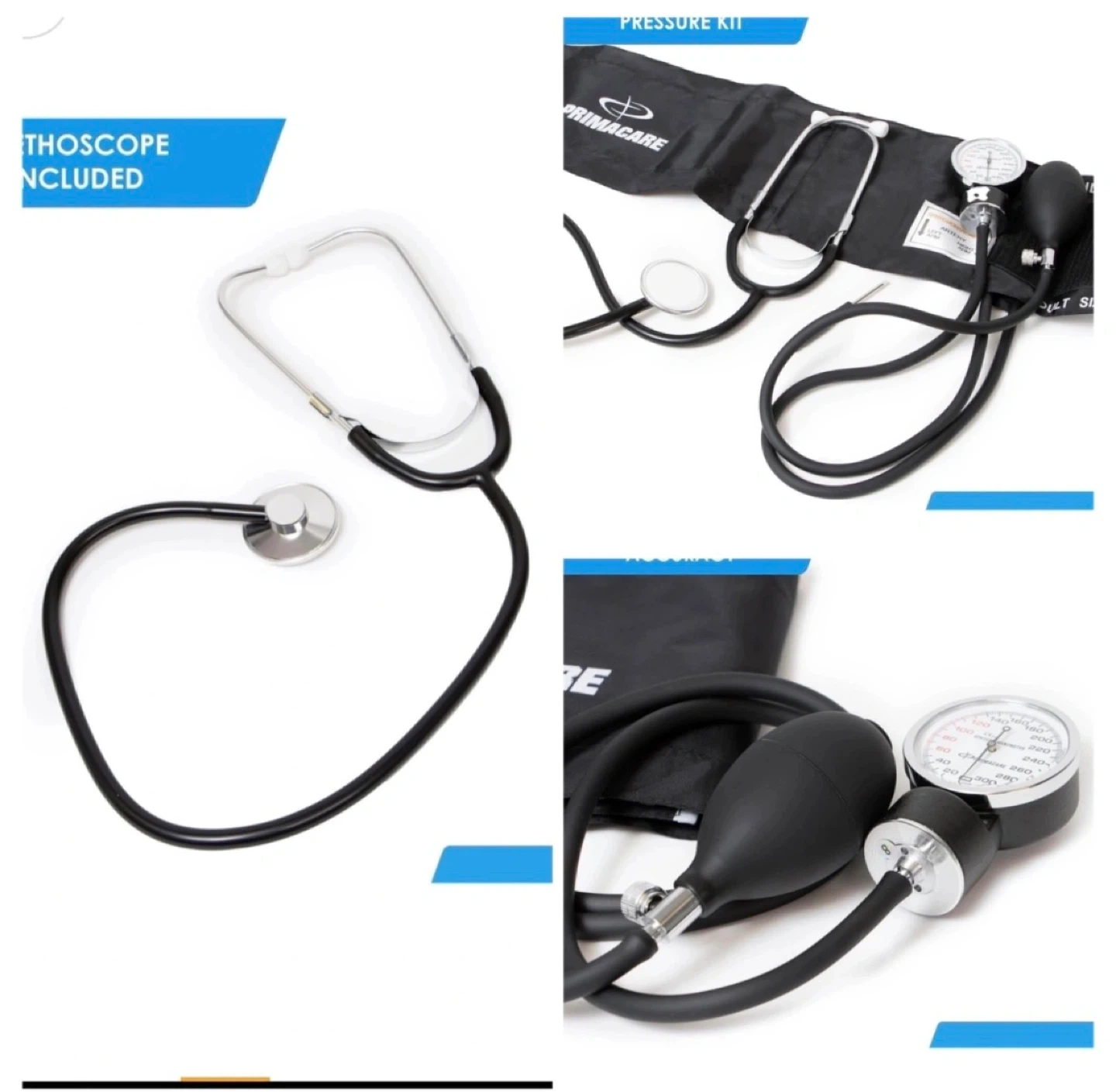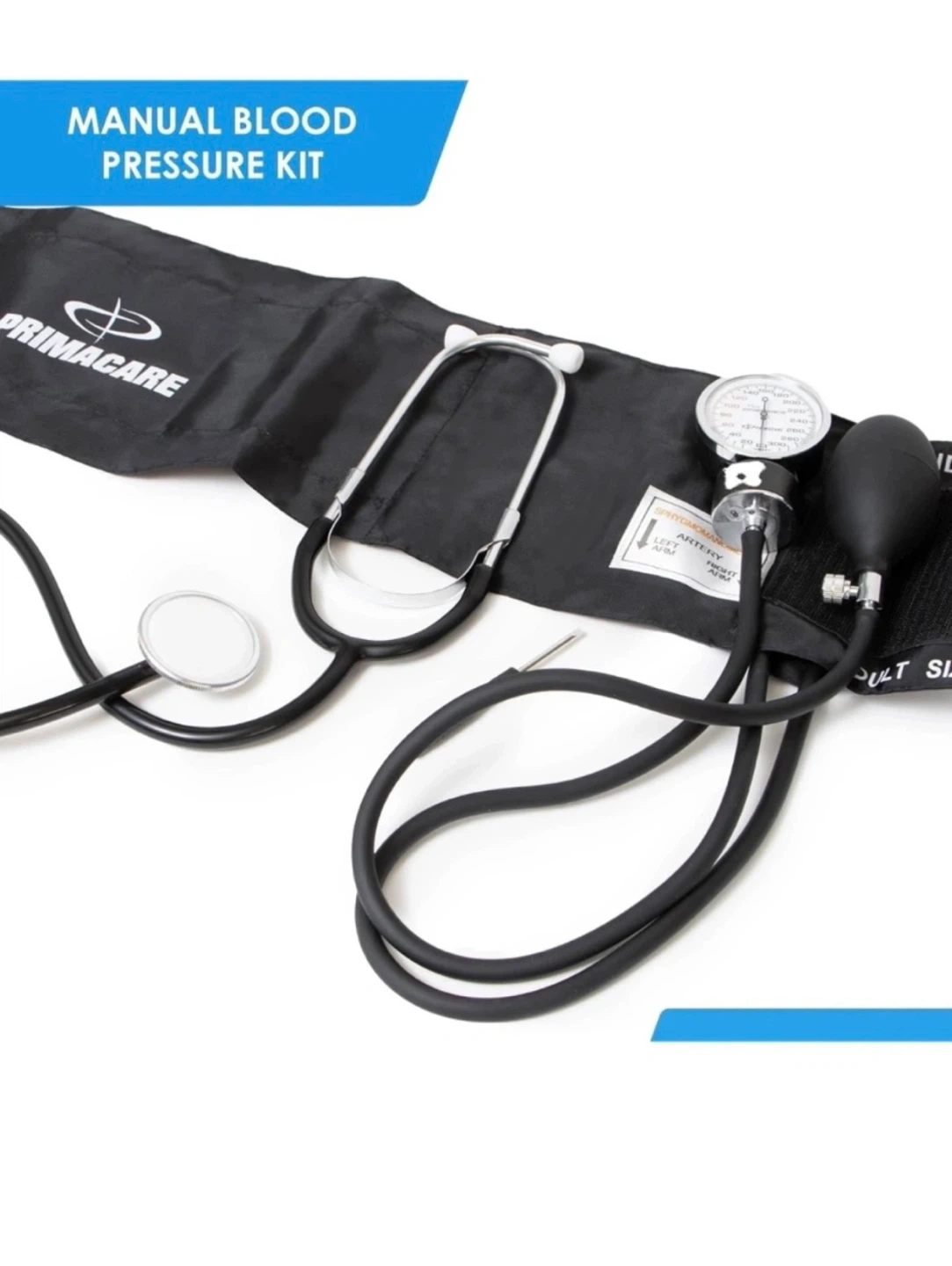 Primacare manual blood pressure kit. It includes the stethoscope and all the necessary components for taking blood pressure readings at home. Great for healthcare professionals or anyone who needs to monitor their blood pressure regularly
