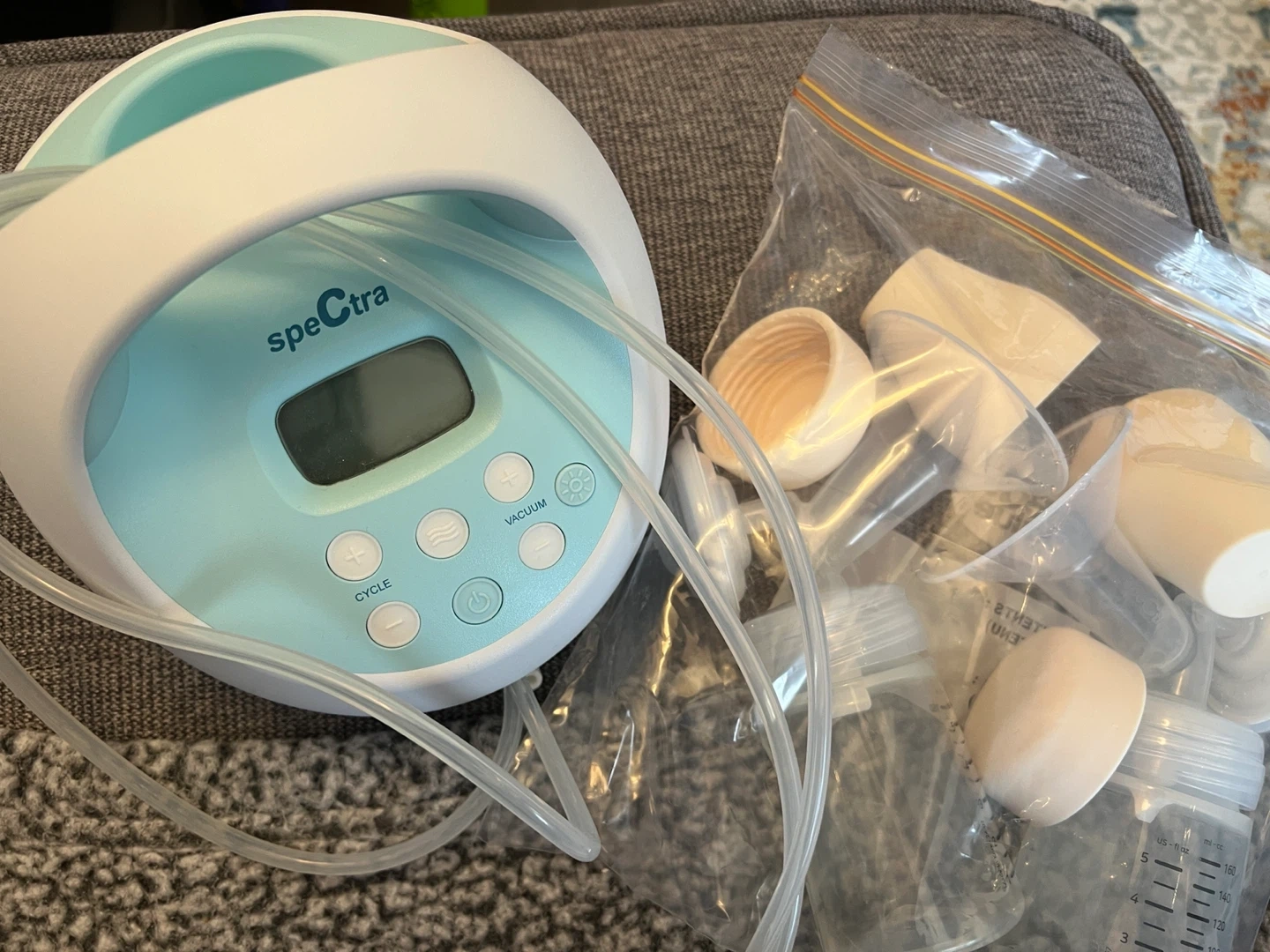 Selling Spectra S1 breast pump. It comes with all the accessories pictured, including bottles and various flange sizes. Great pump, adjustable settings and comfortable to use. Battery lasts long. Used lightly as my baby directly latched so I no longer needed to pump. Can include extra milk freezer storage bags as a freebie.