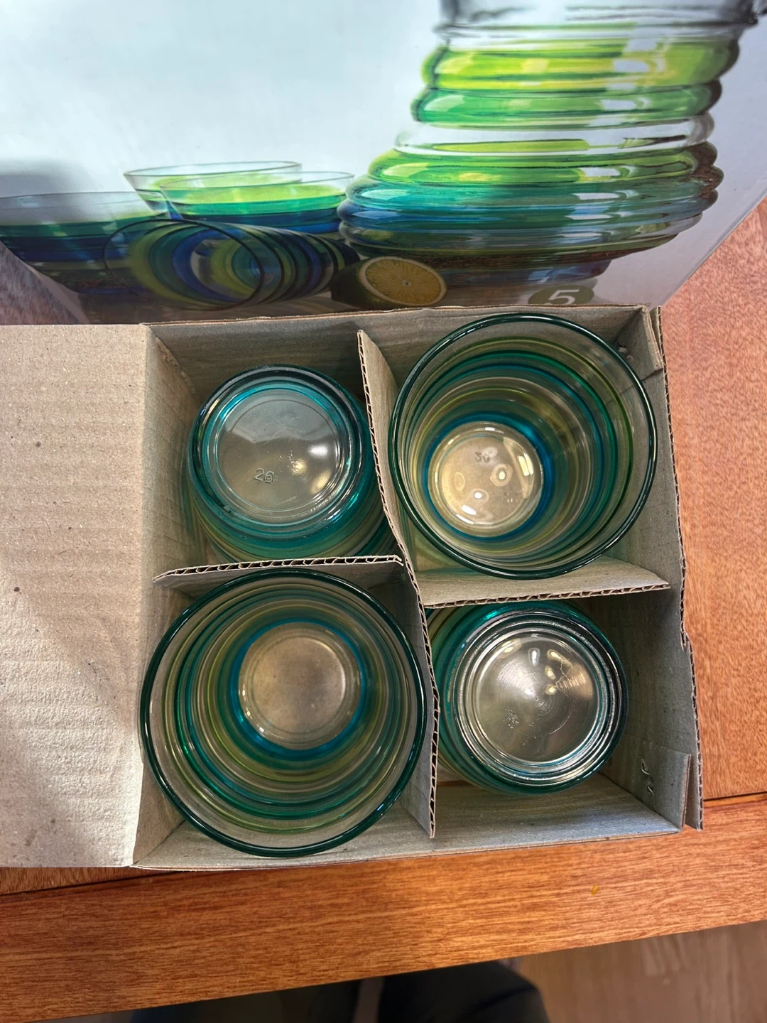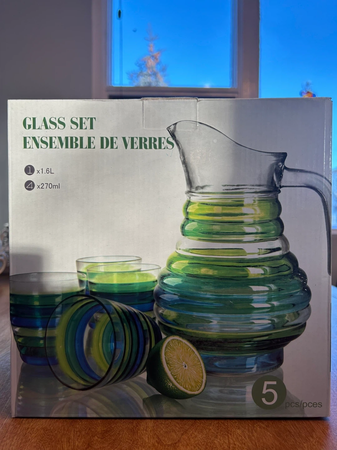 Selling a glass set that includes one pitcher and four glasses. It comes in its original box! Never been used! Selling for $25 best offer