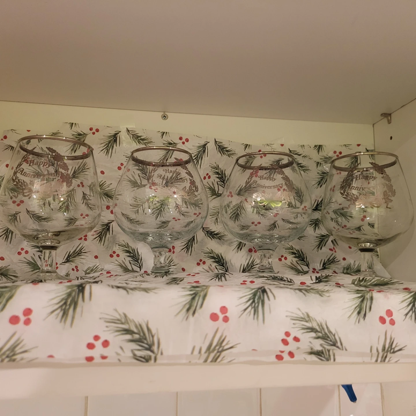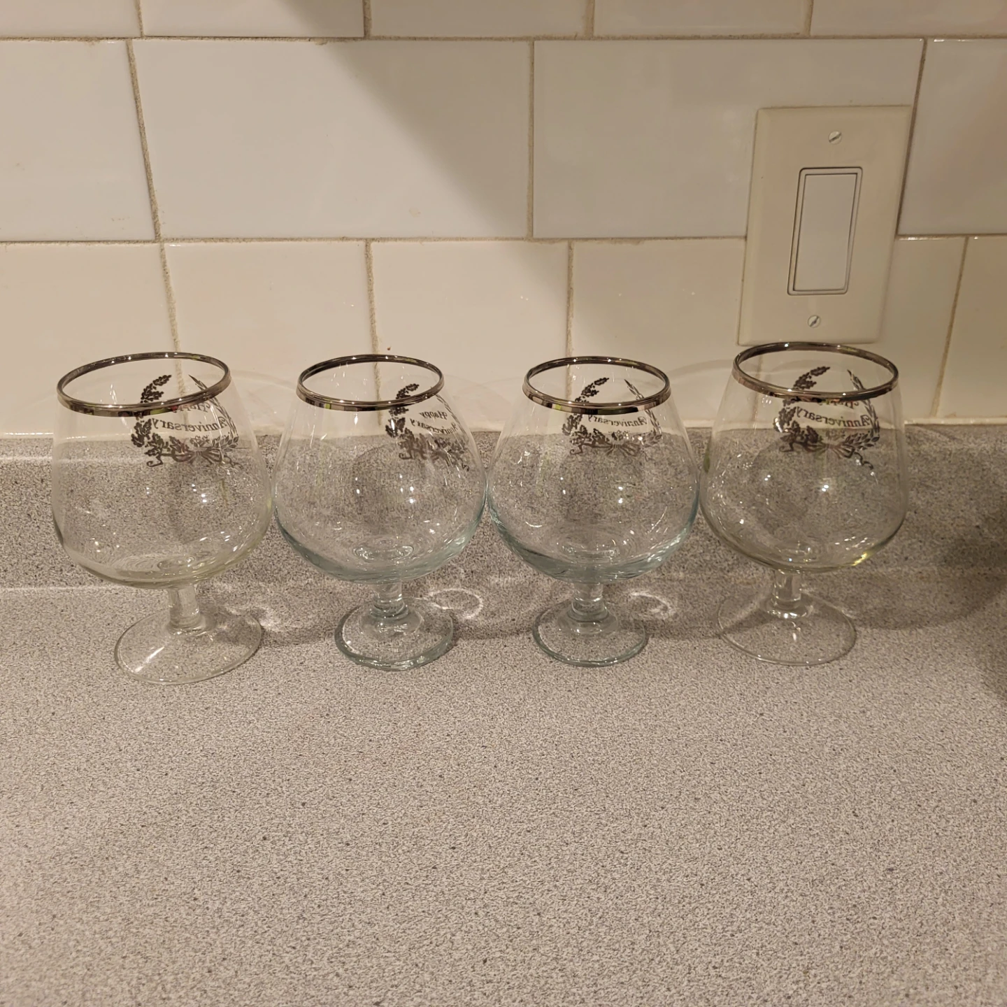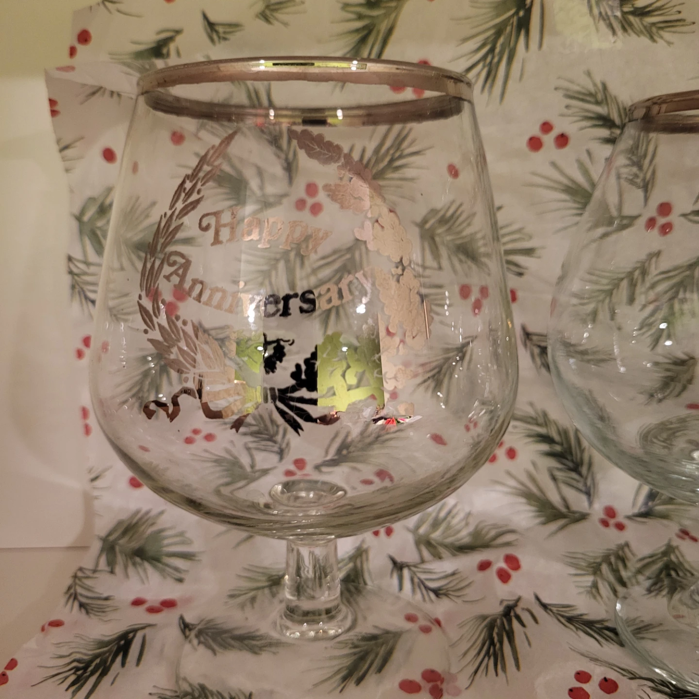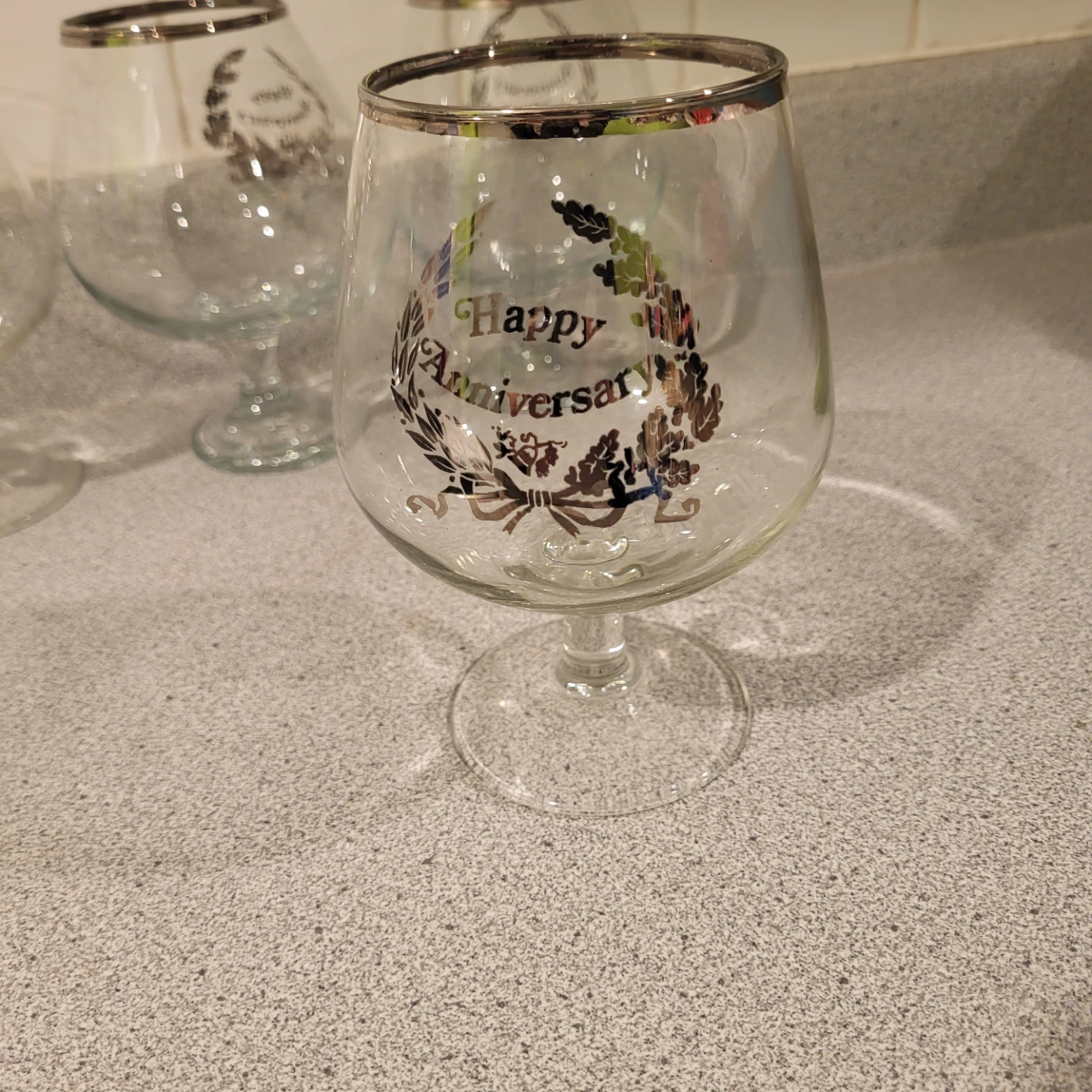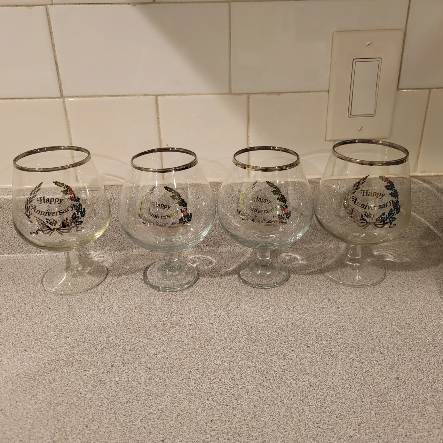 Selling a set of four brandy glasses, each decorated with a 'Happy Anniversary' design. They have a silver rim and are in great condition, perfect for celebrating special occasions!