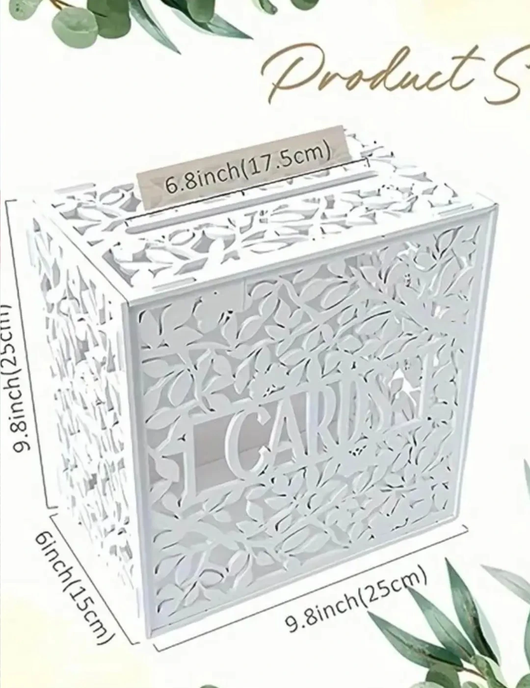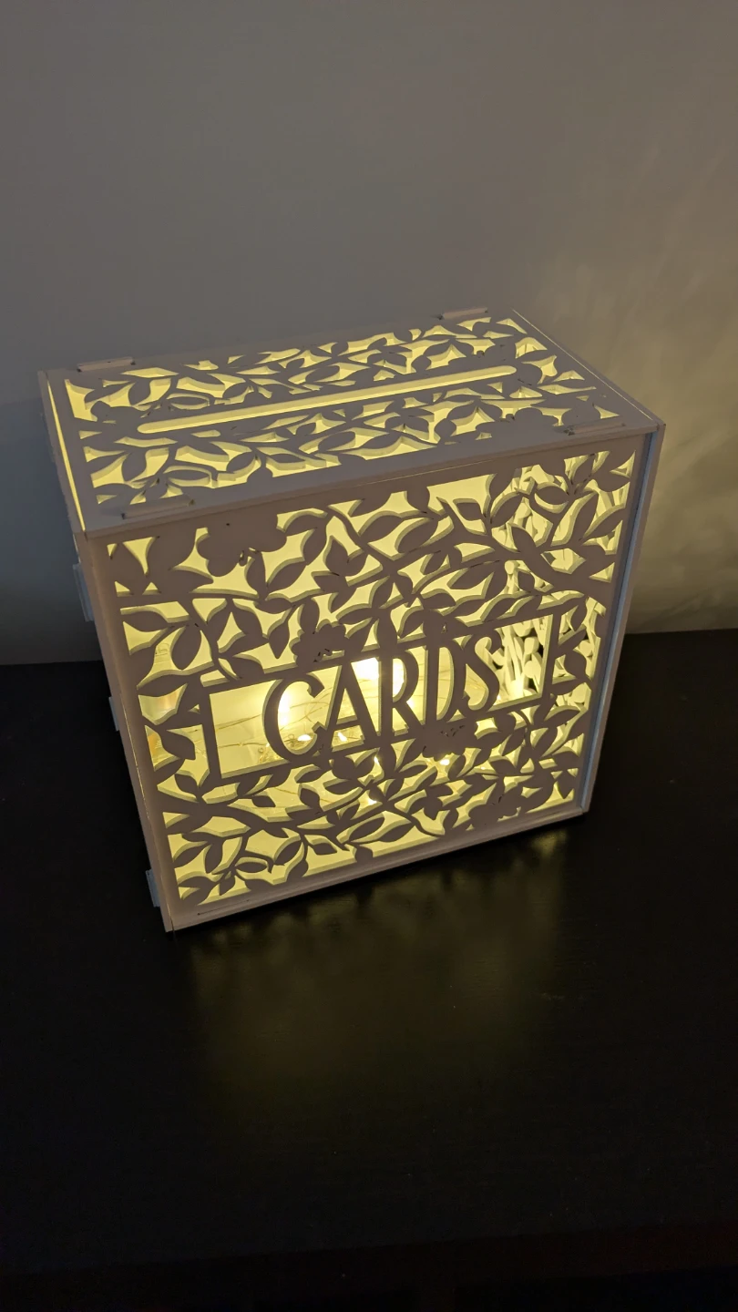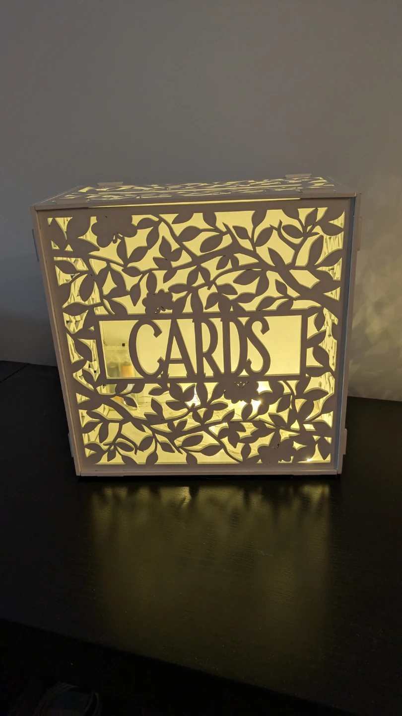 Selling a gorgeous white wedding card box with a delicate floral design! Fairy lights will be included for free. It's perfect for collecting cards at your wedding reception.