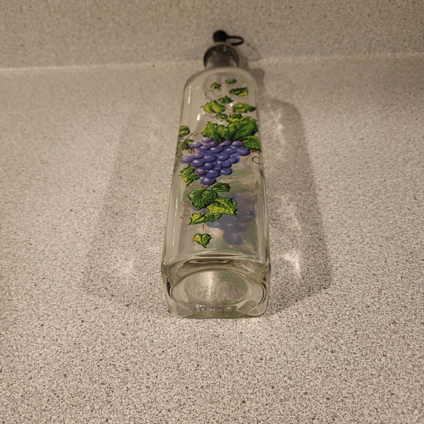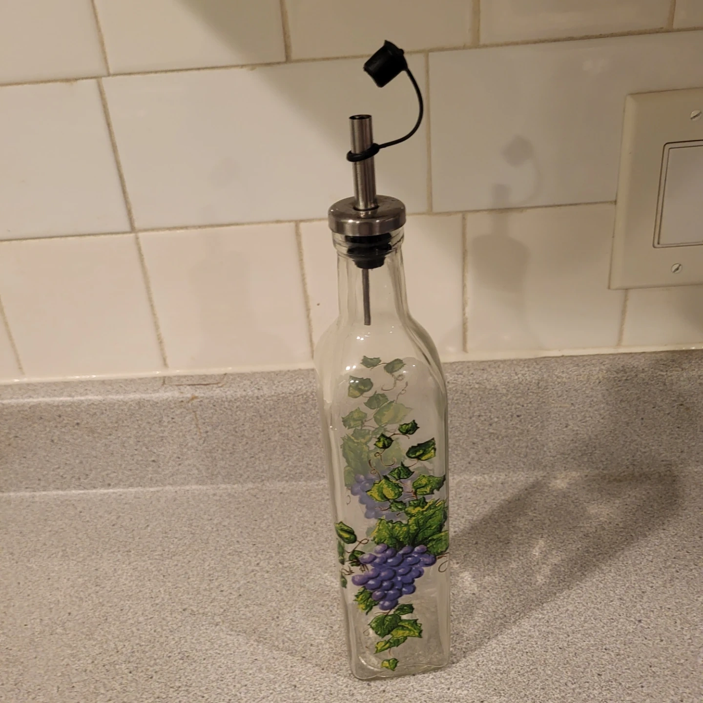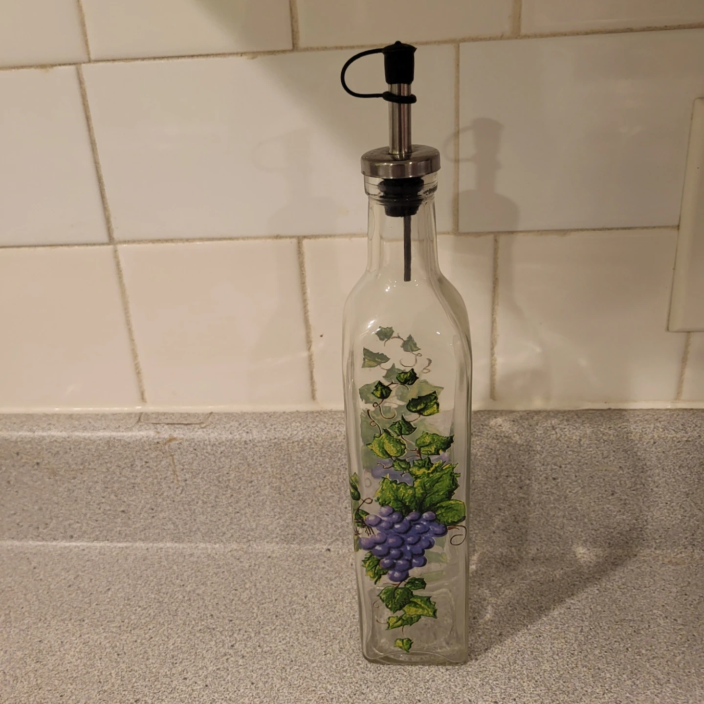 Here's a lovely olive oil dispenser, perfect for adding a touch of charm to your kitchen! It features a grape design and is in great condition. It has a stainless steel spout with a cap.