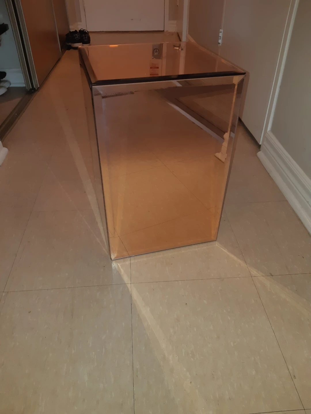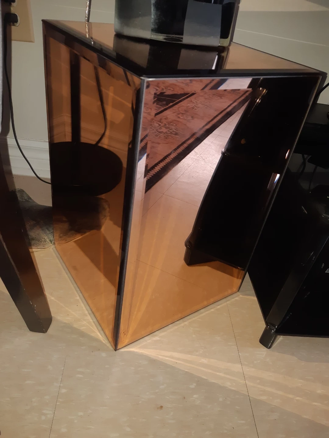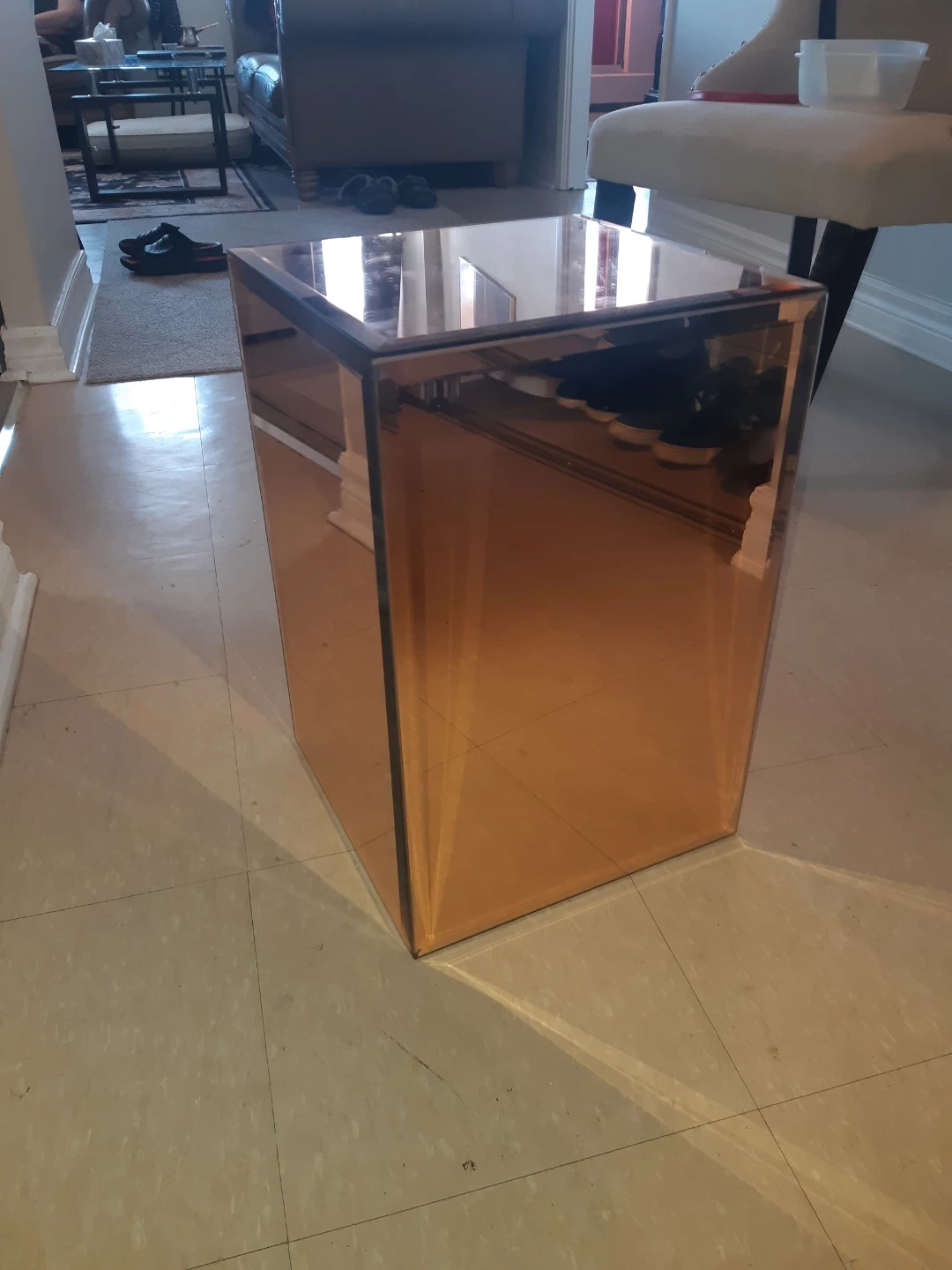 Selling a unique copper mirrored accent table! This eye-catching piece adds a touch of modern elegance to any room. Its mirrored surfaces create a beautiful reflective quality, making it a standout addition to your home decor