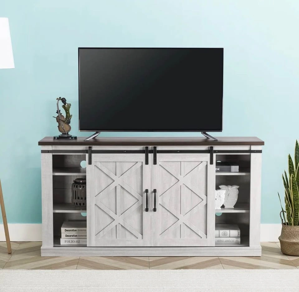 Beautiful modern farmhouse TV stand with sliding barn doors and wood finish. Solid, stylish, and perfect for condos or living rooms.