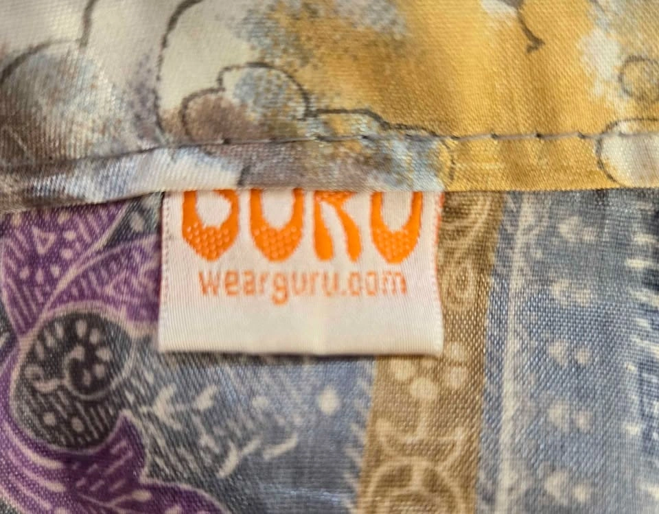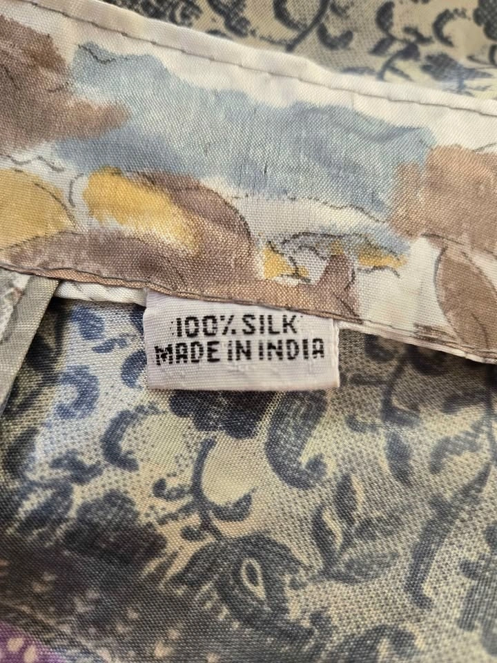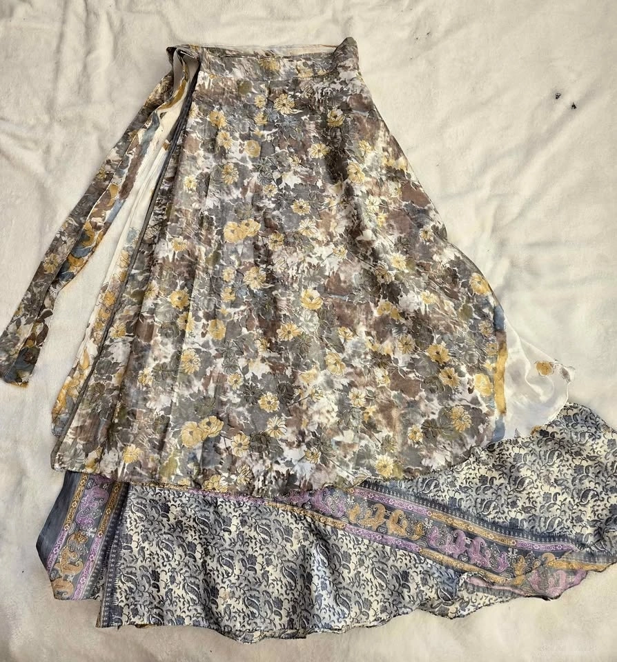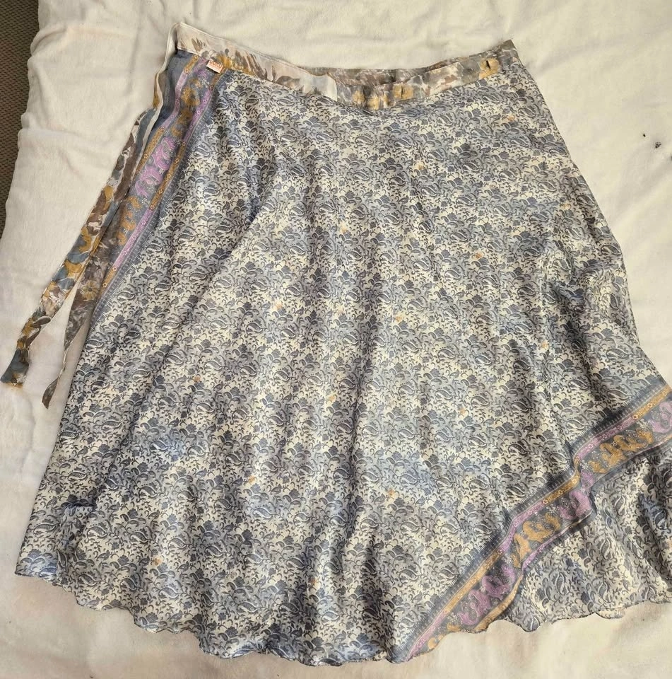 Reversible 100% silk wrap skirt by wearguru.com. Colours of light blue, gold, cream, and mauve. One size fits all.