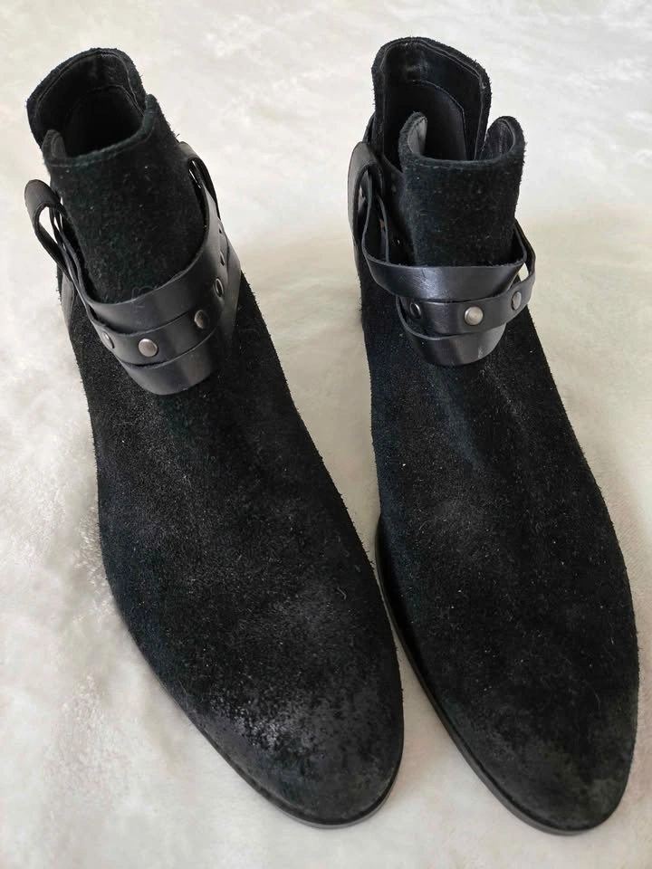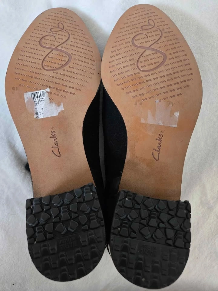 Black suede booties by Clarks Somerset. Decorative bands around the ankle. 2" heels. Slight scuffing on the toes which could be removed using a suede brush.