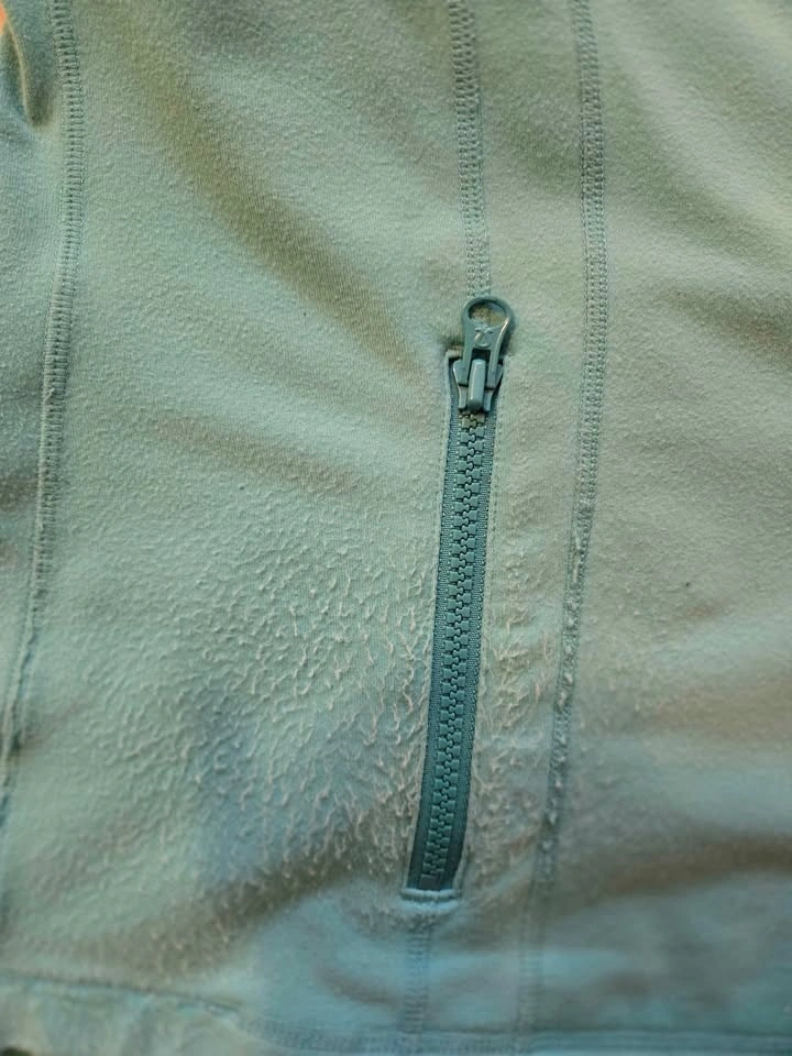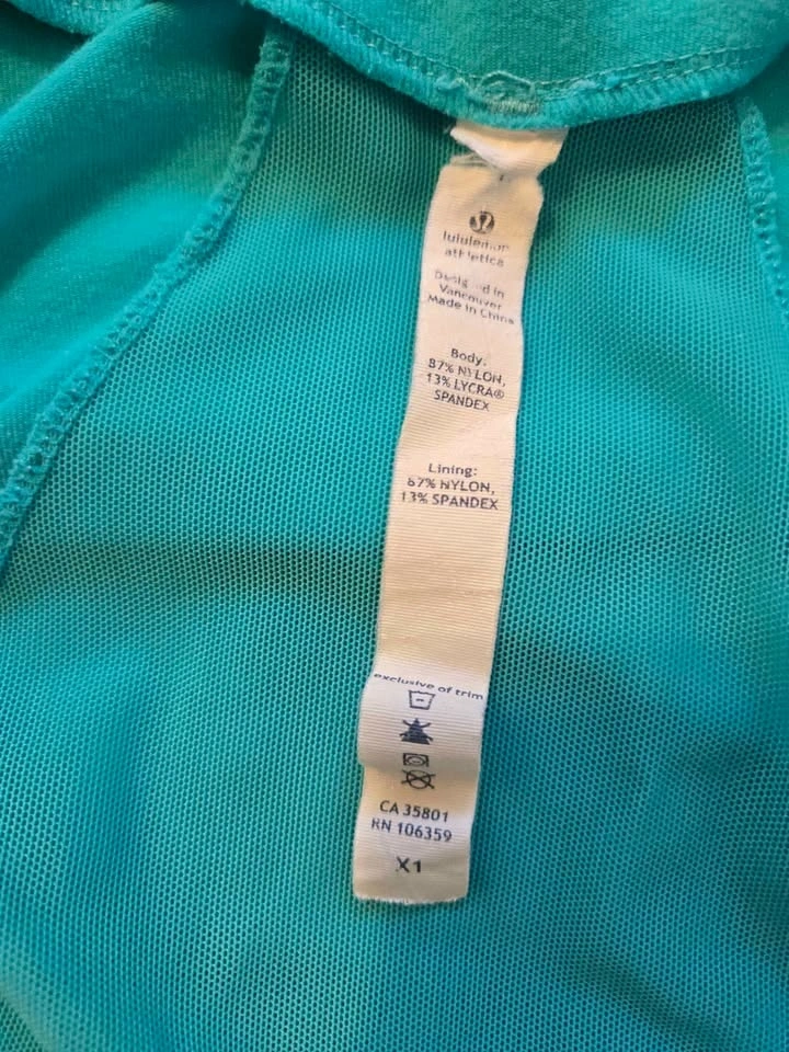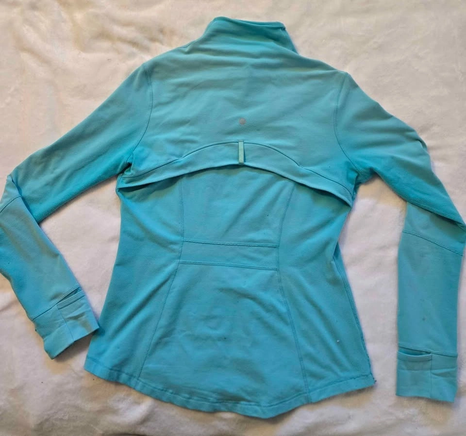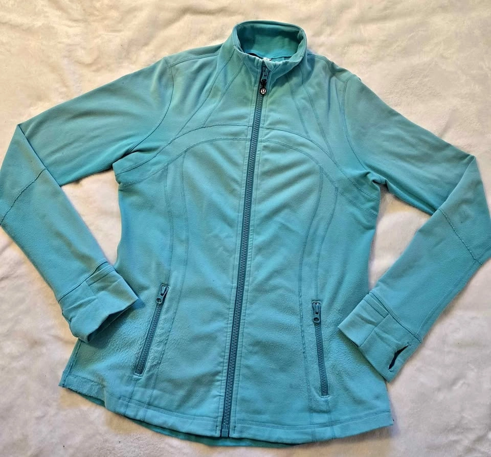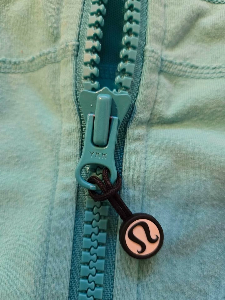 Lululemon full-zip jacket with zippered pockets. Thumb hole sleeves/cuffs. Nice turquoise colour.
