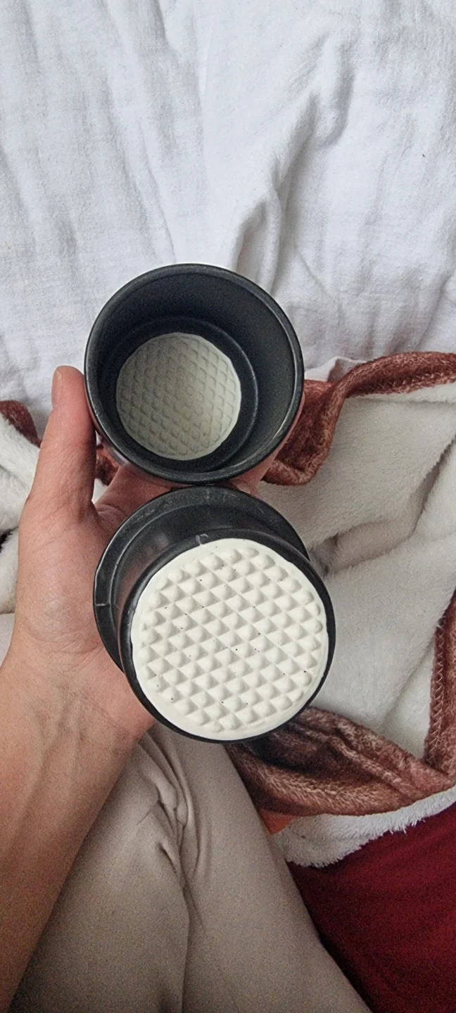 Features a top storage compartment and a coarse grinding pattern at the base.