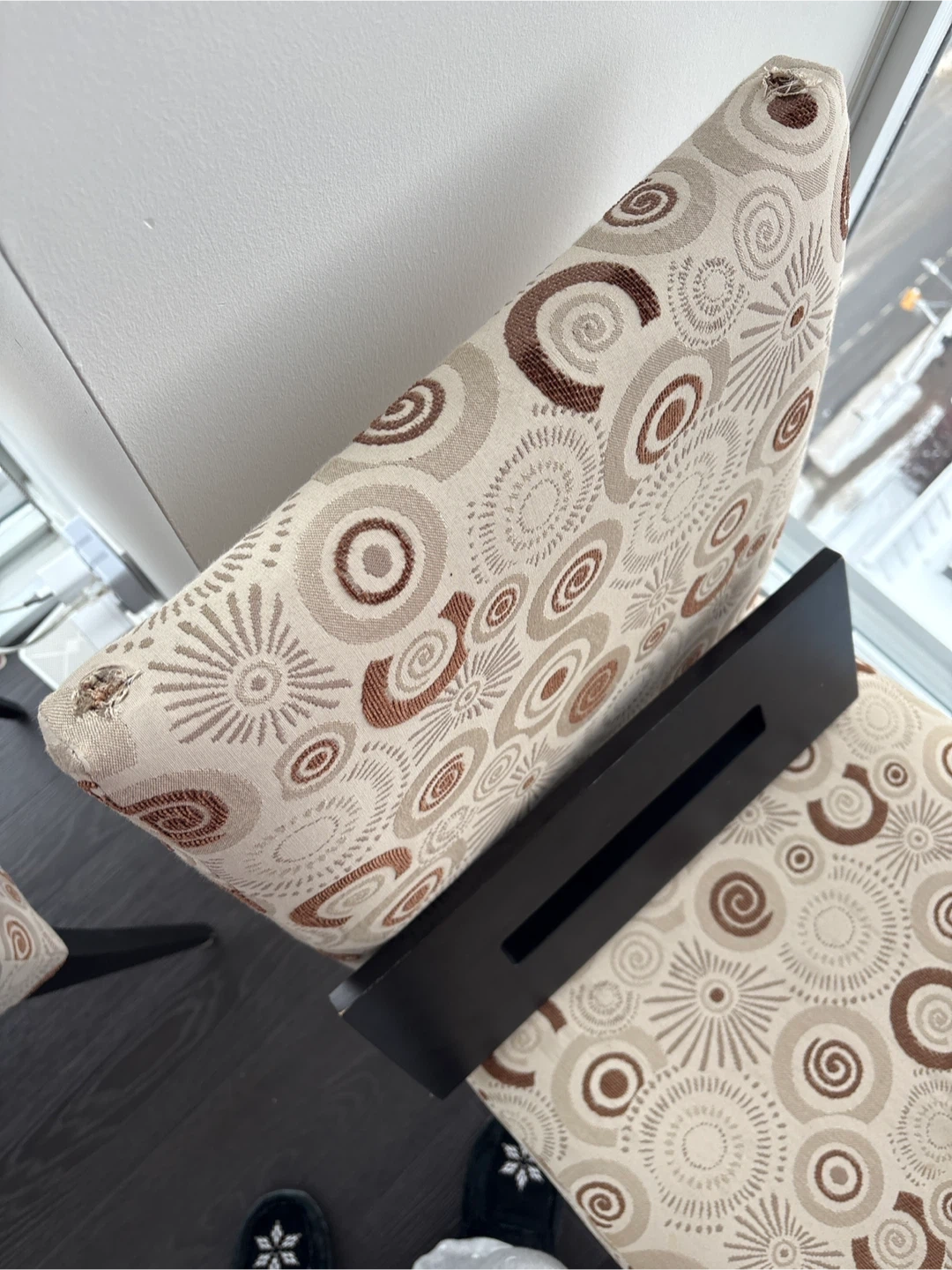 A dining chair with a unique patterned design. Please note that the wooden top part of the back is broken off. I think it can be fixed, but I haven’t looked into it. It’s also functional without that part. Small stain on the seat - see picture.