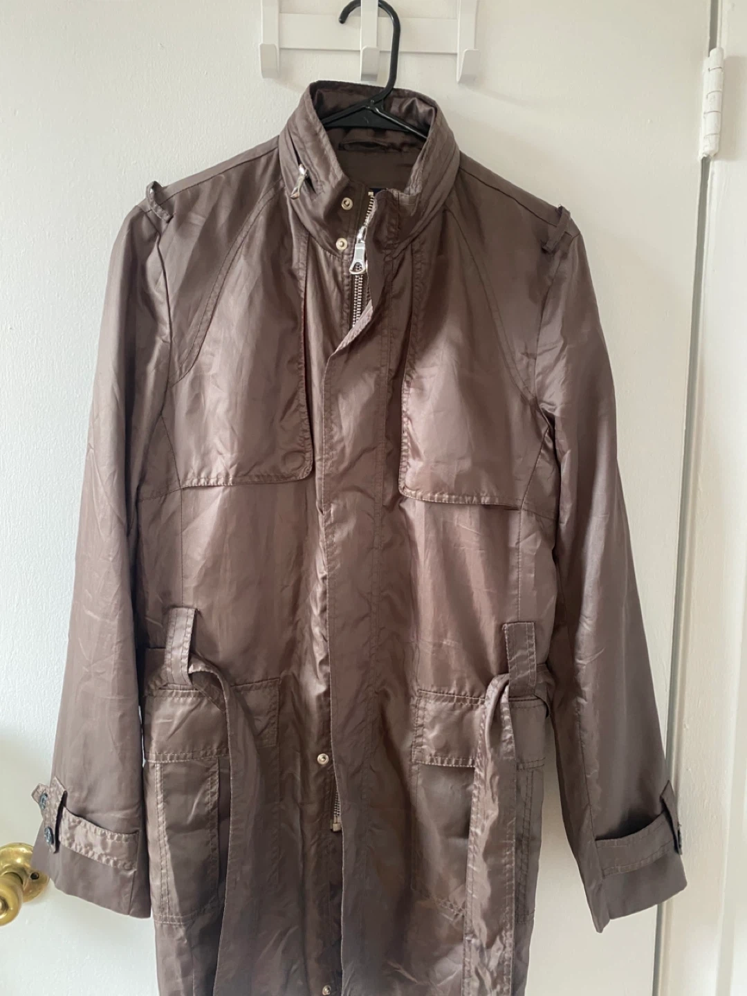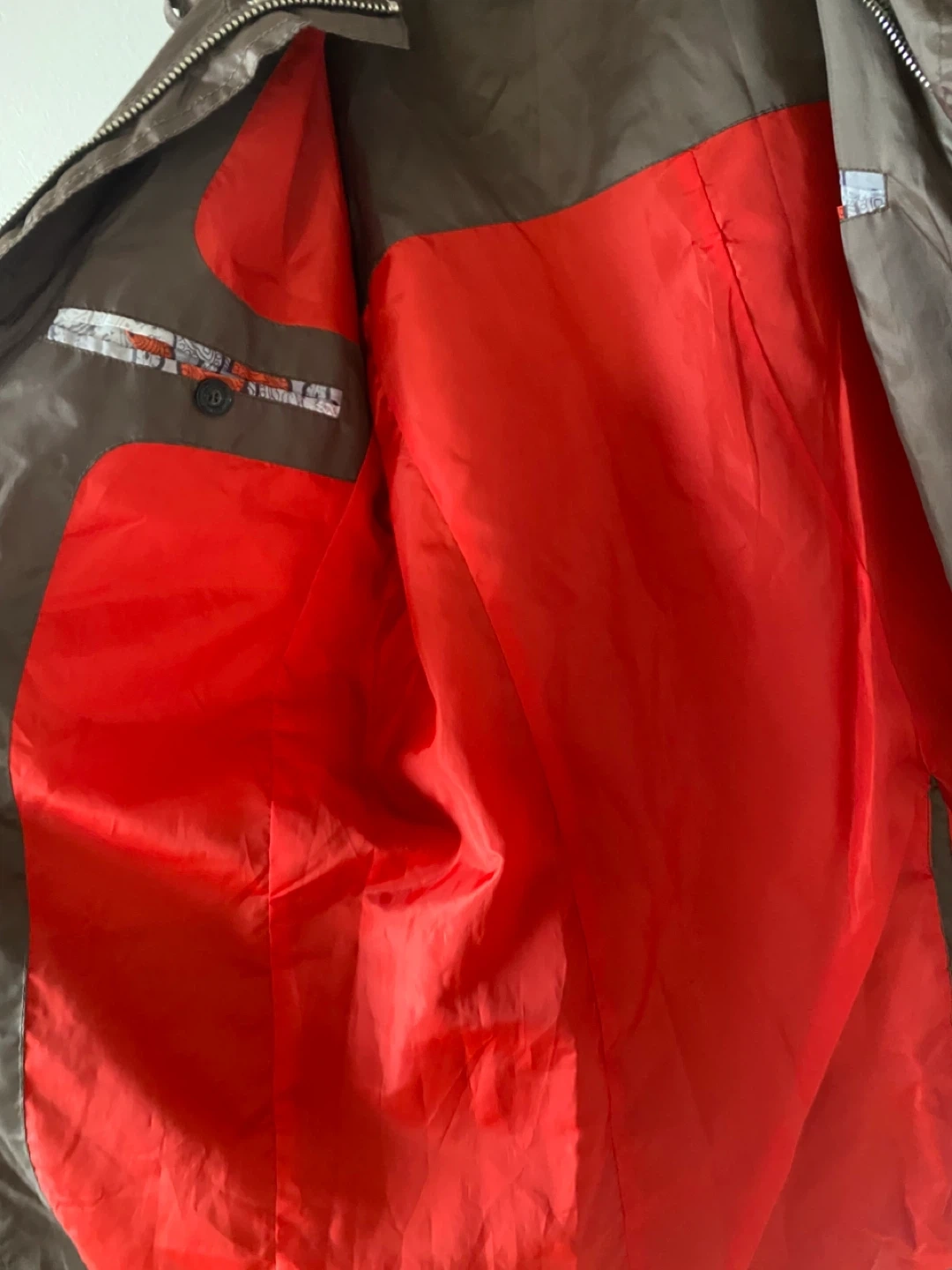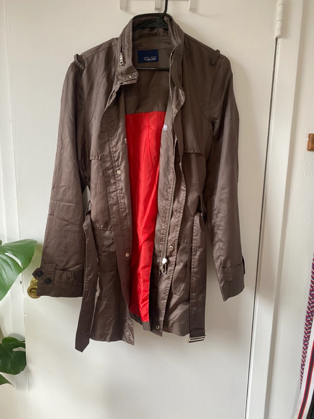 Selling a stylish Zara Man jacket in a unique brown color. It features a red lining and a belted waist. Perfect for adding a touch of sophistication to your wardrobe!